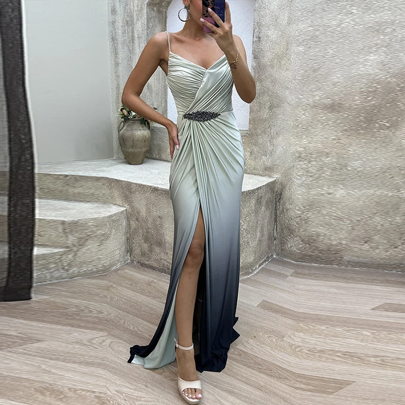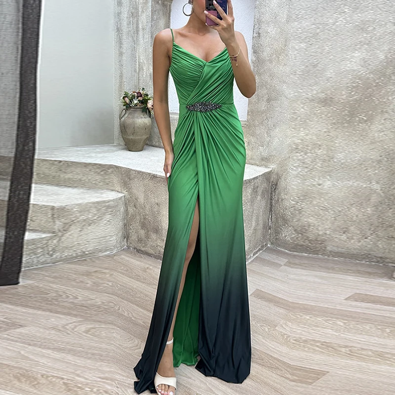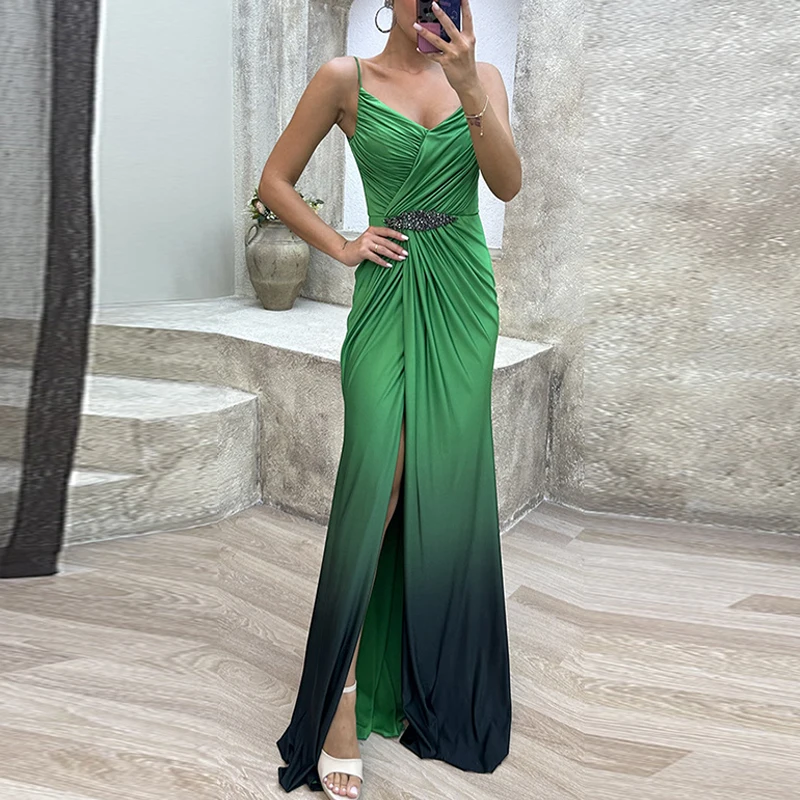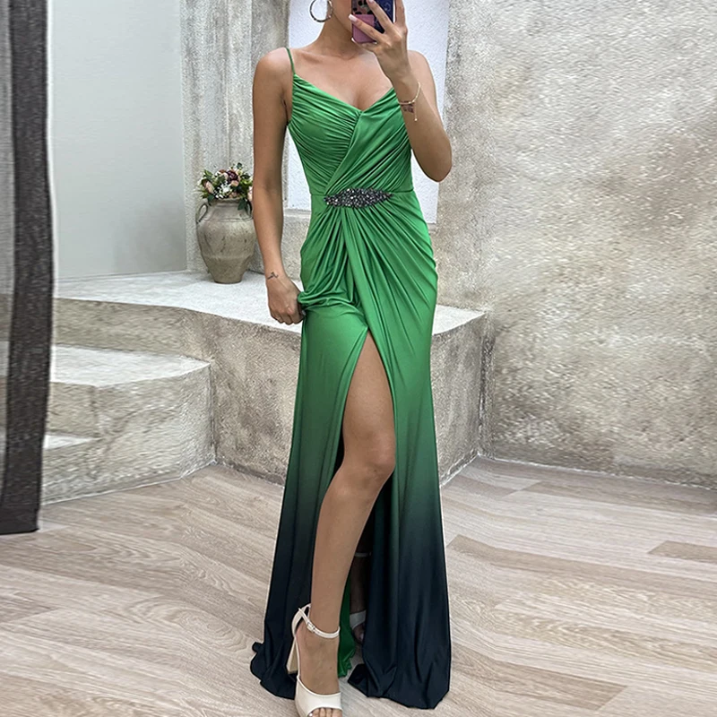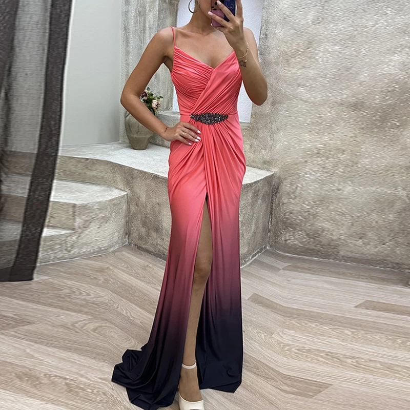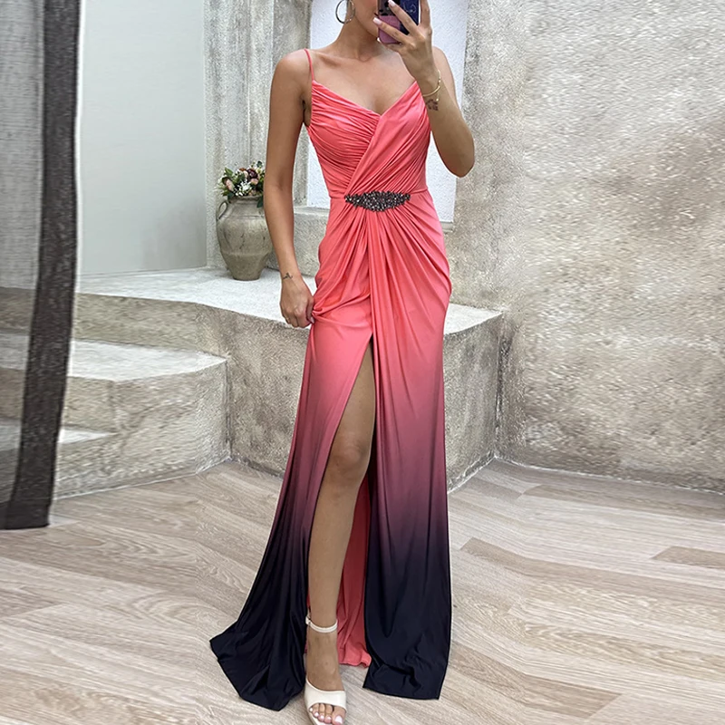 Advbridge Elegant Fashion Gradient High Split Dresses Lady Pleated Waisted Party Dresses Women Sexy Deep V-neck Sleeveless Evening Dress