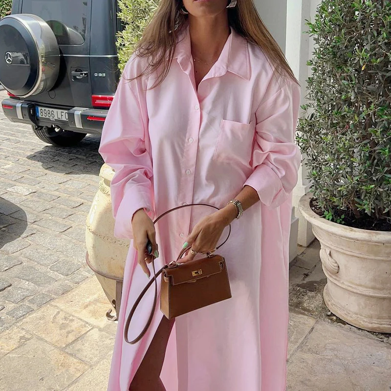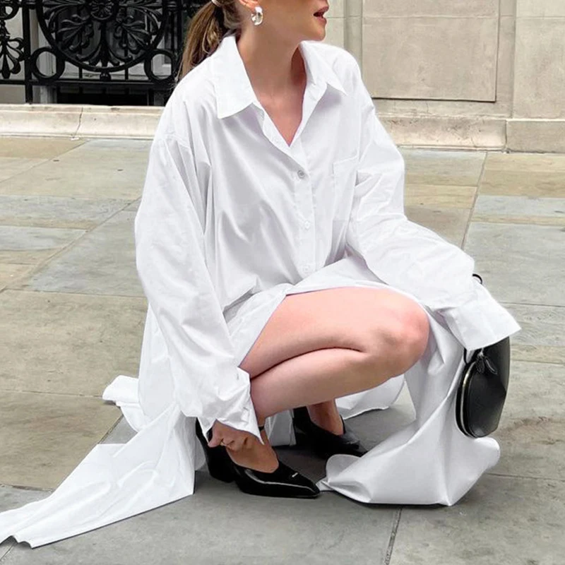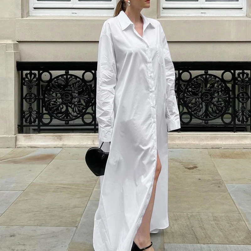 Advbridge - Elegant Lapel Collar Button Loose Long Dress Fashion Basic Cotton Split Party Dress Women Casual Long Sleeve Solid Shirts Dress