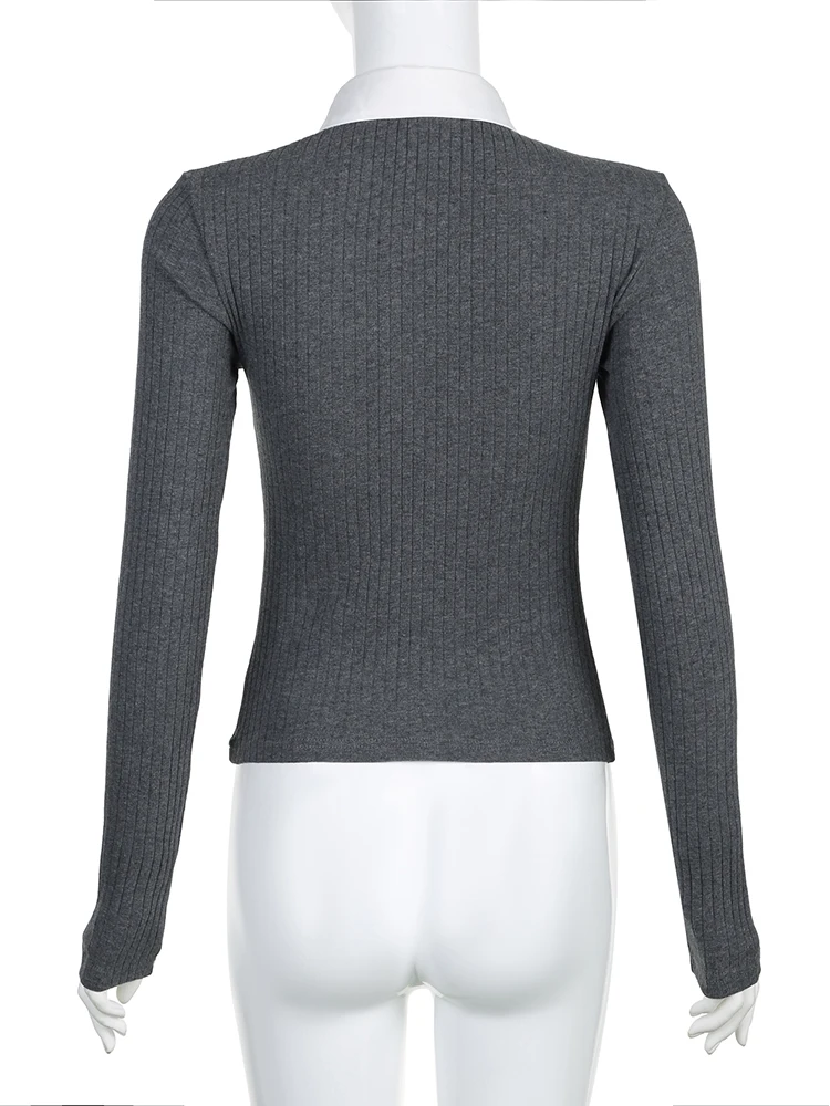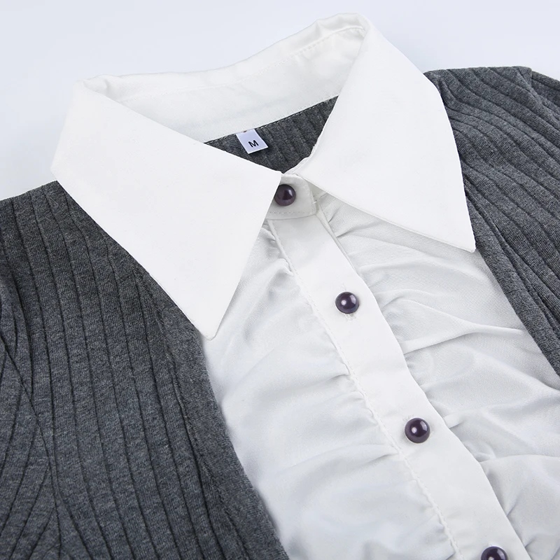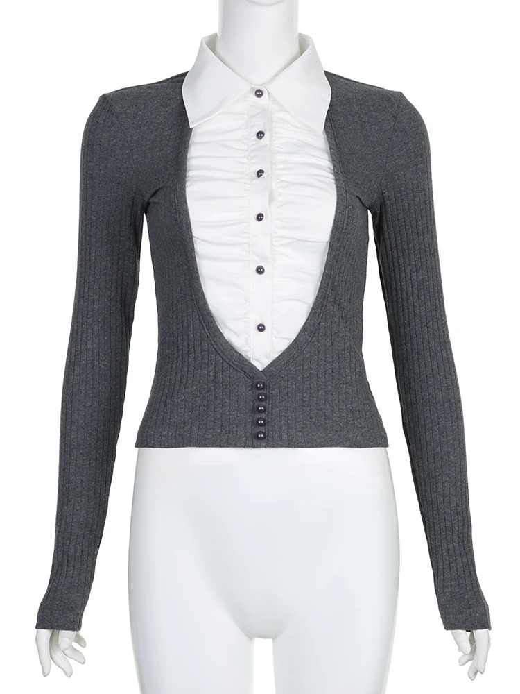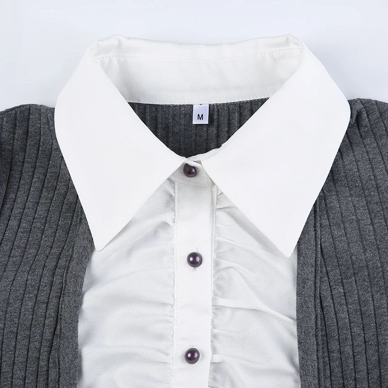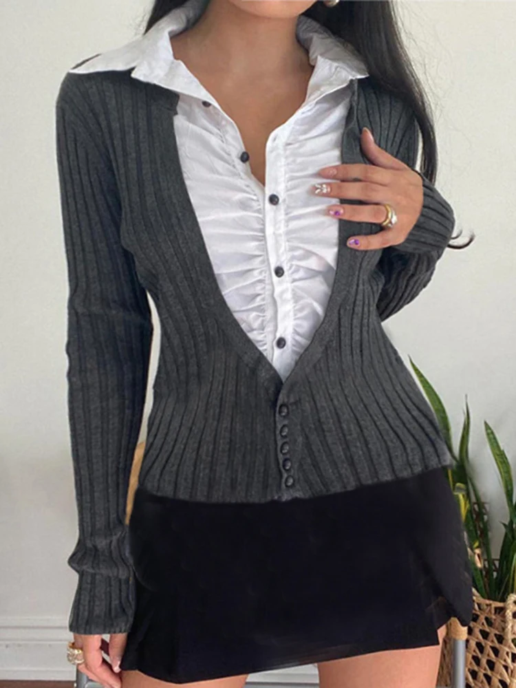 Advbridge Fake Two Piece Patchwork Ruffle Top Preppy Style Turn-down Collar Long Sleeve Shirt Y2k Streetwear Women Autumn Clothes