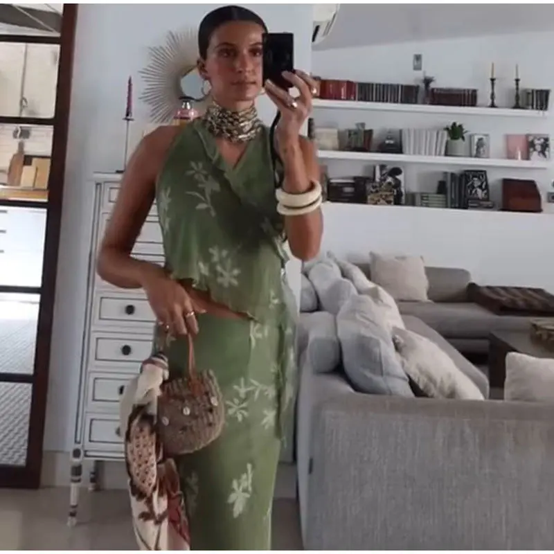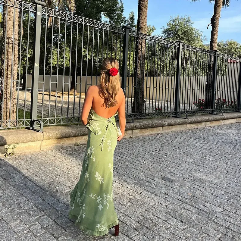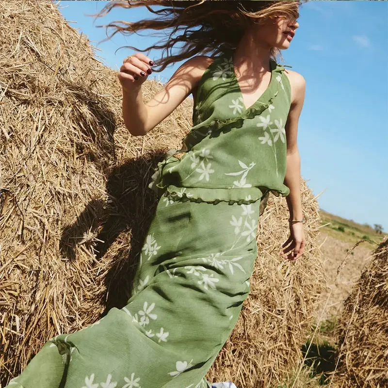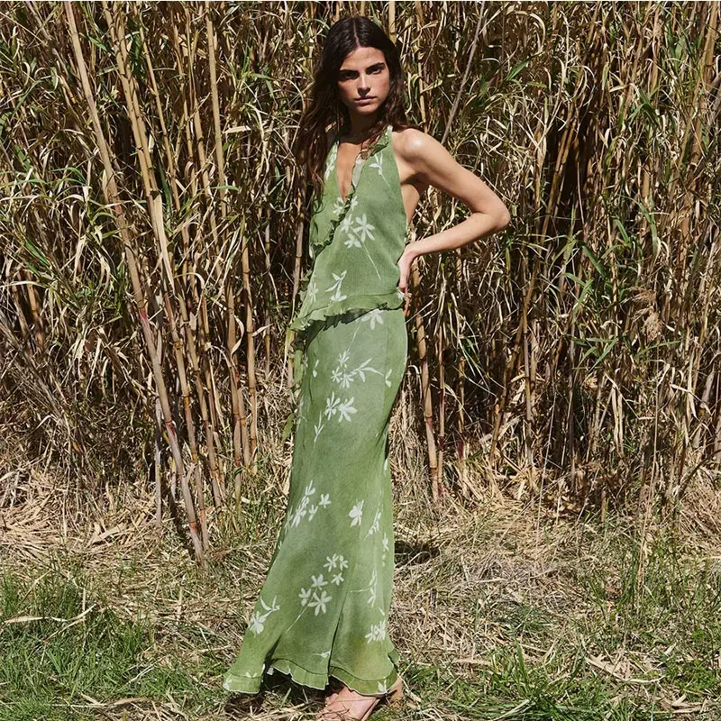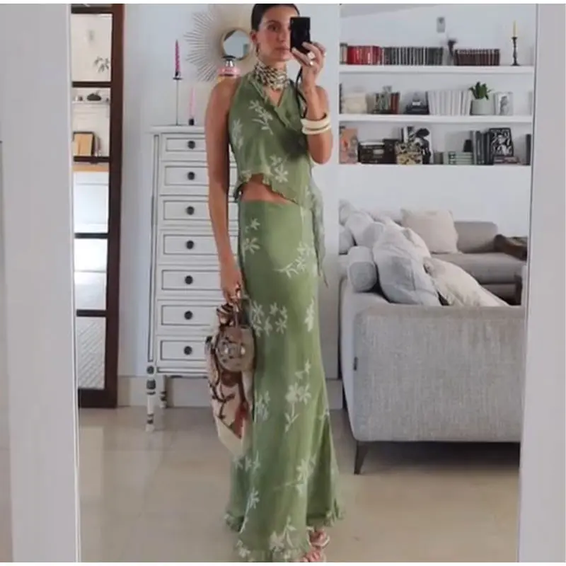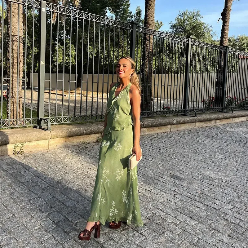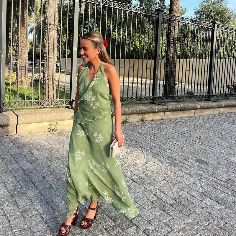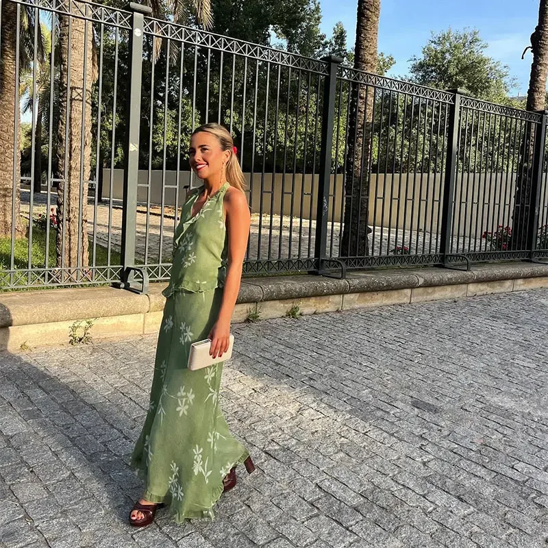 Advbridge Fashion Floral Printed Ruffles Half Skirt Set Women Sexy Backless V Neck Lace Up Halter Top Sets 2024 New Lady High Street Suits