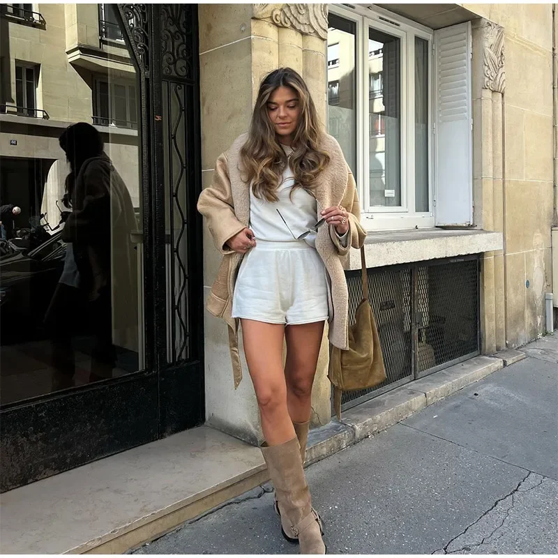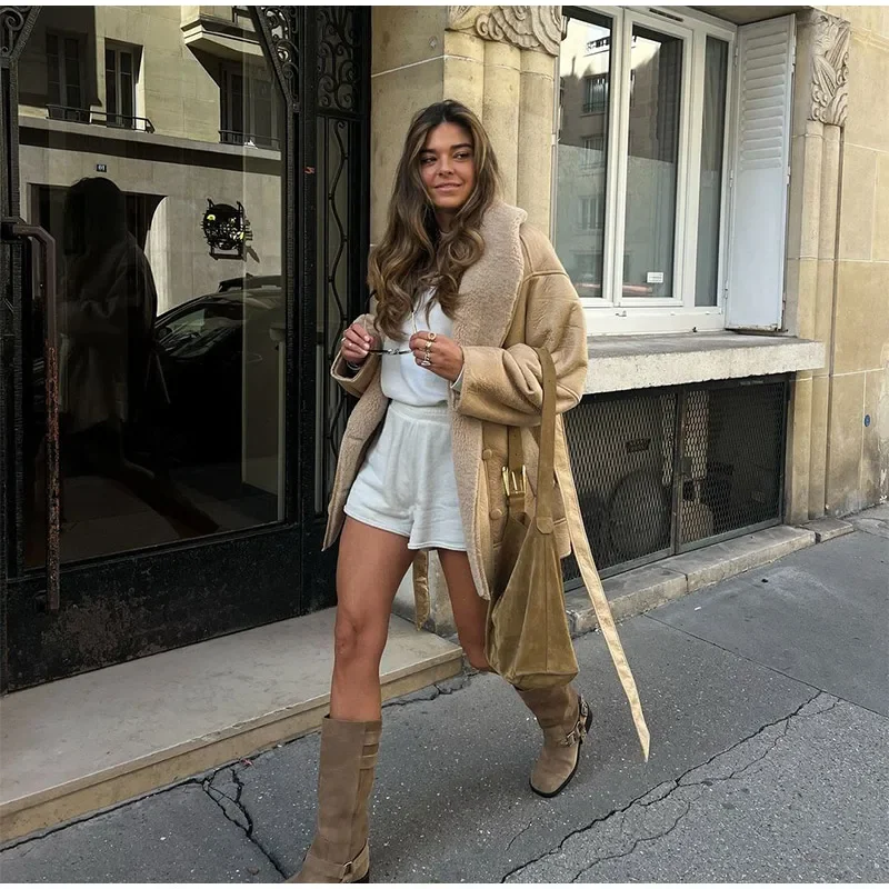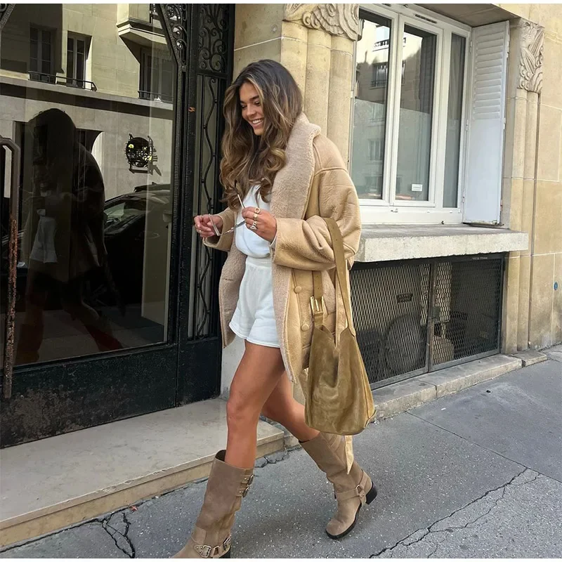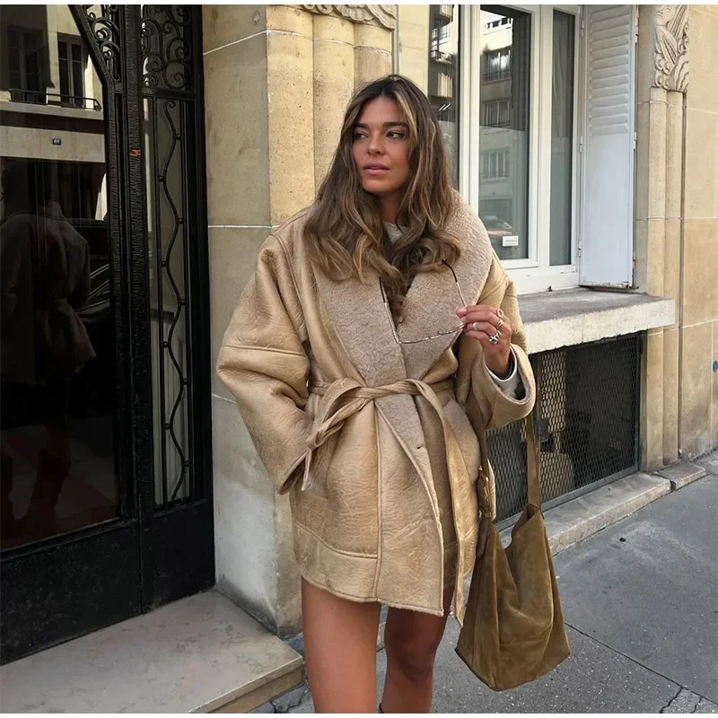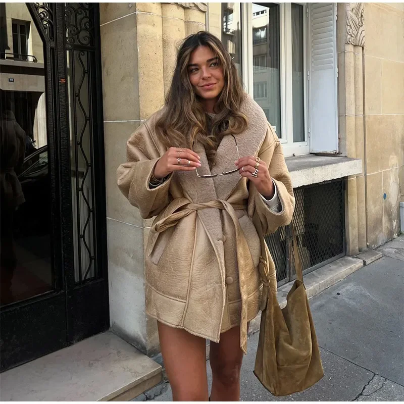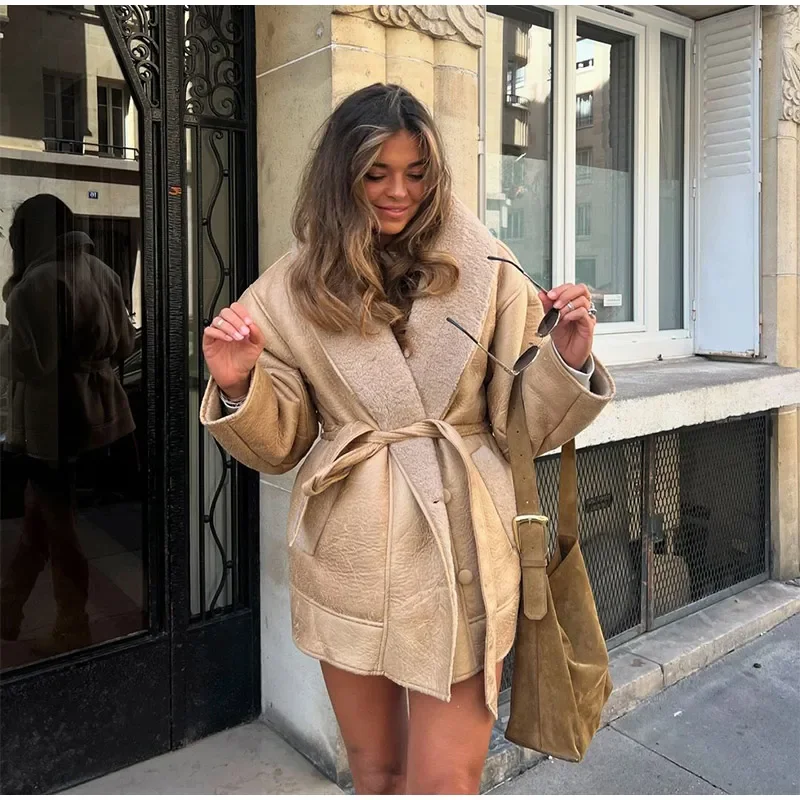 Advbridge Fashion Lambs Wool Women's Jacket With Belt Pocket Color Blocked Long Sleeved Casual Coat 2024 Winter Lady High Street Outerwear