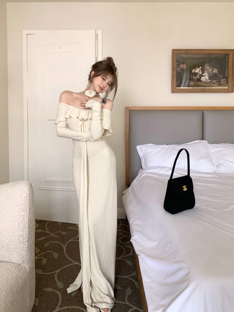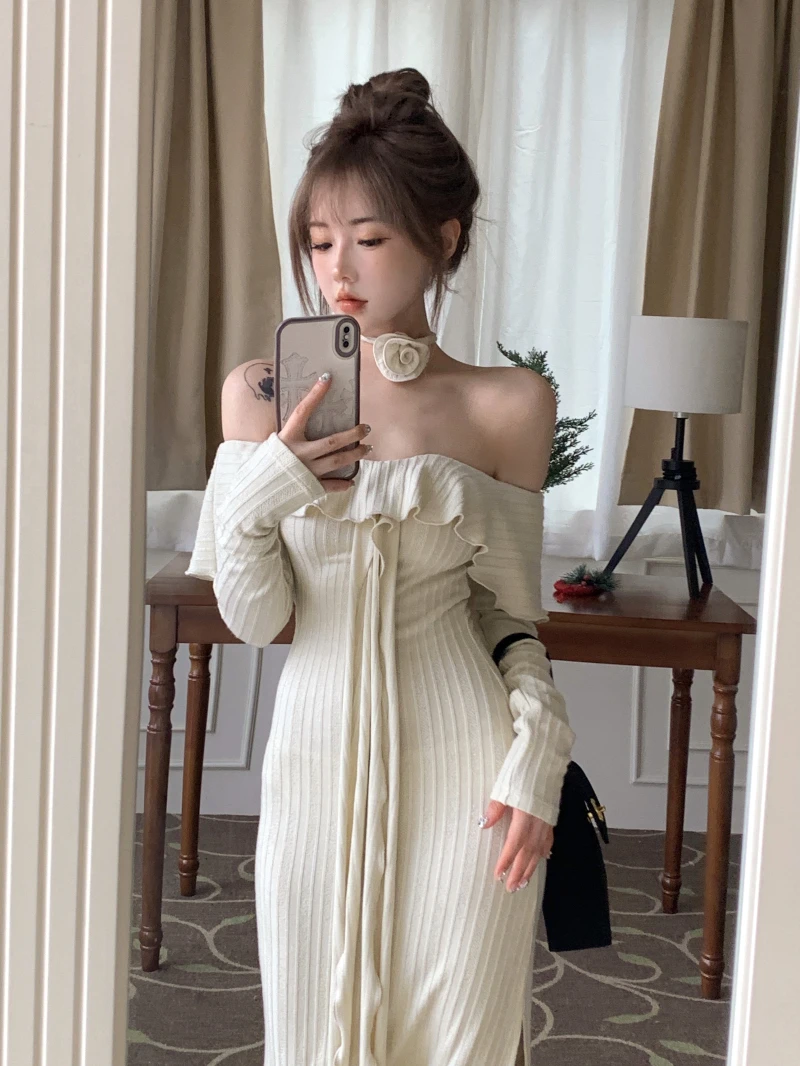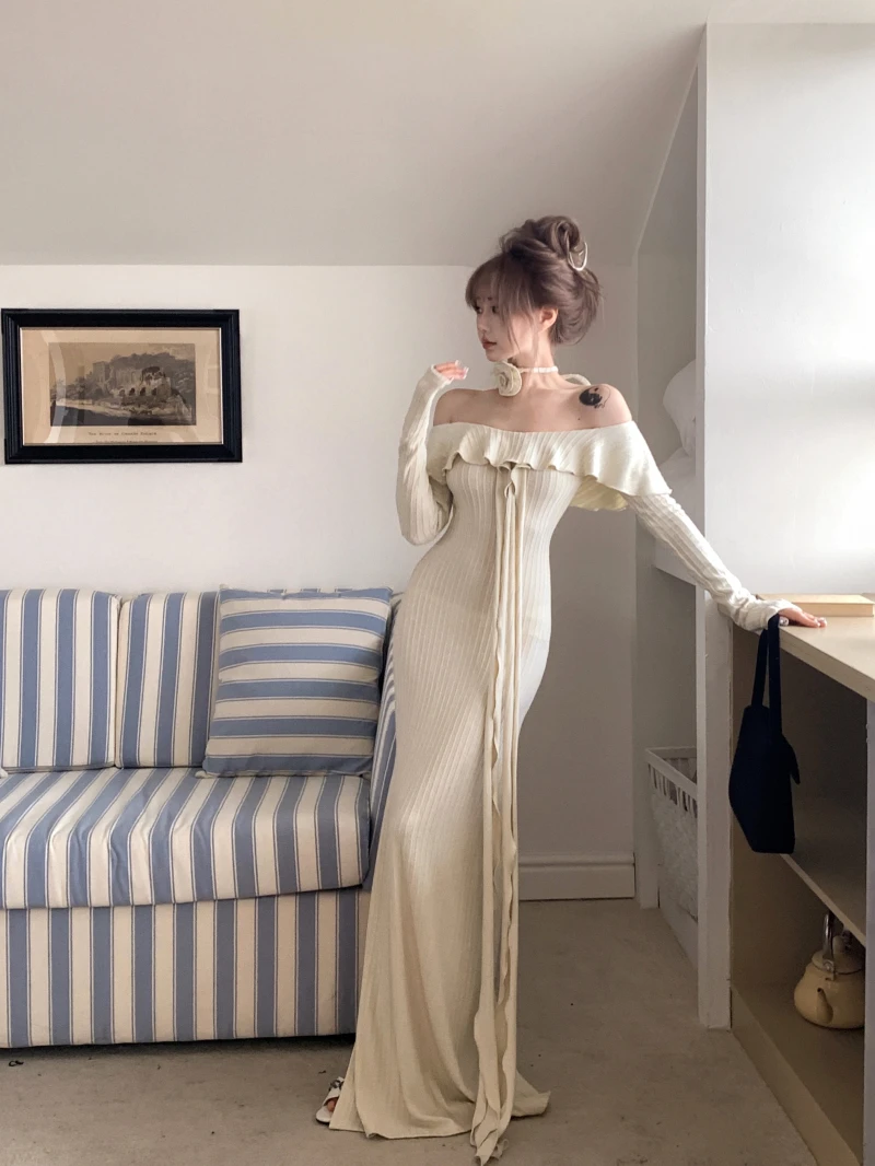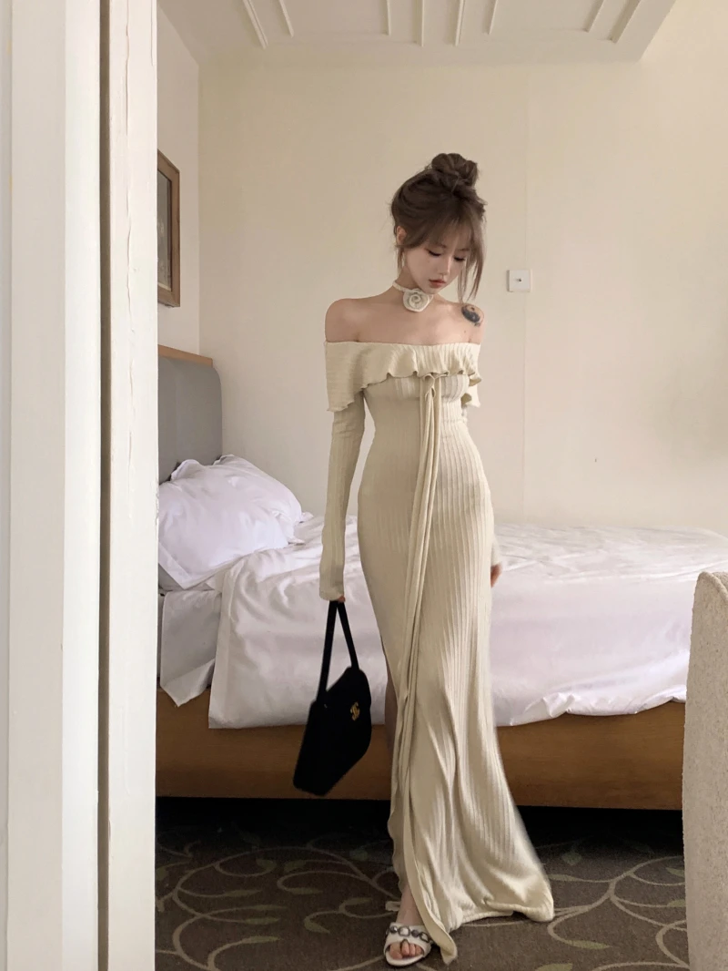 Advbridge - French Sweet Hot Girl Ruffle Off Shoulder Dress Women's Winter Slim Fit Long-sleeved Wrap Hip Dress Fashion Female Clothes