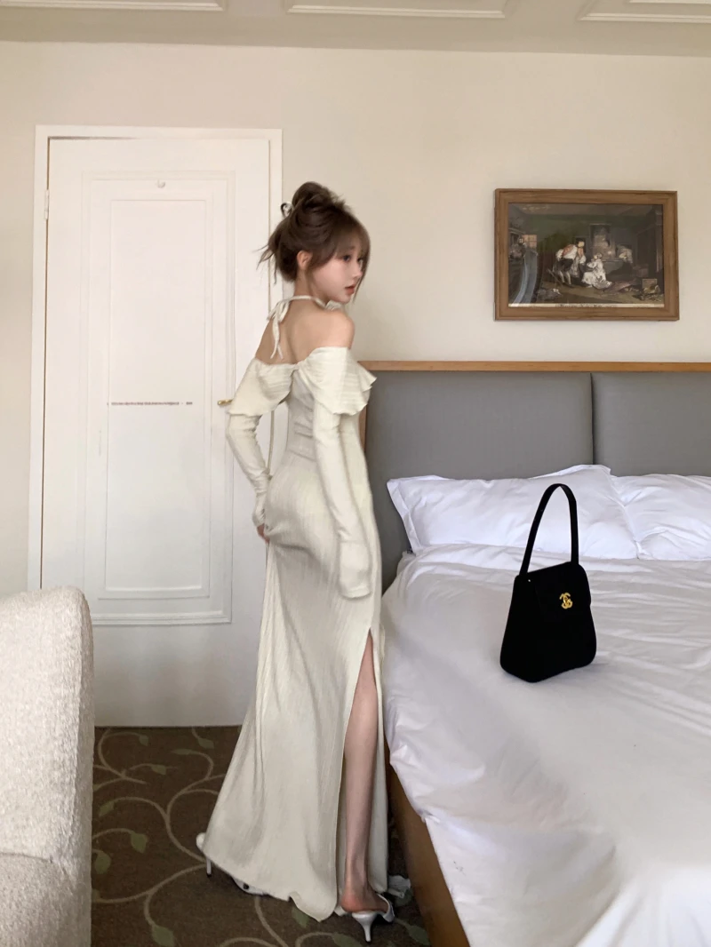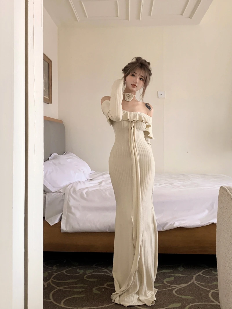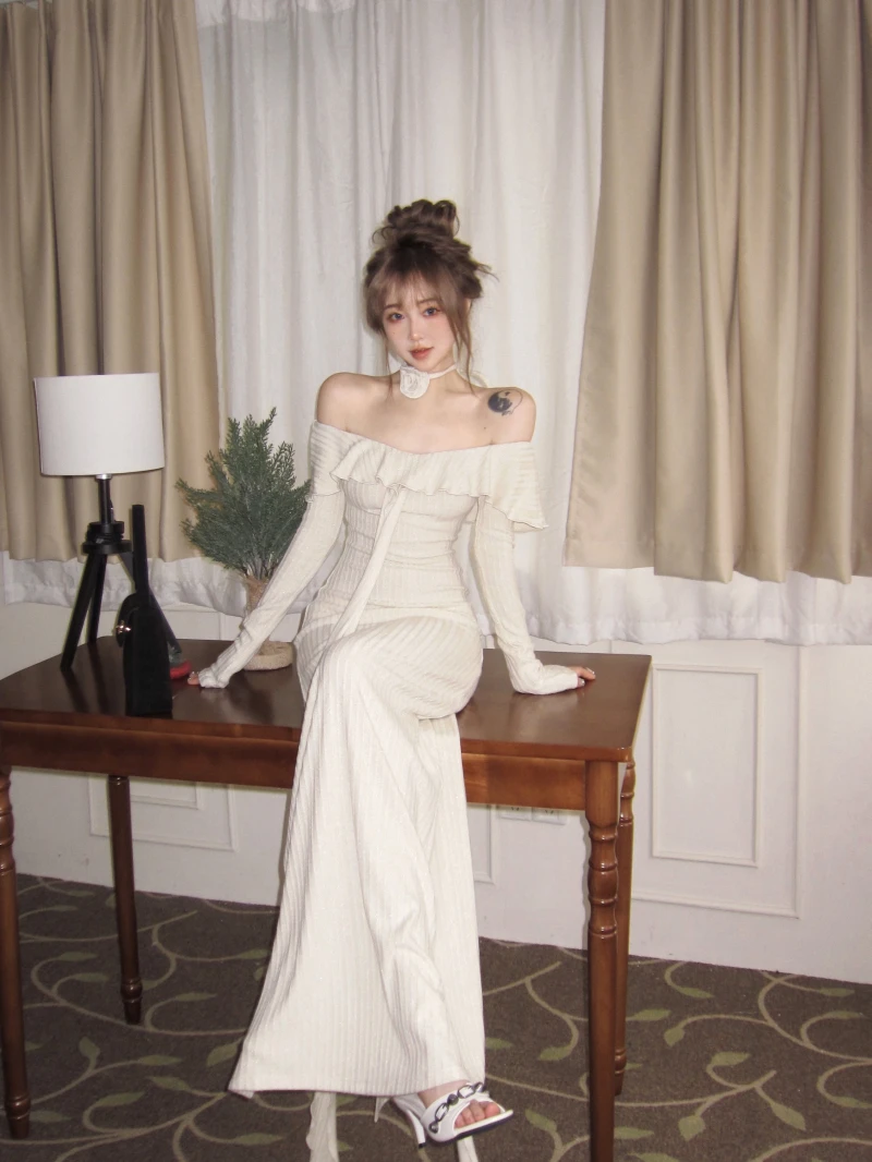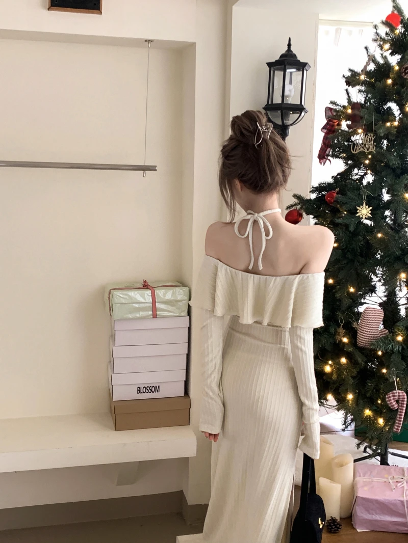 Advbridge - French Sweet Hot Girl Ruffle Off Shoulder Dress Women's Winter Slim Fit Long-sleeved Wrap Hip Dress Fashion Female Clothes