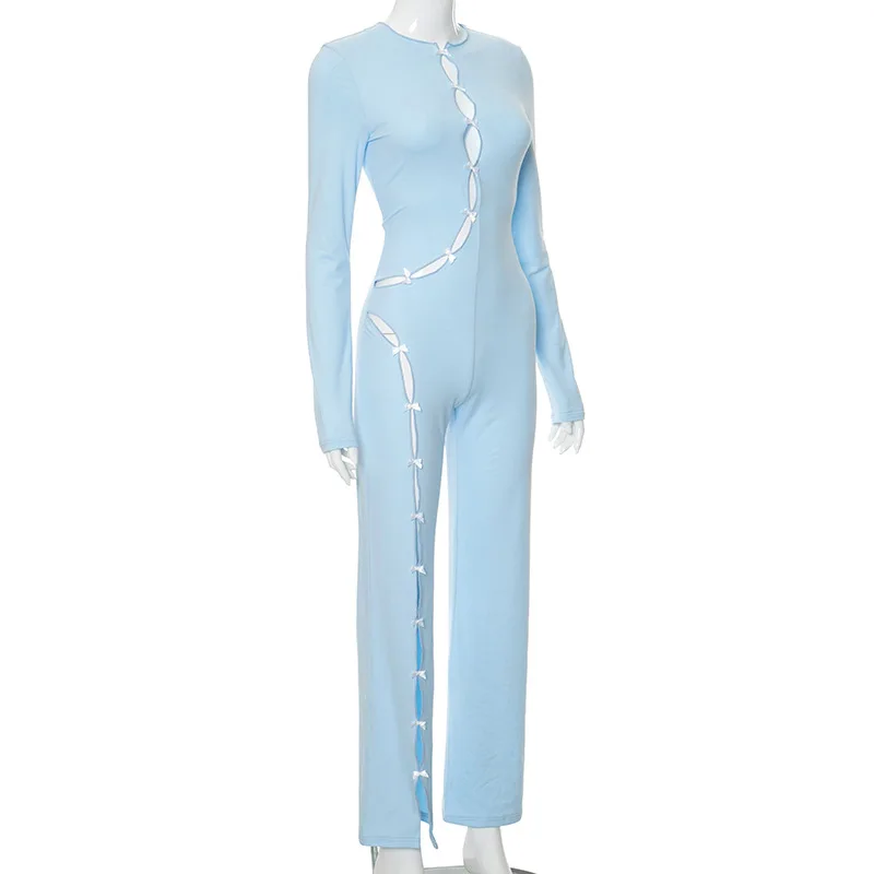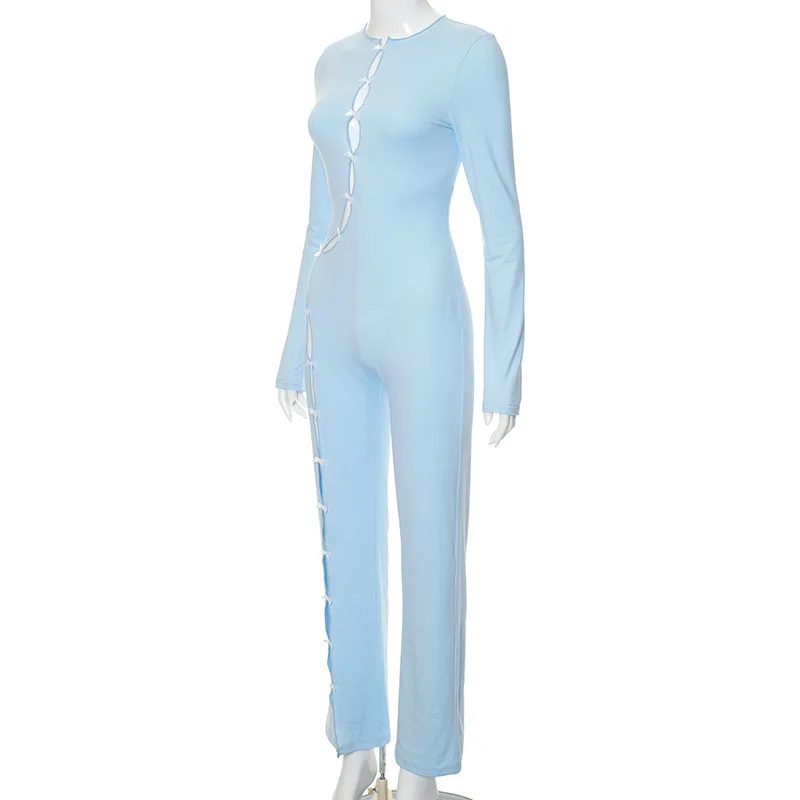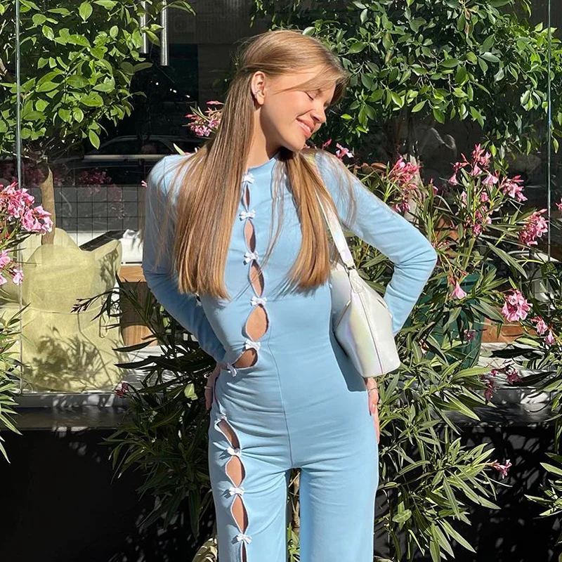 Advbridge Jumpsuits For Women Hollow Out Bow Lace Up Bodycon One Piece Femme Solids Long Sleeve Slim Jump Suit Womens Overalls 2024