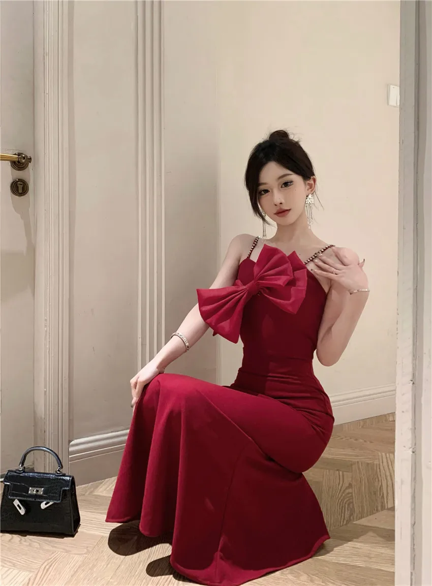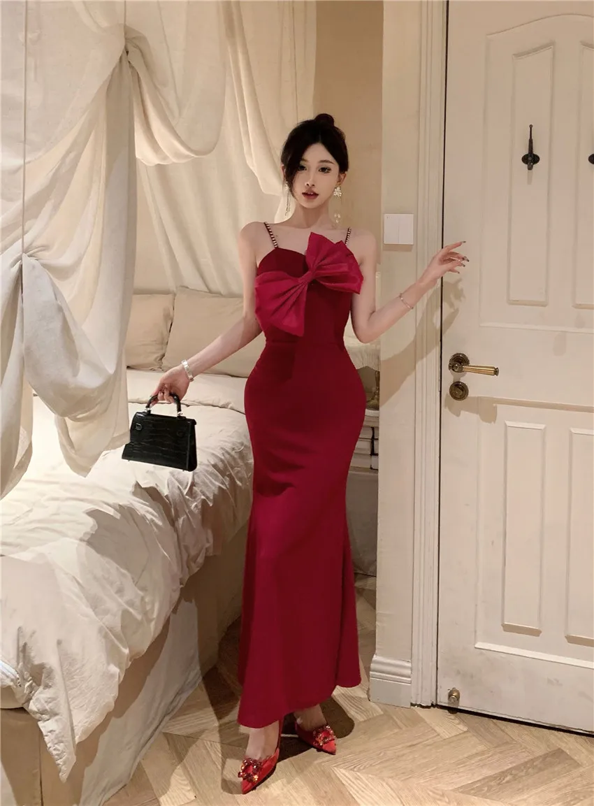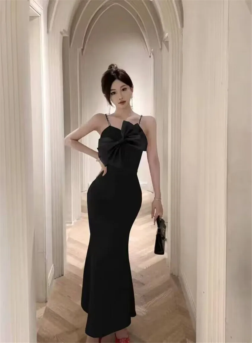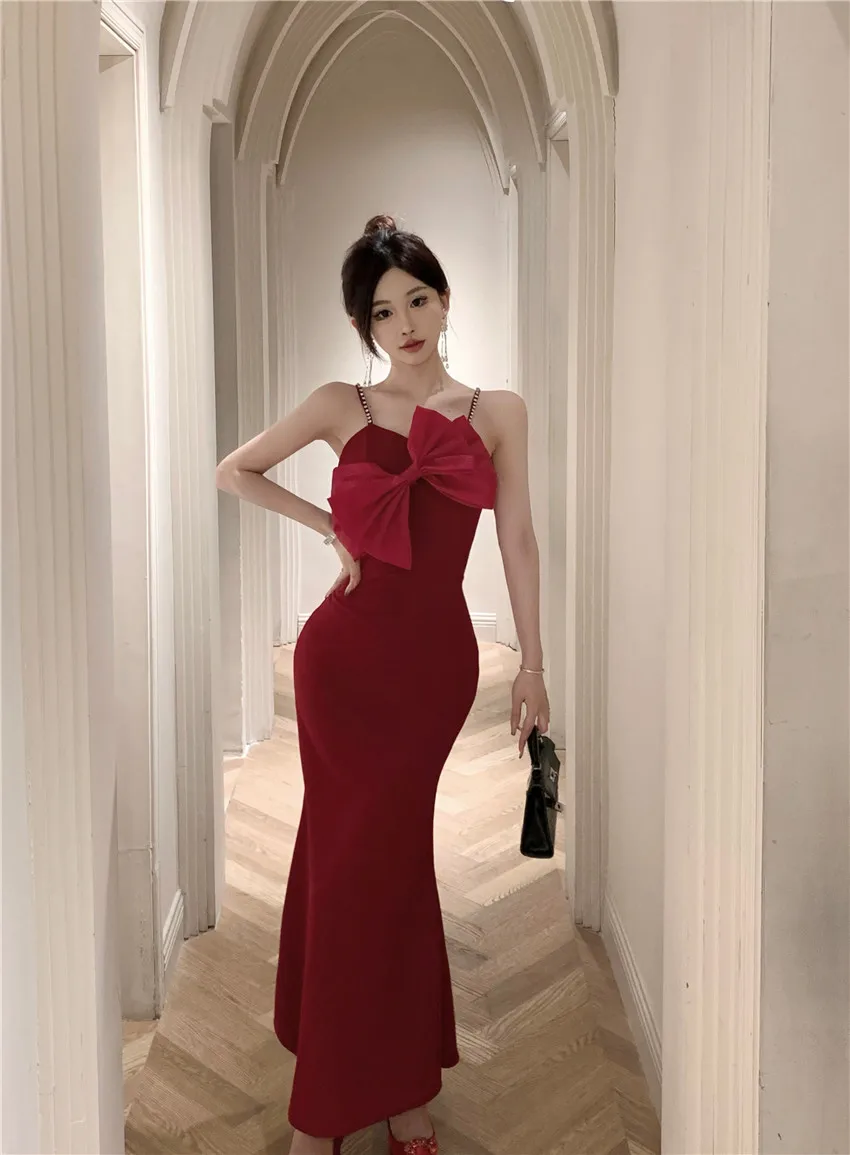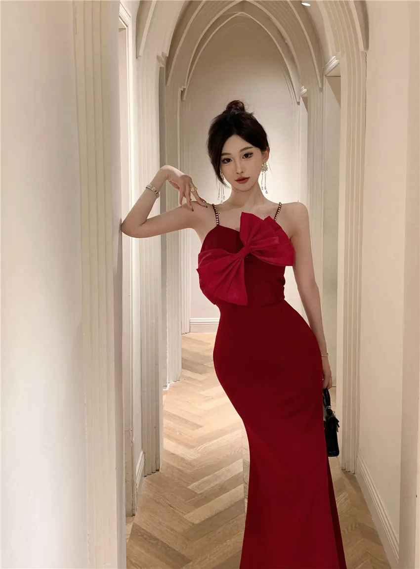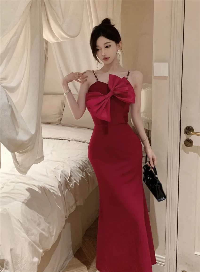 Advbridge - Korean Sweet Hot Girl Elegant 3D Big Bow Strap Dress Women's Autumn Beading Slim Fit Long Mermaid Dress Fashion Female Clothes