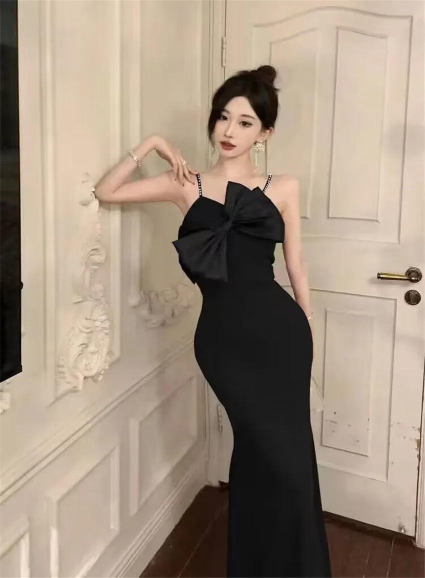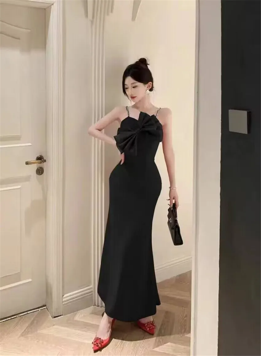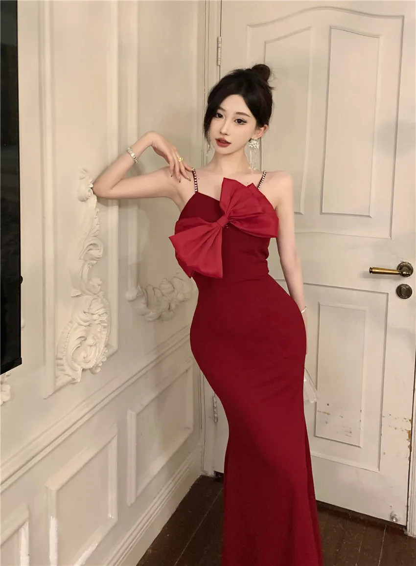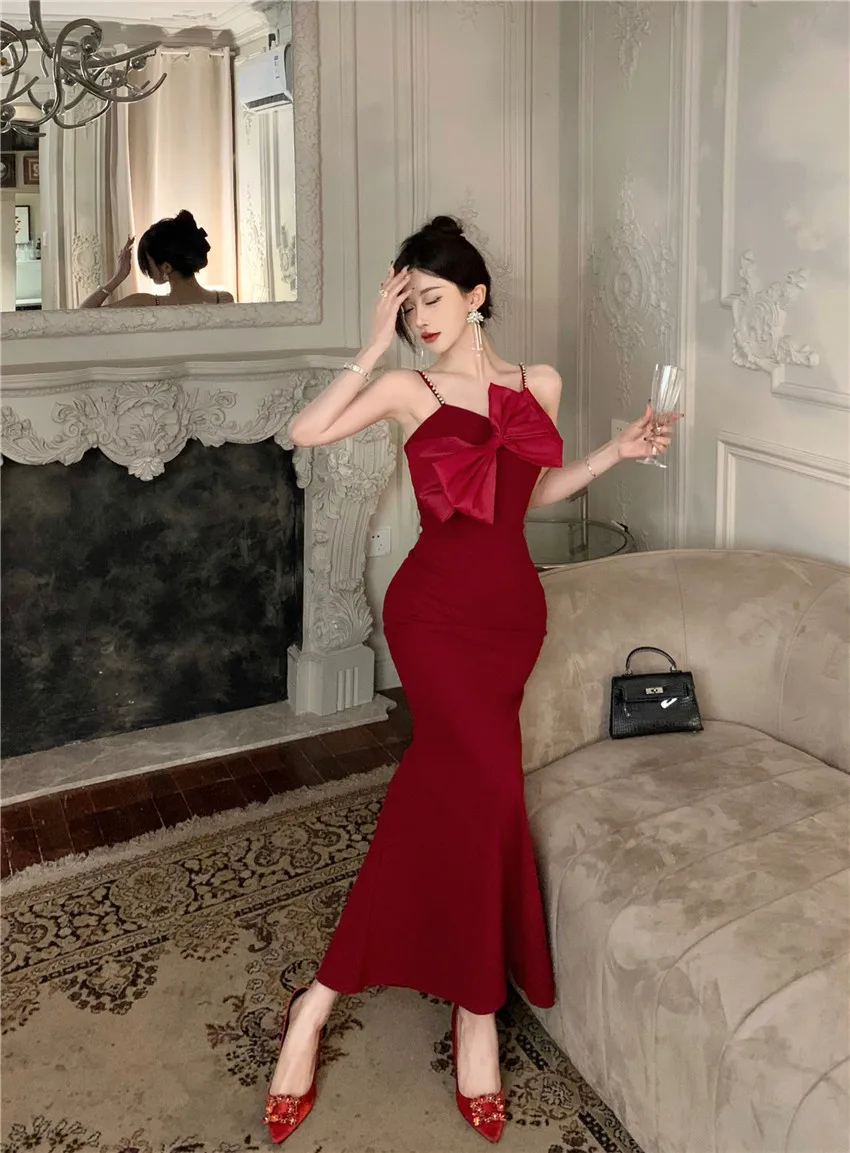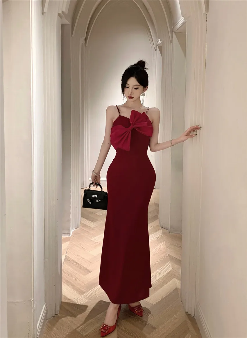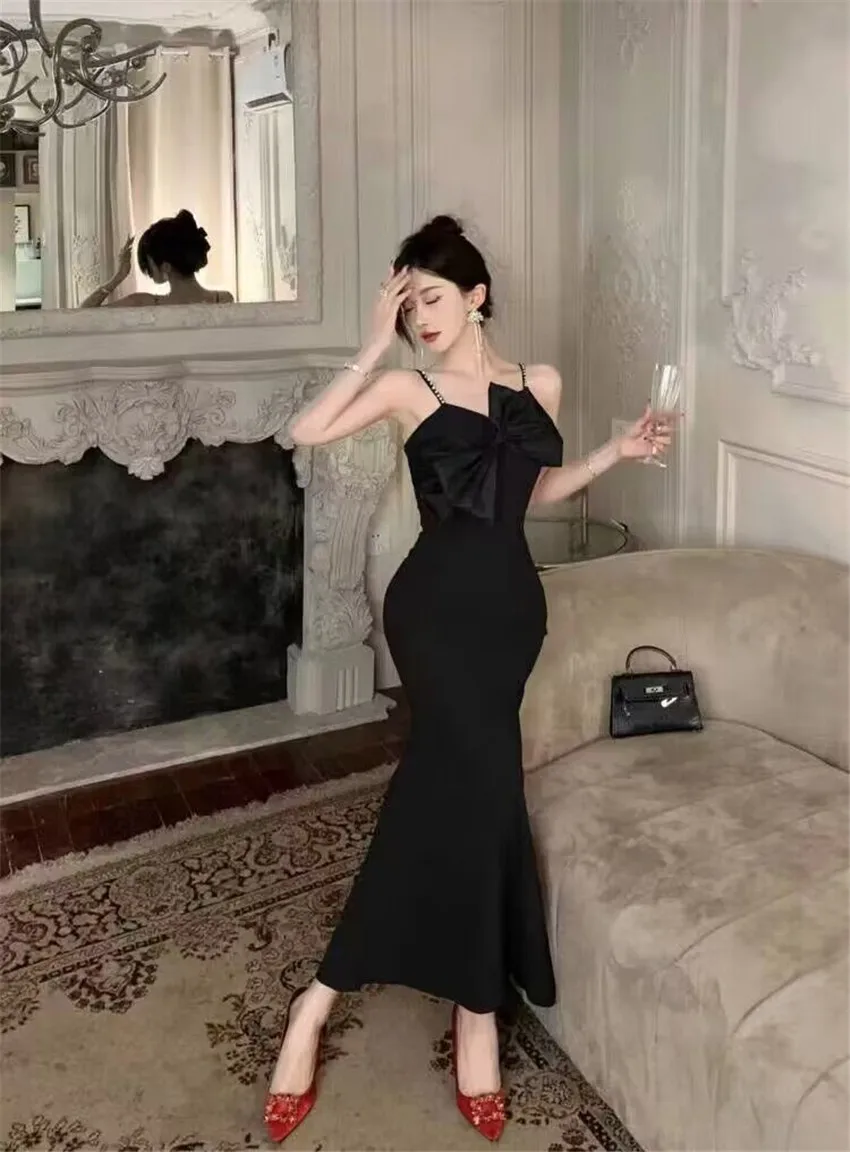 Advbridge - Korean Sweet Hot Girl Elegant 3D Big Bow Strap Dress Women's Autumn Beading Slim Fit Long Mermaid Dress Fashion Female Clothes