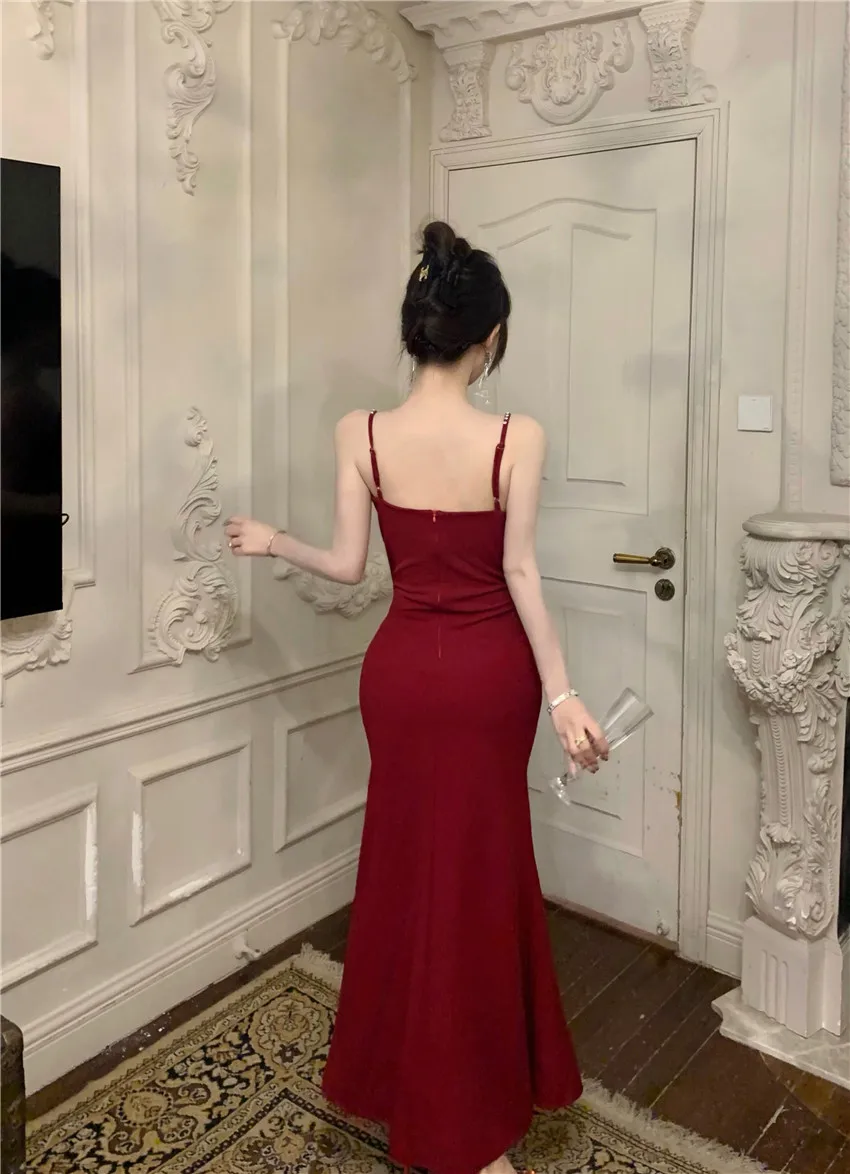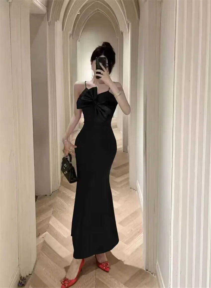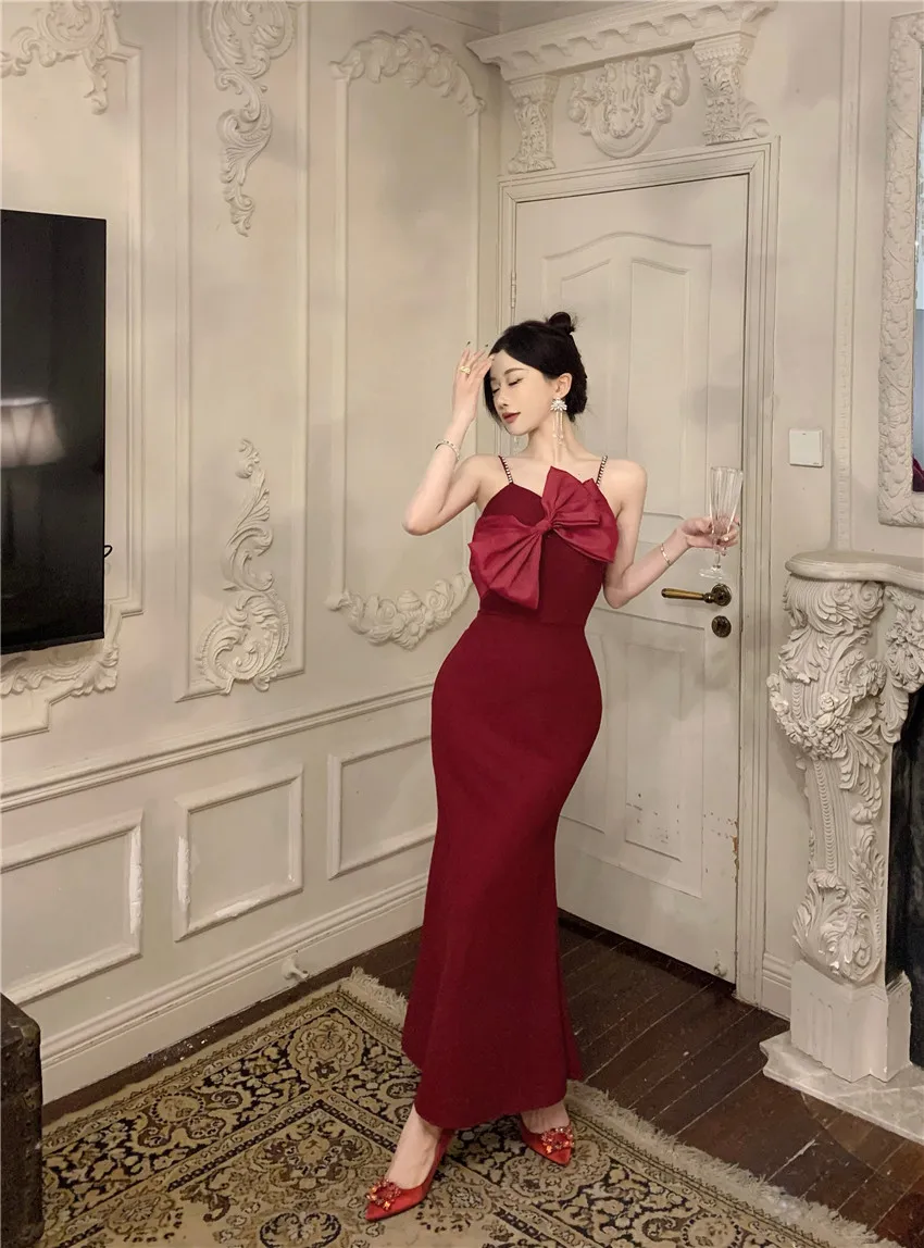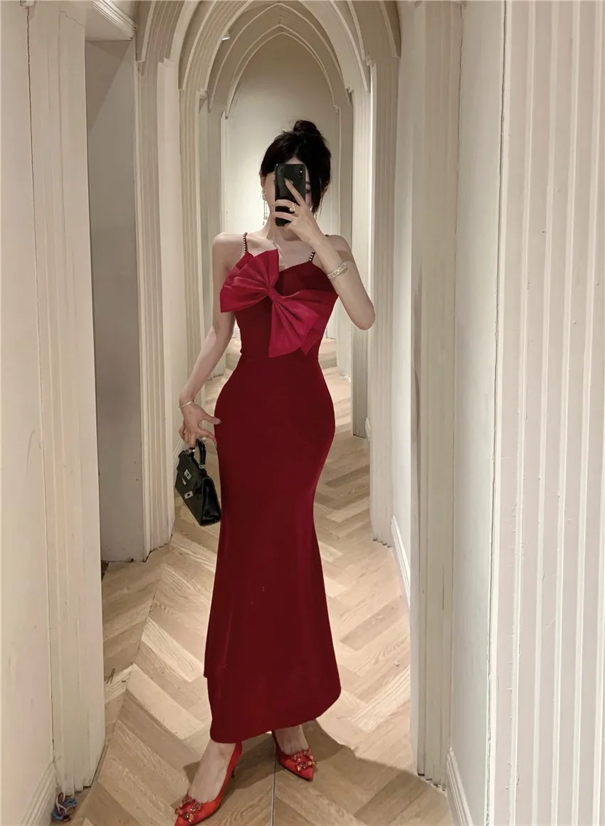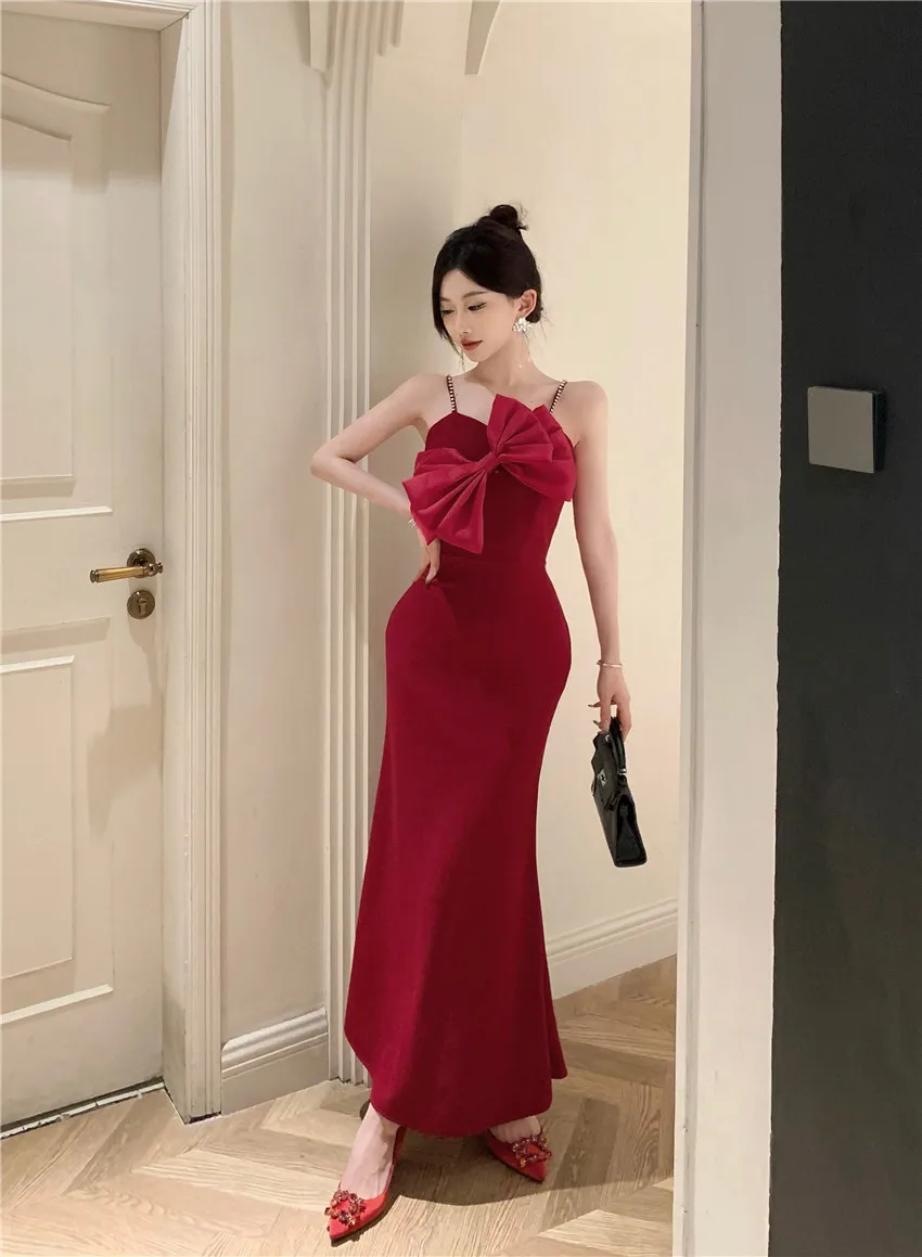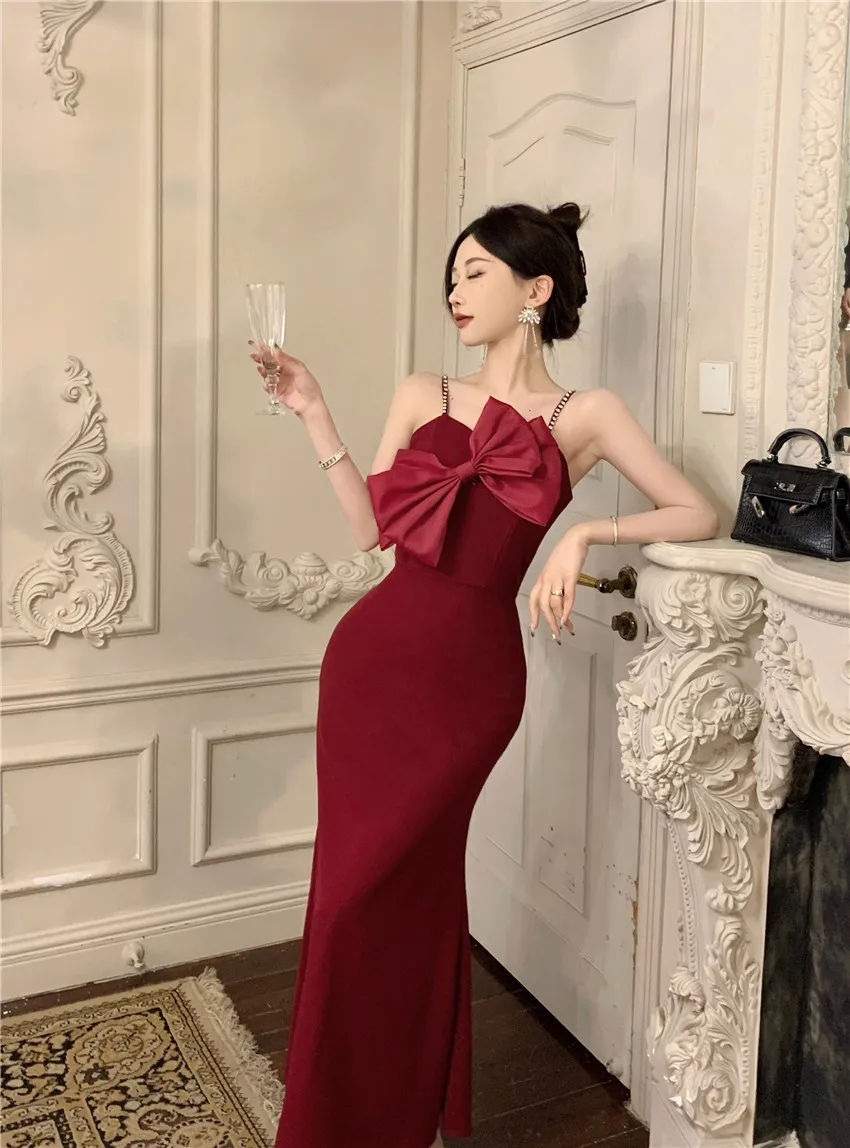 Advbridge - Korean Sweet Hot Girl Elegant 3D Big Bow Strap Dress Women's Autumn Beading Slim Fit Long Mermaid Dress Fashion Female Clothes