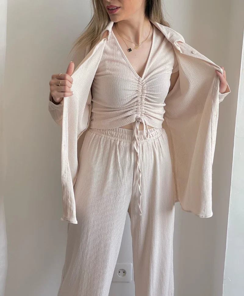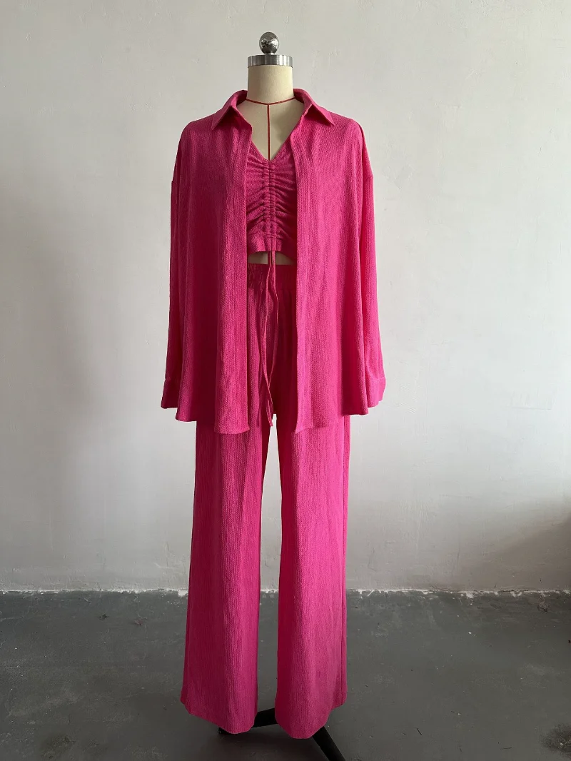 Advbridge Long Sleeve Shirt Drawstring Short Sleeve Three-Piece Set Tshirt Top Women Tshirt Wide Leg Pants Casual Trousers Suit