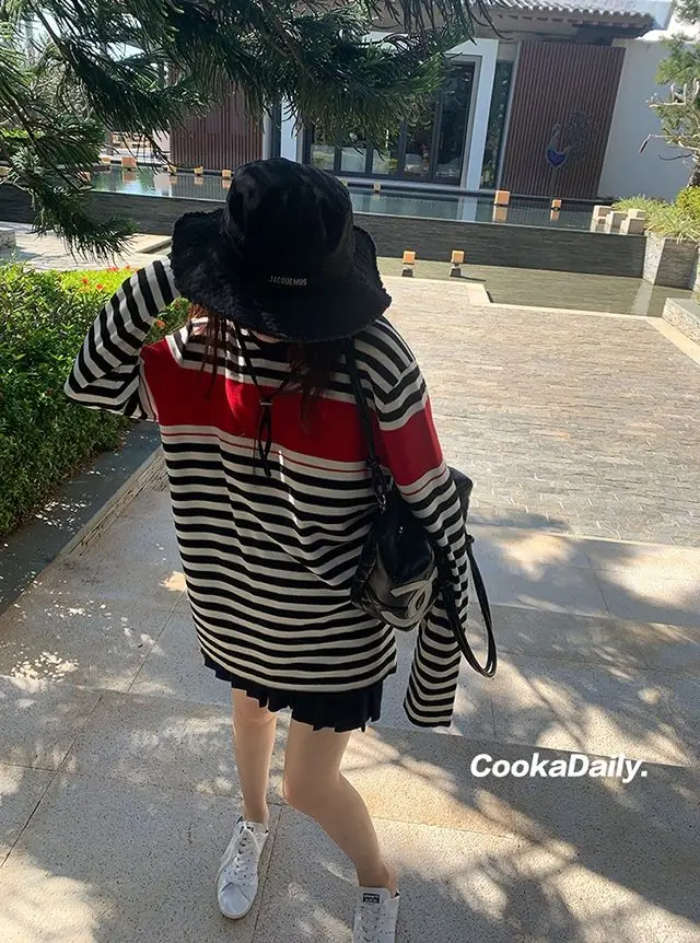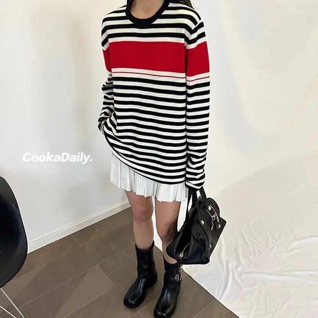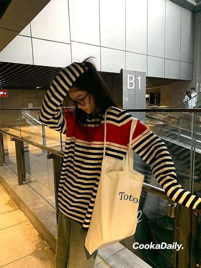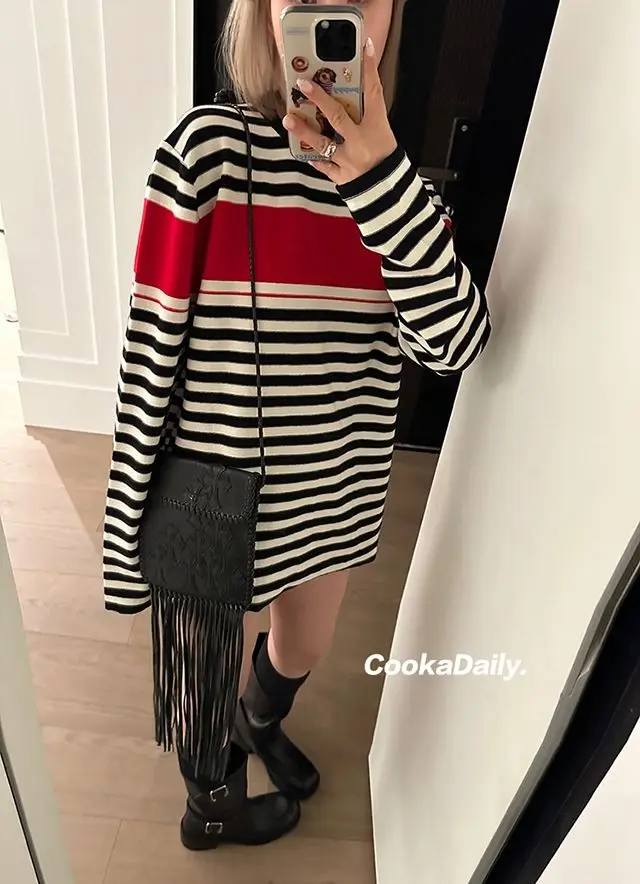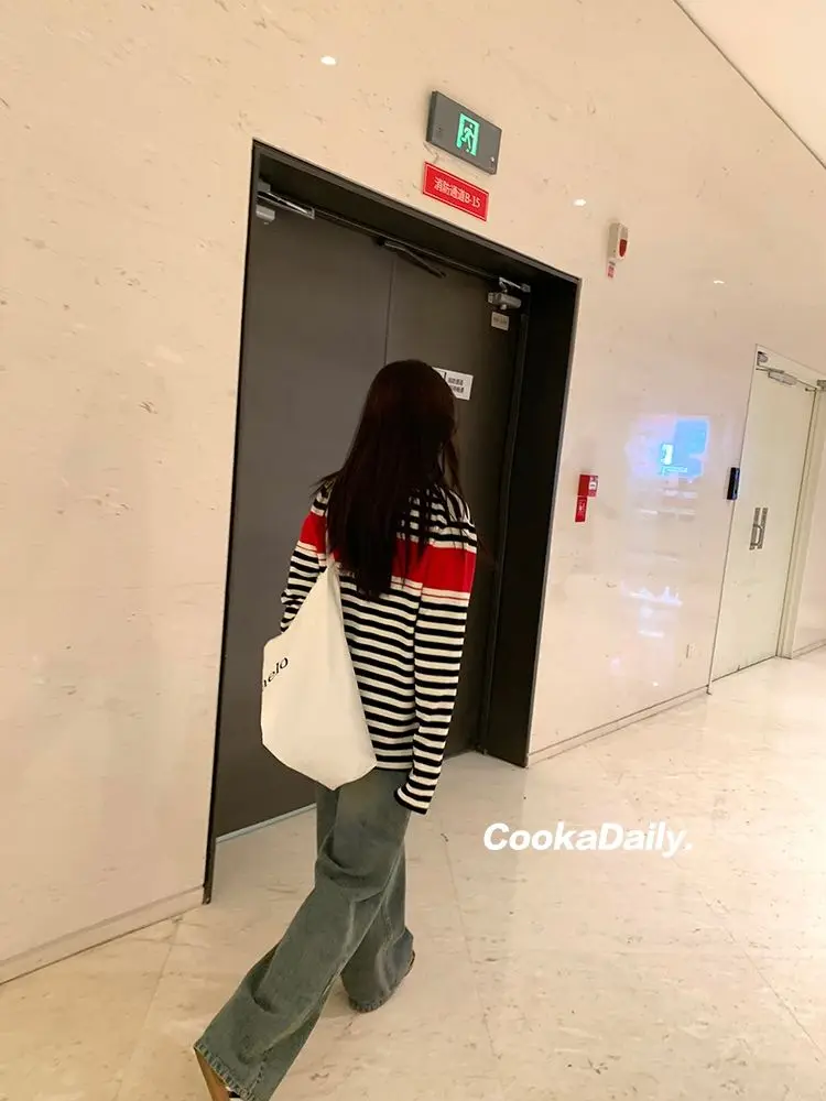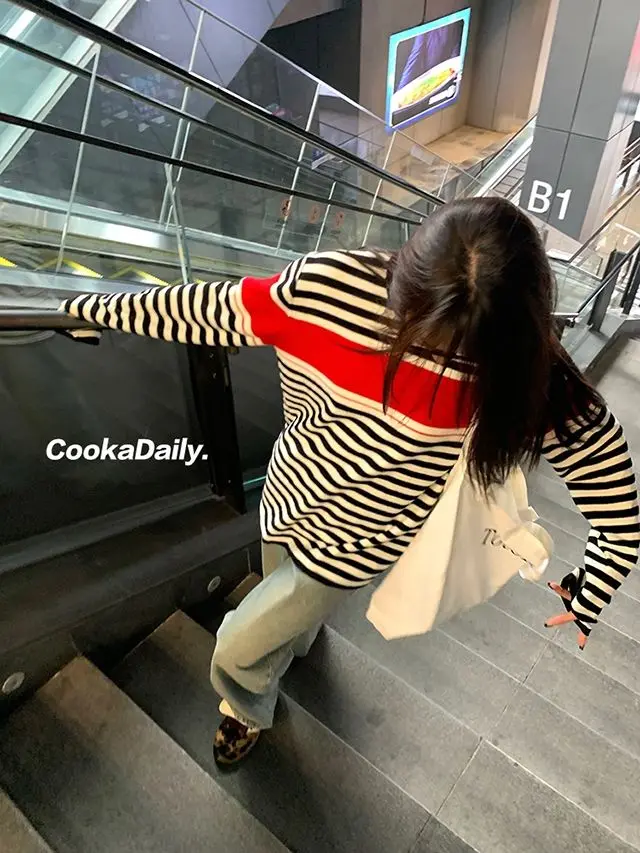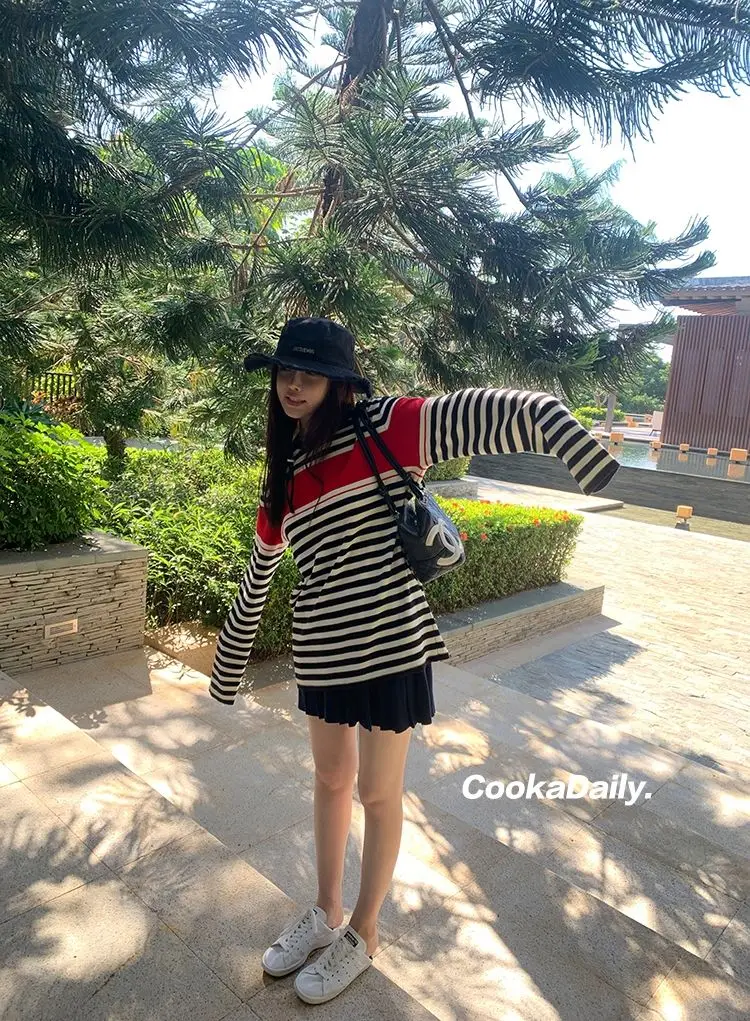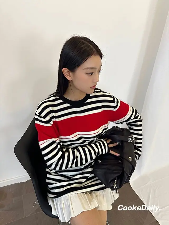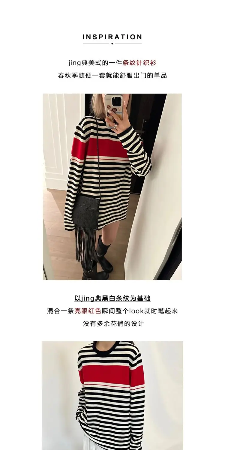 Advbridge Mermaid American wear Color clashing striped knit sweater for women Early fall Loose new top Lazy style Fashionable and unique.