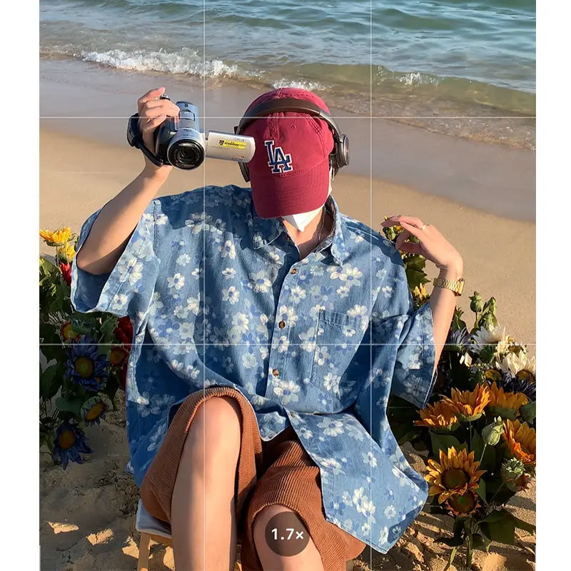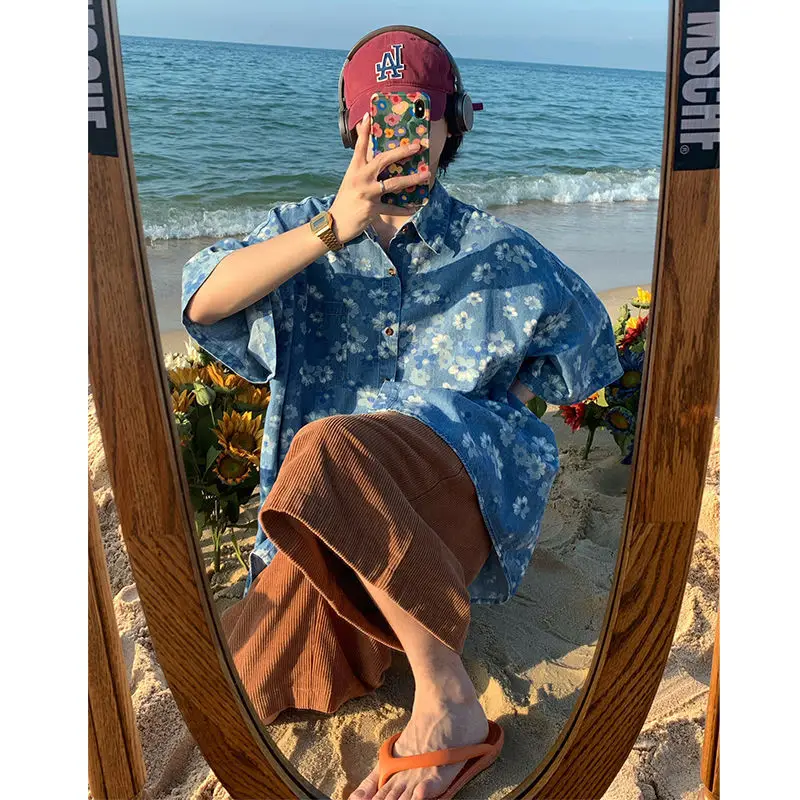 Advbridge New Distressed Blue Denim Daisy Floral Cute Button Up Shirt Men Women Loose Oversized Blouses Kawaii Beach Hawaiian Fashion Tops
