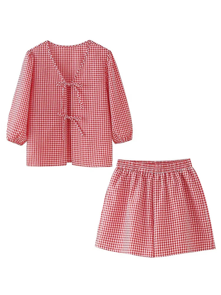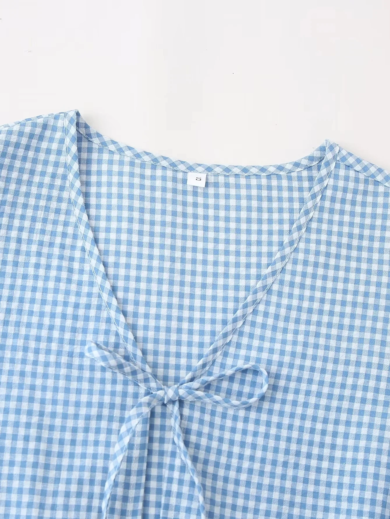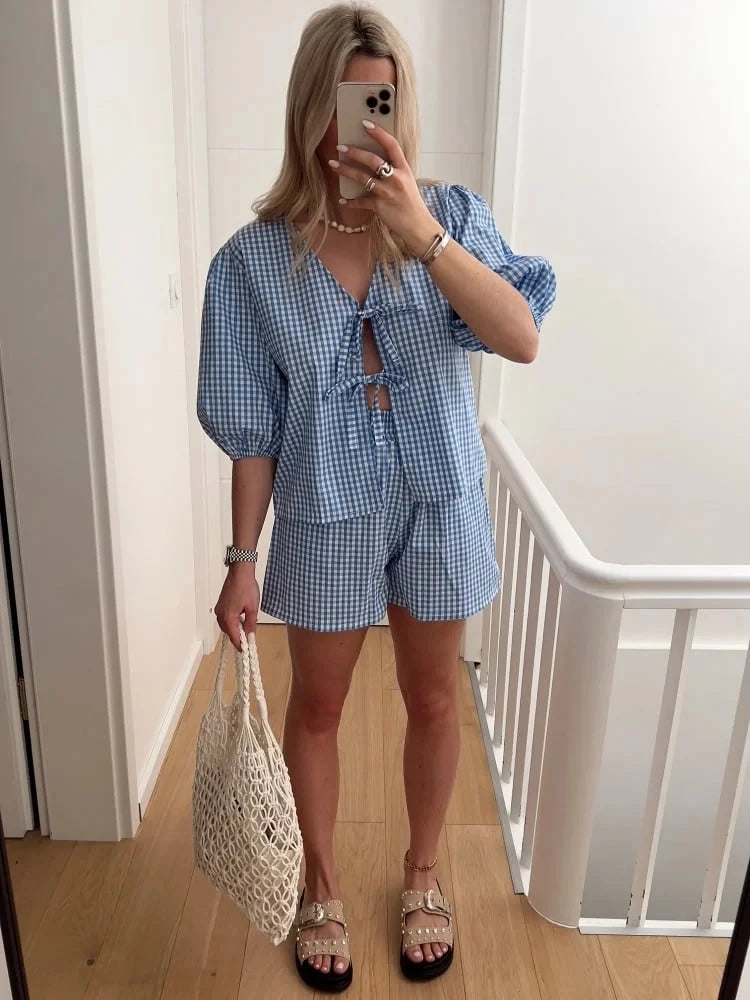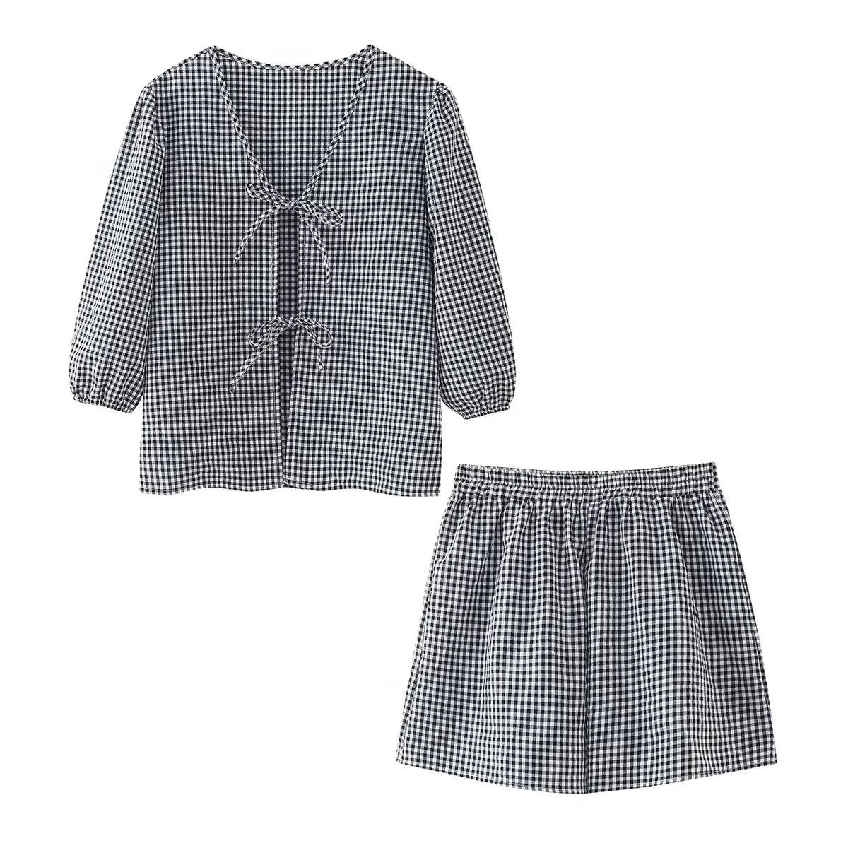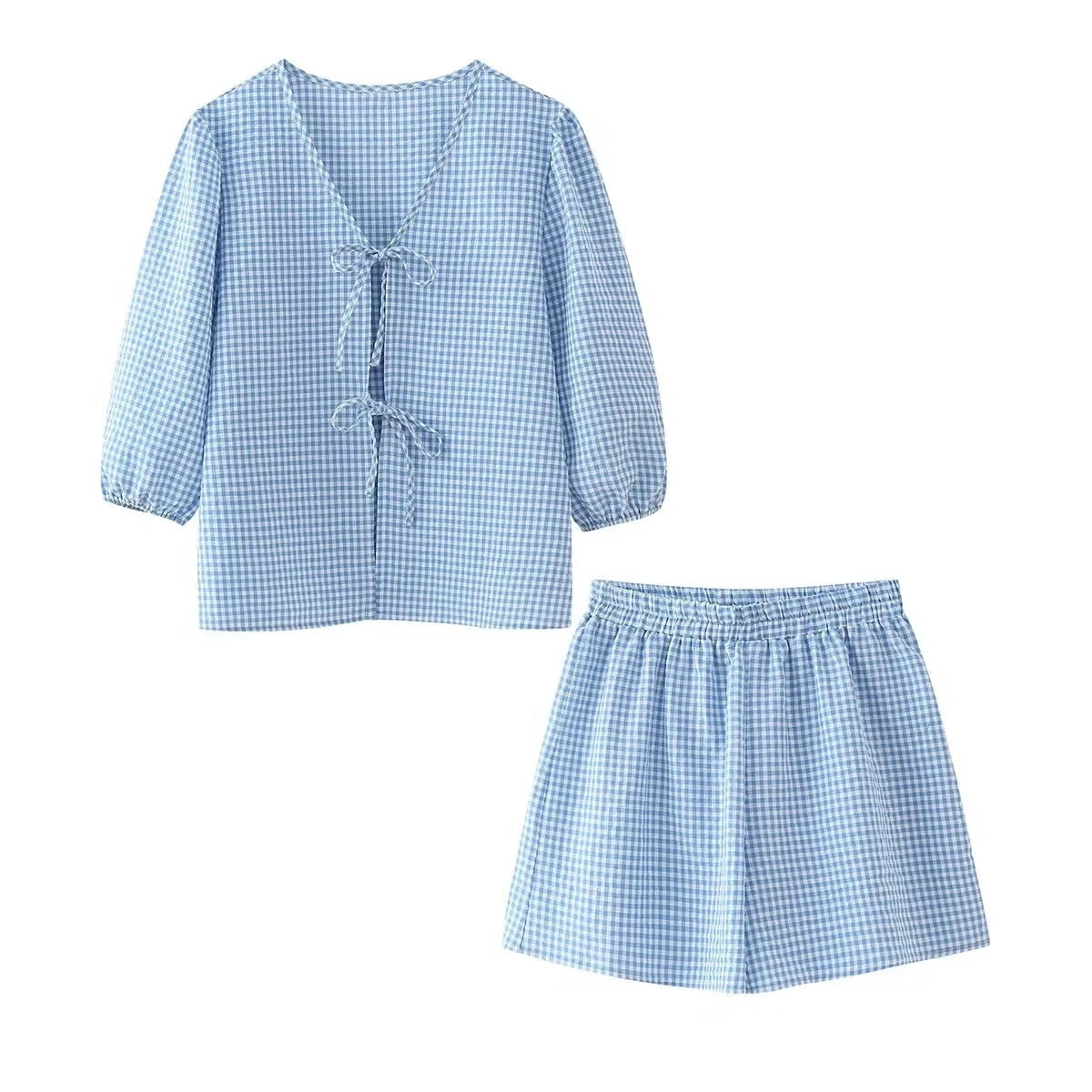 Advbridge Plaid Print Women Matching Set Summer Casual V Neck Bowknot Shorts Set 2 Pcs Outfits Blue Chic Spring Blouse+shorts Set
