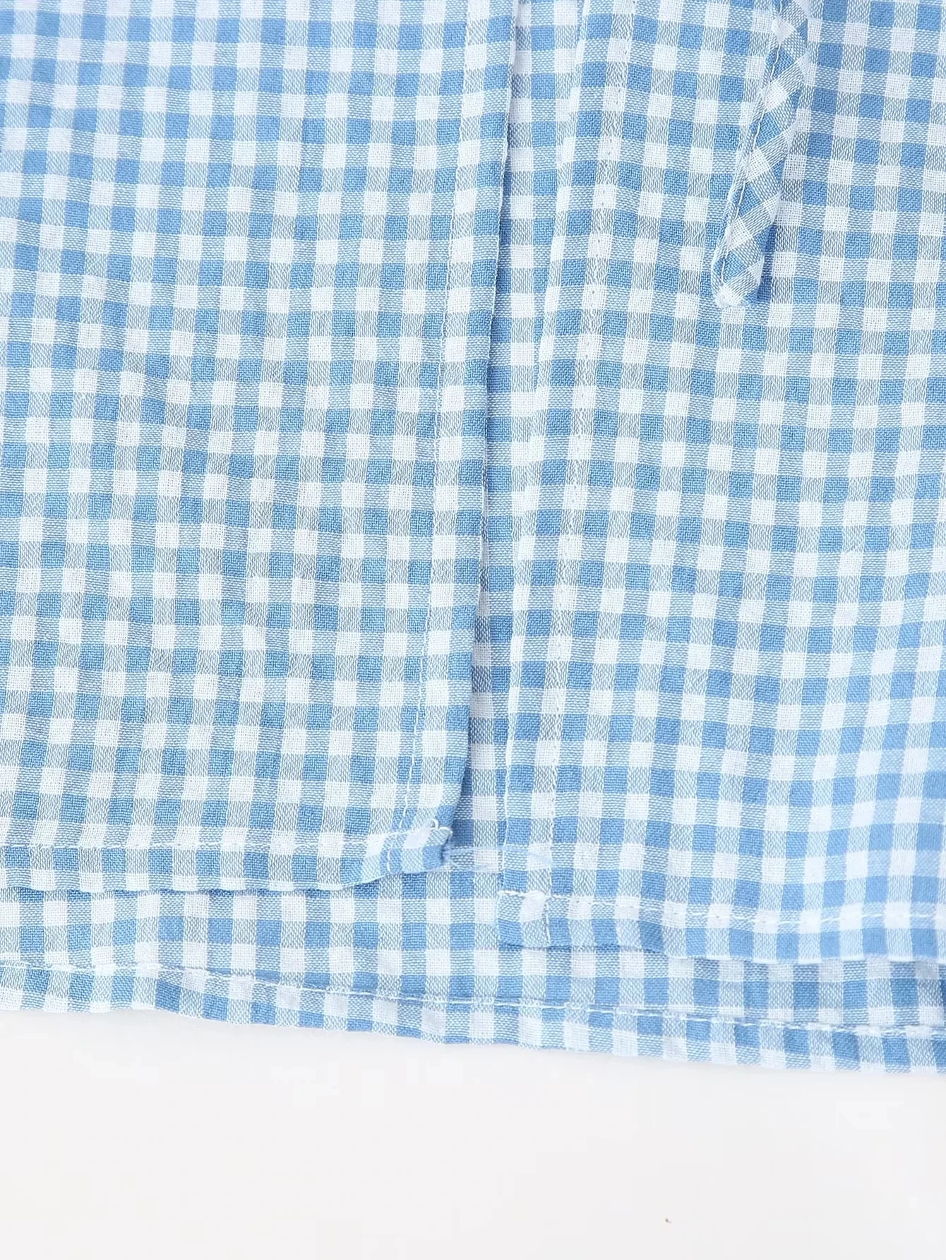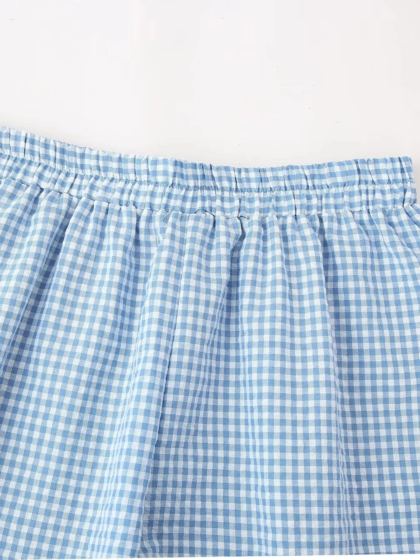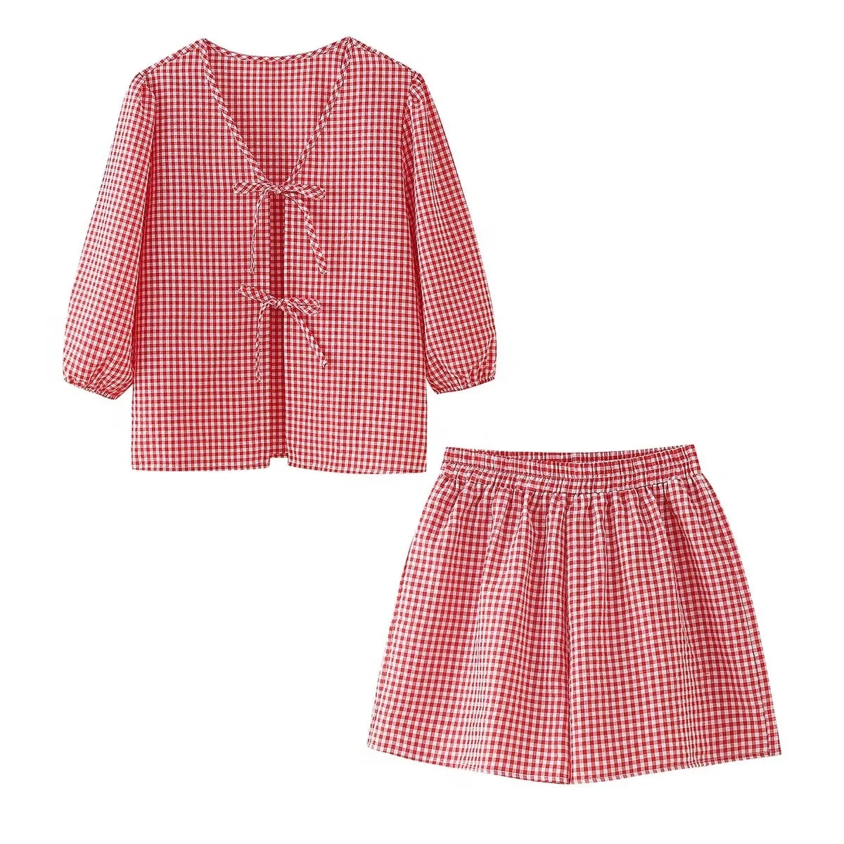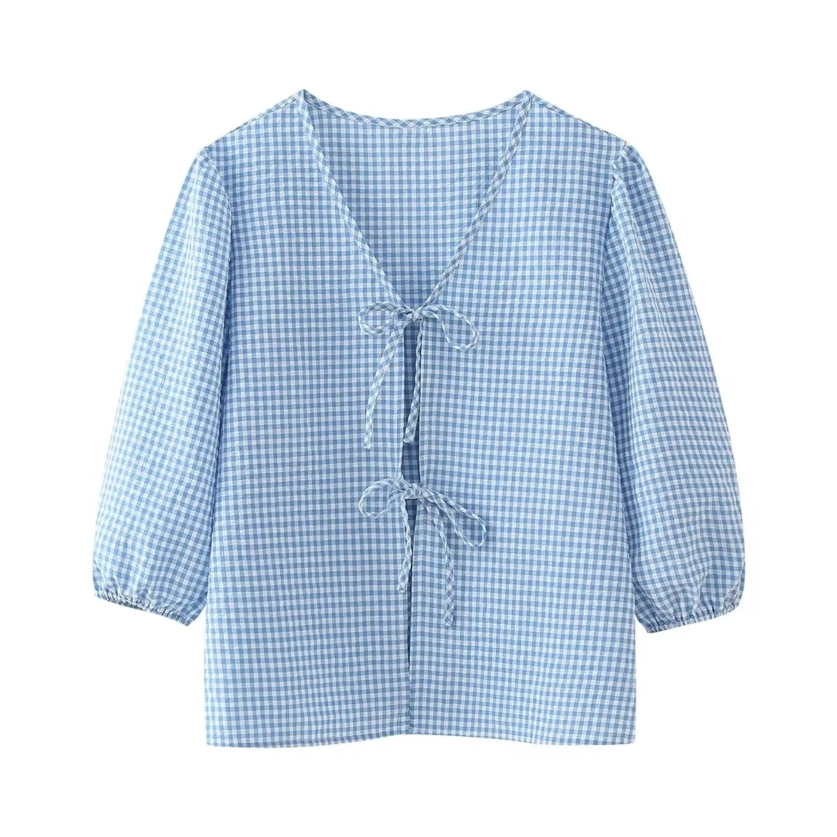 Advbridge Plaid Print Women Matching Set Summer Casual V Neck Bowknot Shorts Set 2 Pcs Outfits Blue Chic Spring Blouse+shorts Set