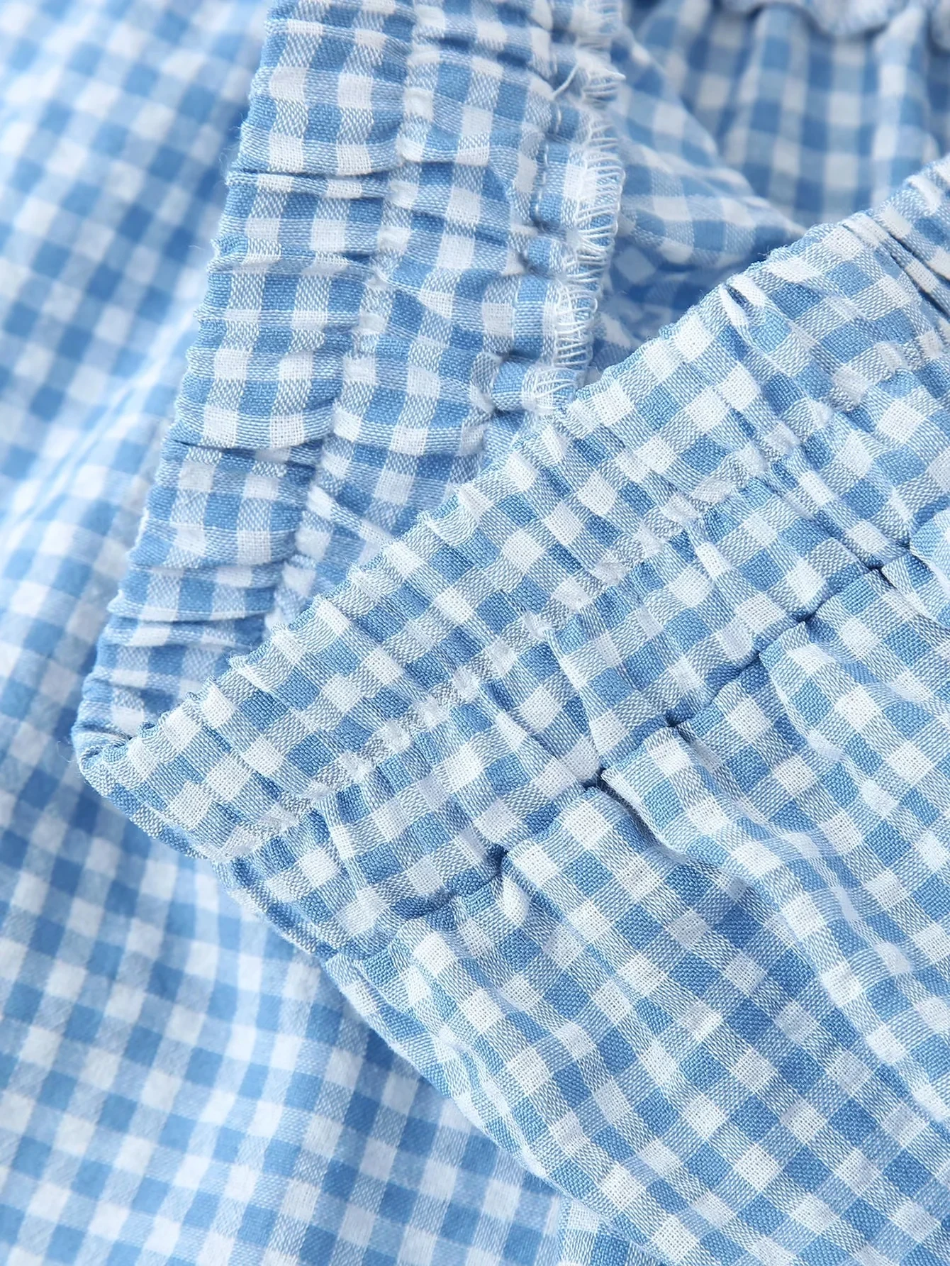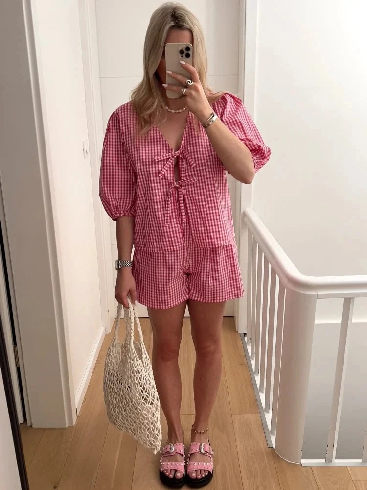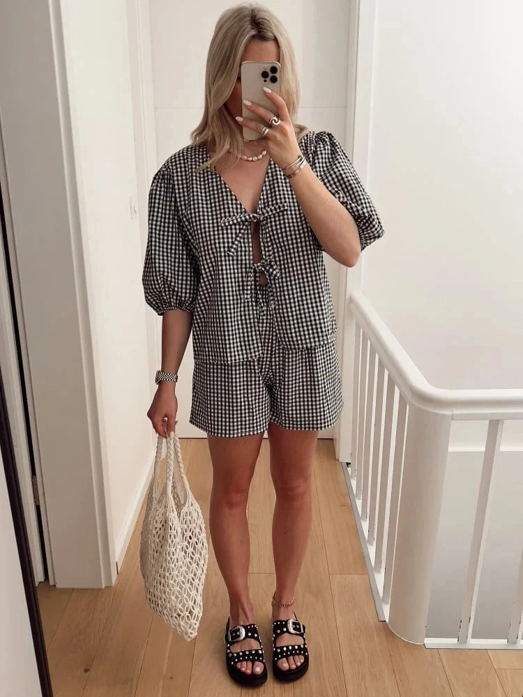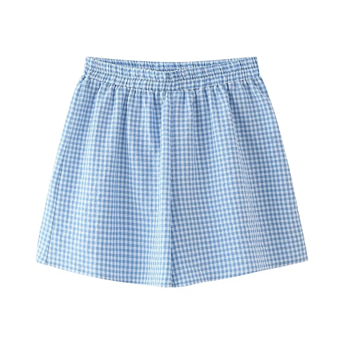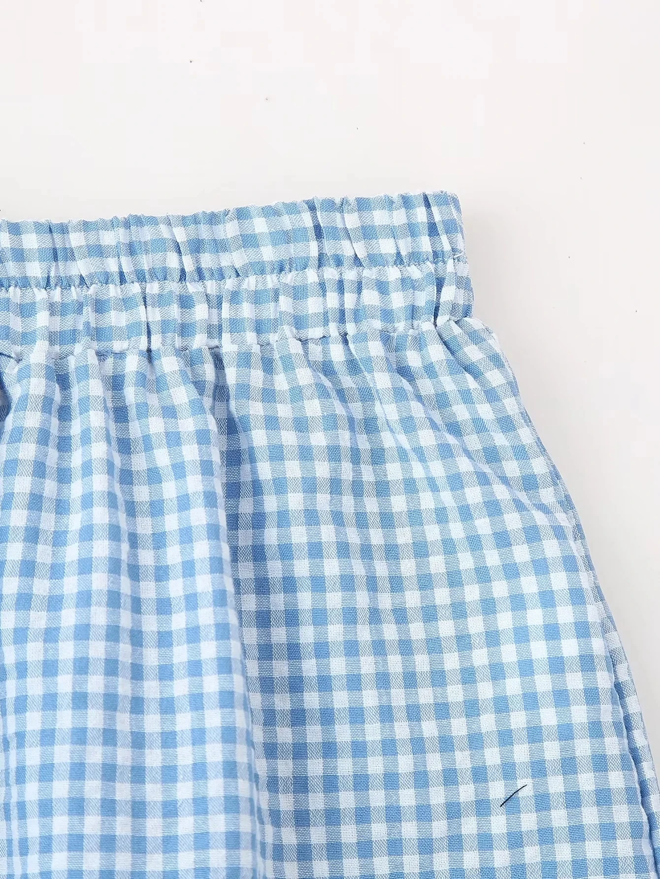 Advbridge Plaid Print Women Matching Set Summer Casual V Neck Bowknot Shorts Set 2 Pcs Outfits Blue Chic Spring Blouse+shorts Set
