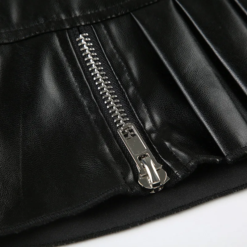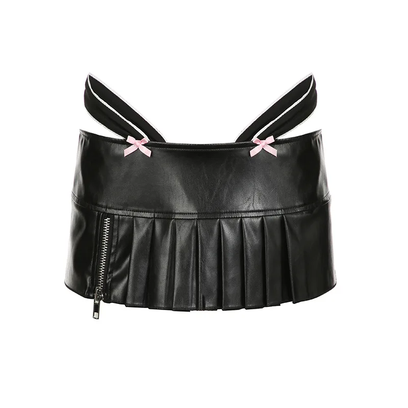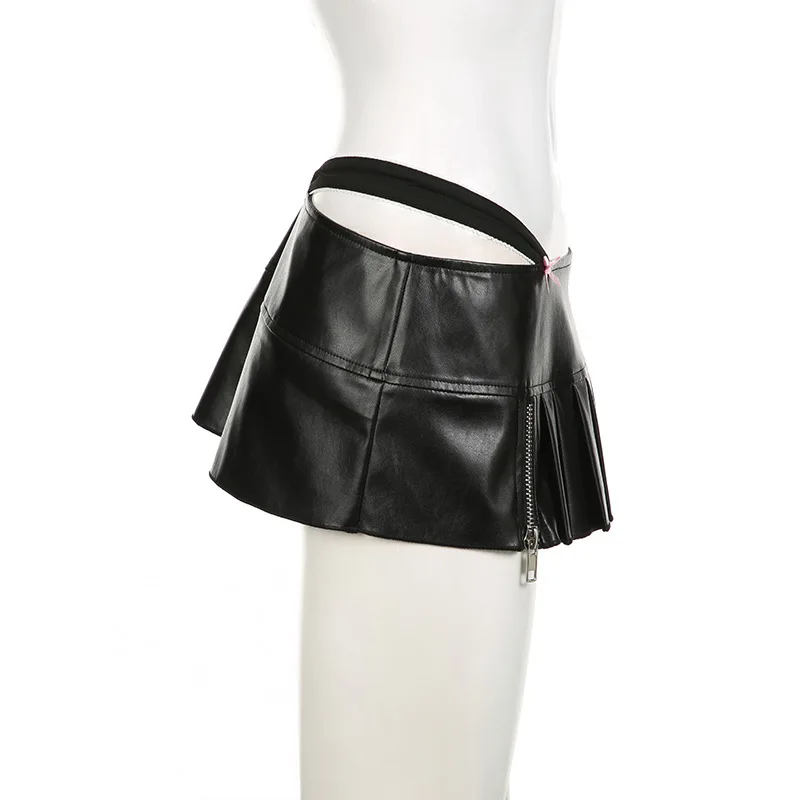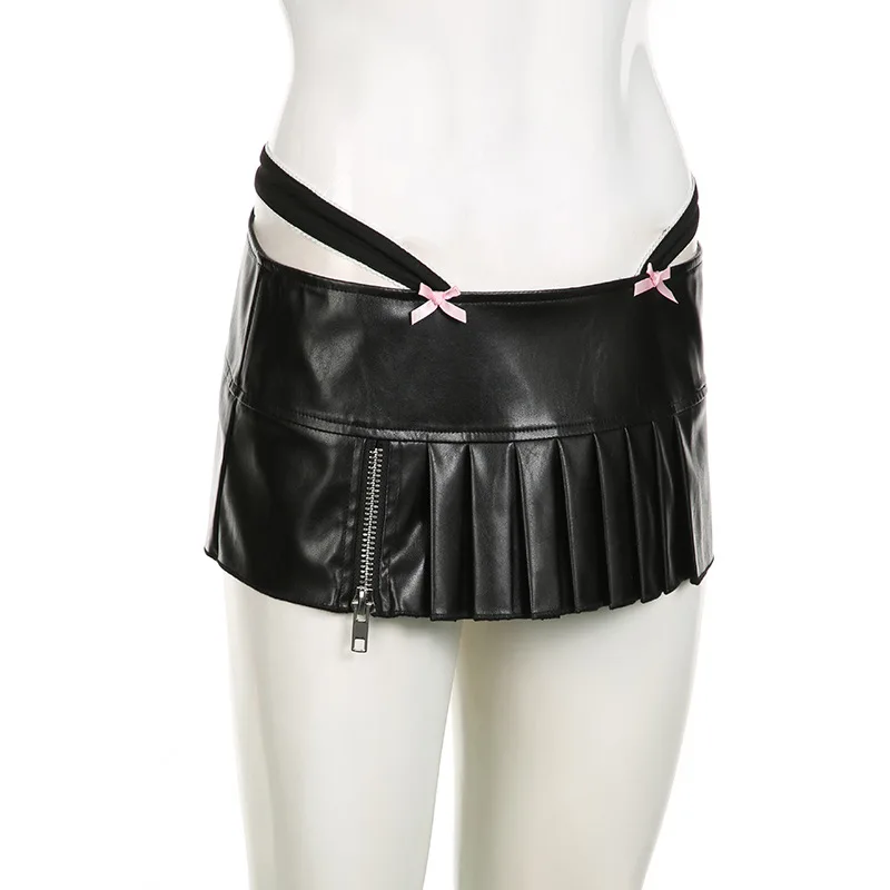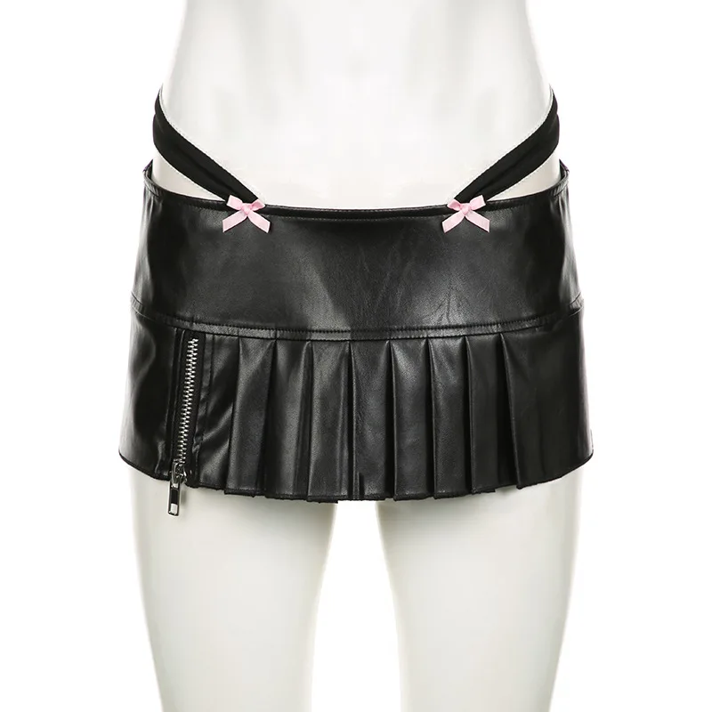 Advbridge PU Leather Sexy Slim Bow Zipper Pleated A-Line Skirt Casual Low-Waisted Super Mini Slirts Women Summer Fashion Streetwear Lady