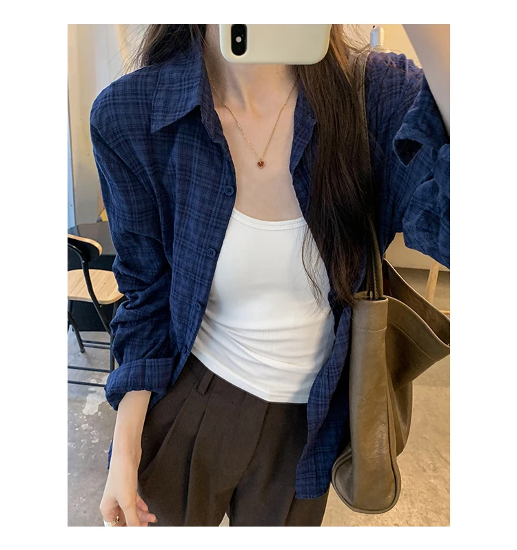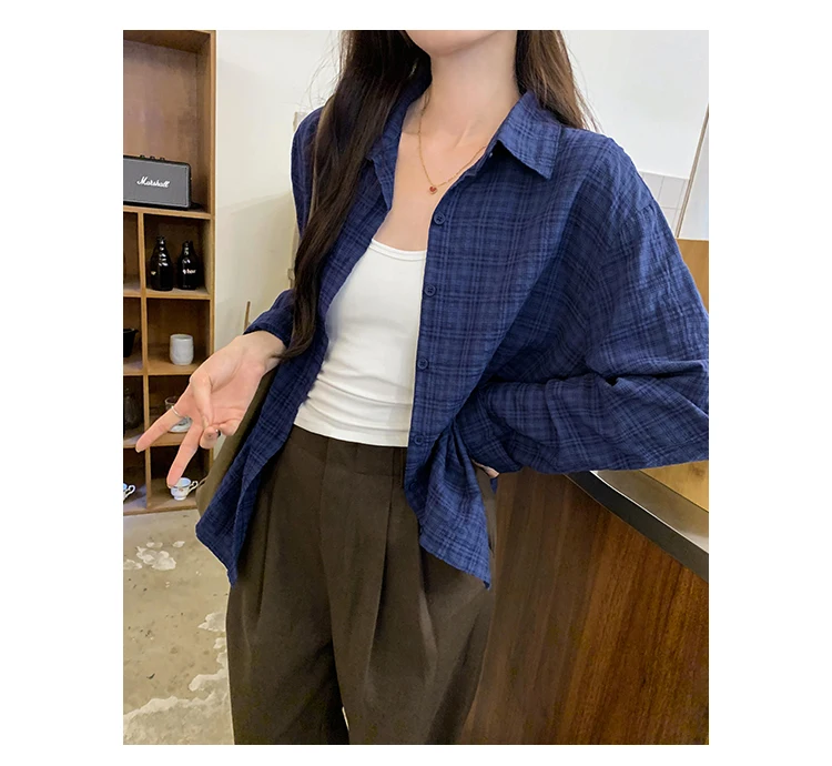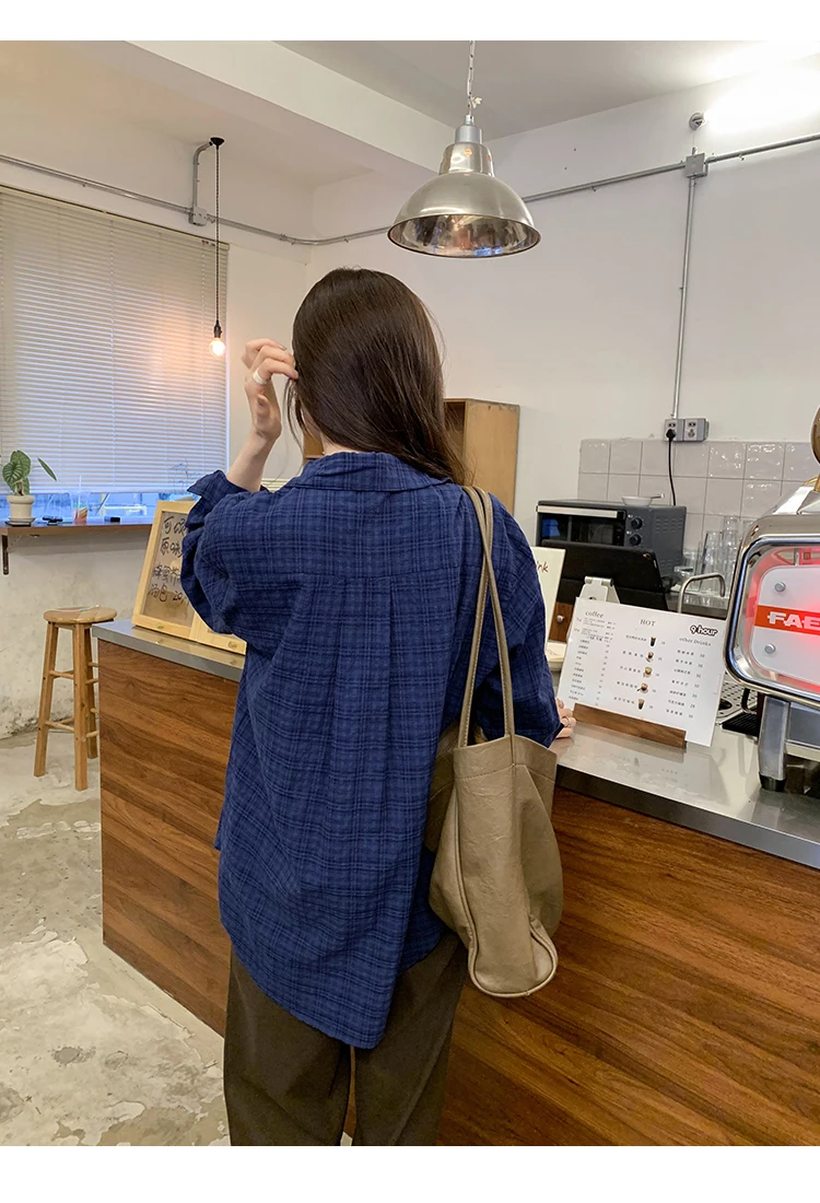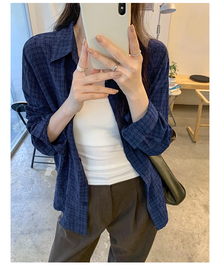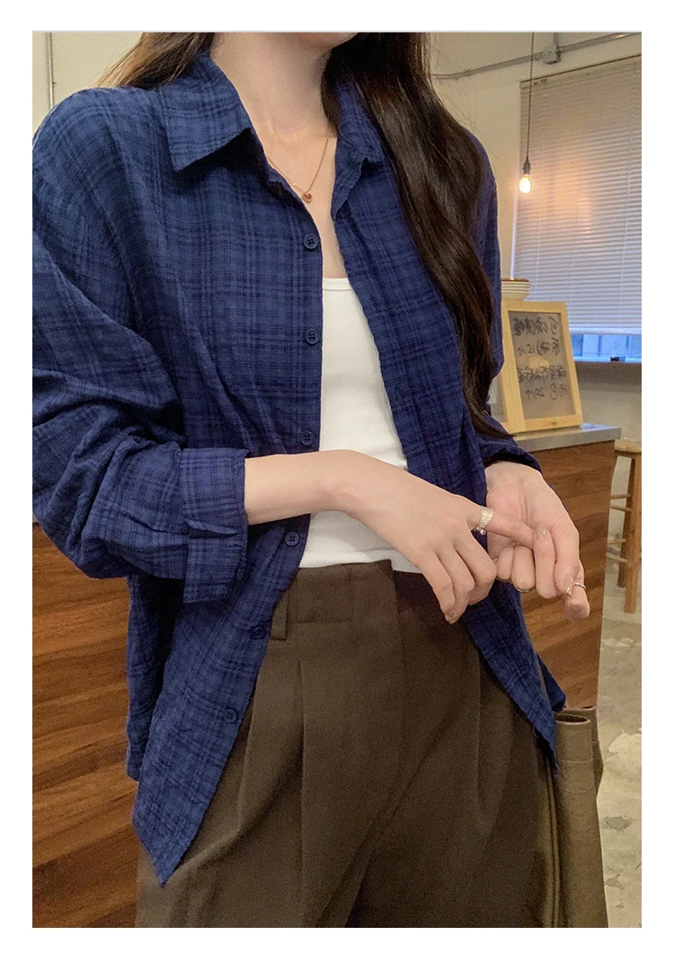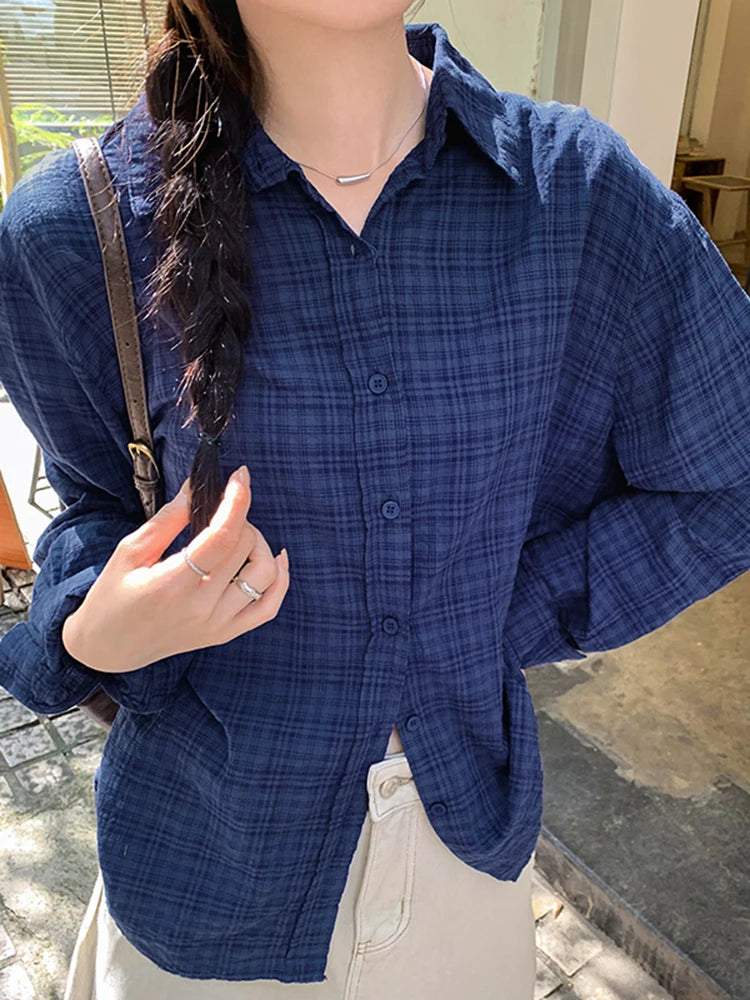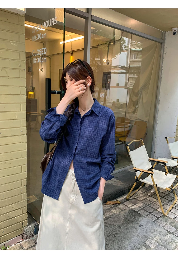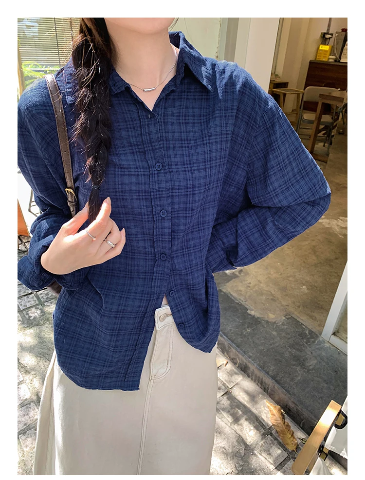 Advbridge Retro French Casual Slim Women Shirt Street Loose Fashion Plaid Woman Shirt Blue Chicly Simple Basic Long-Sleeved Shirt Female