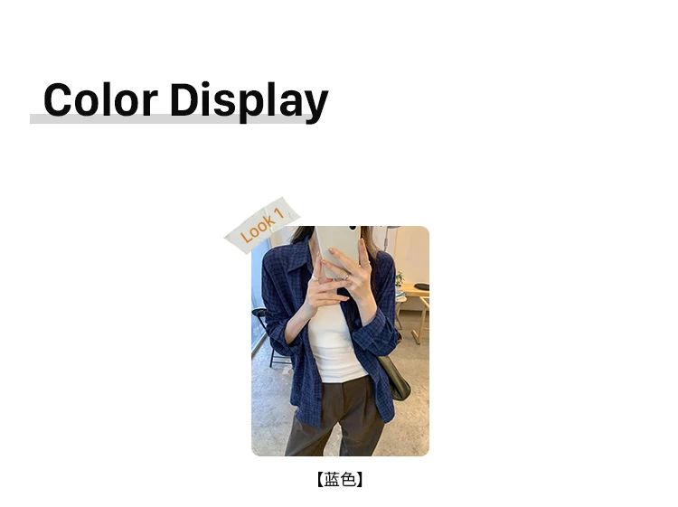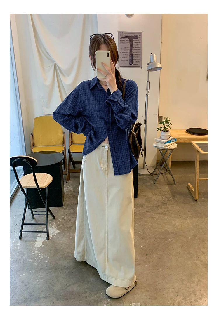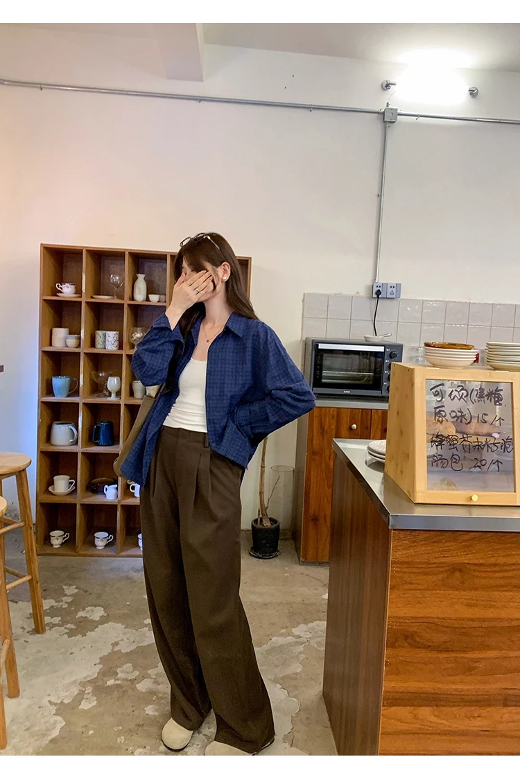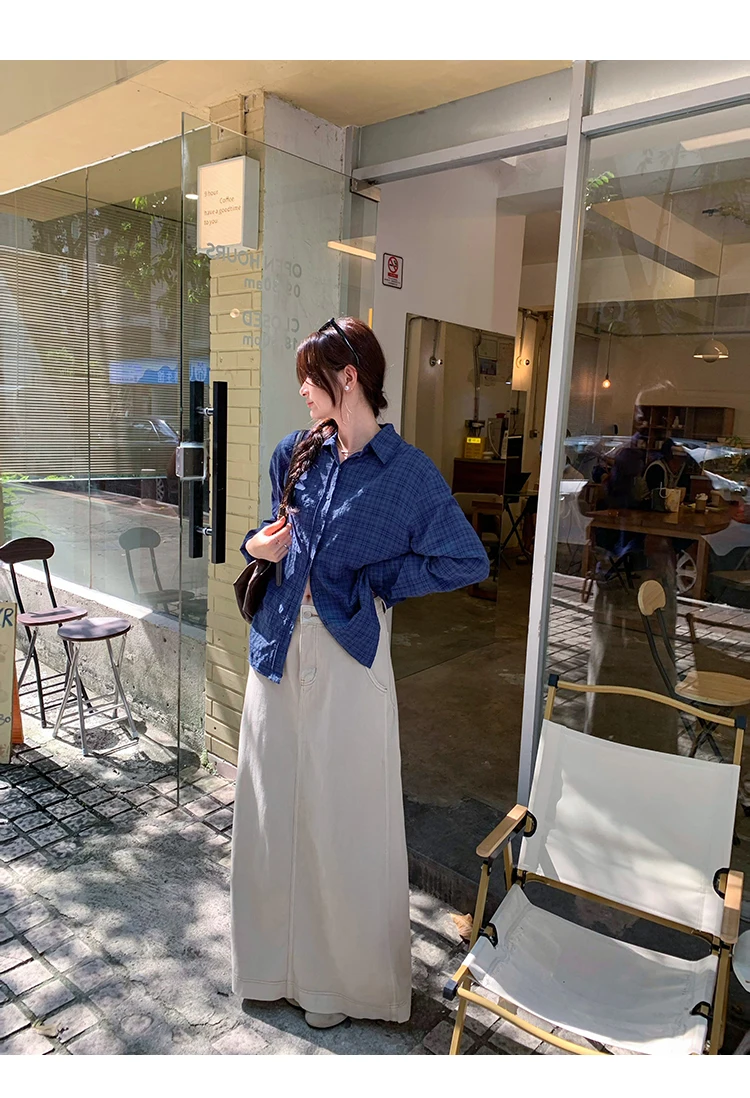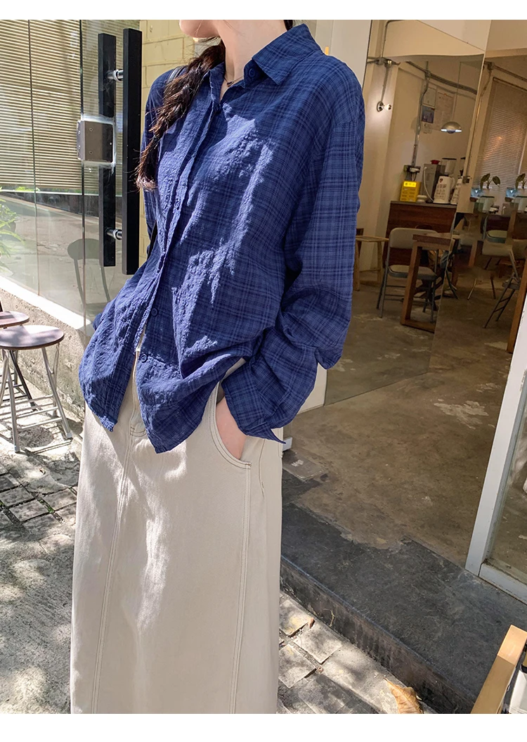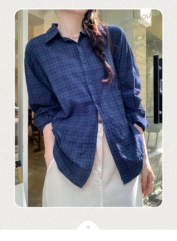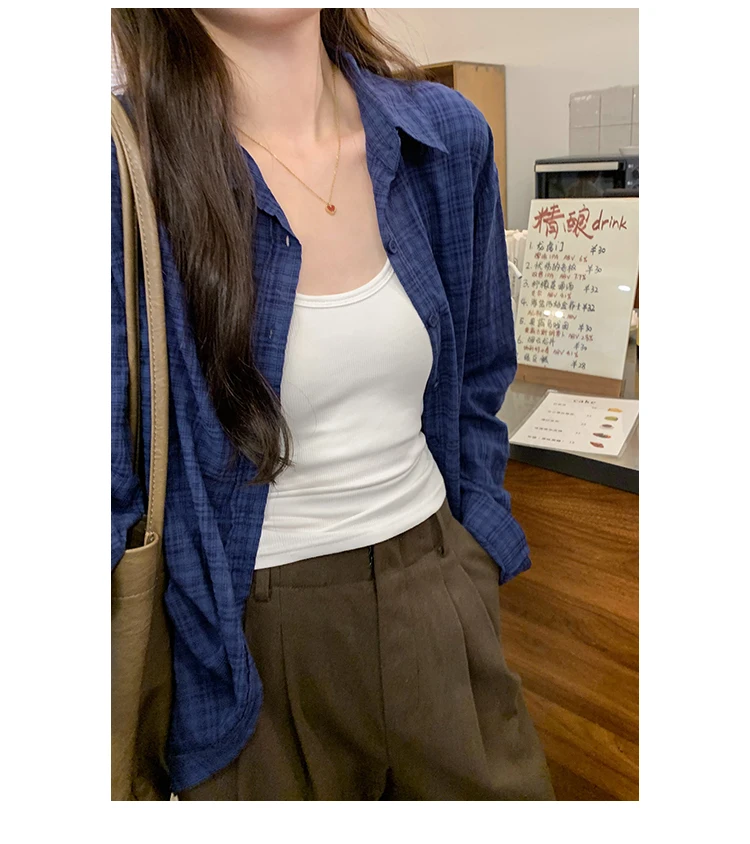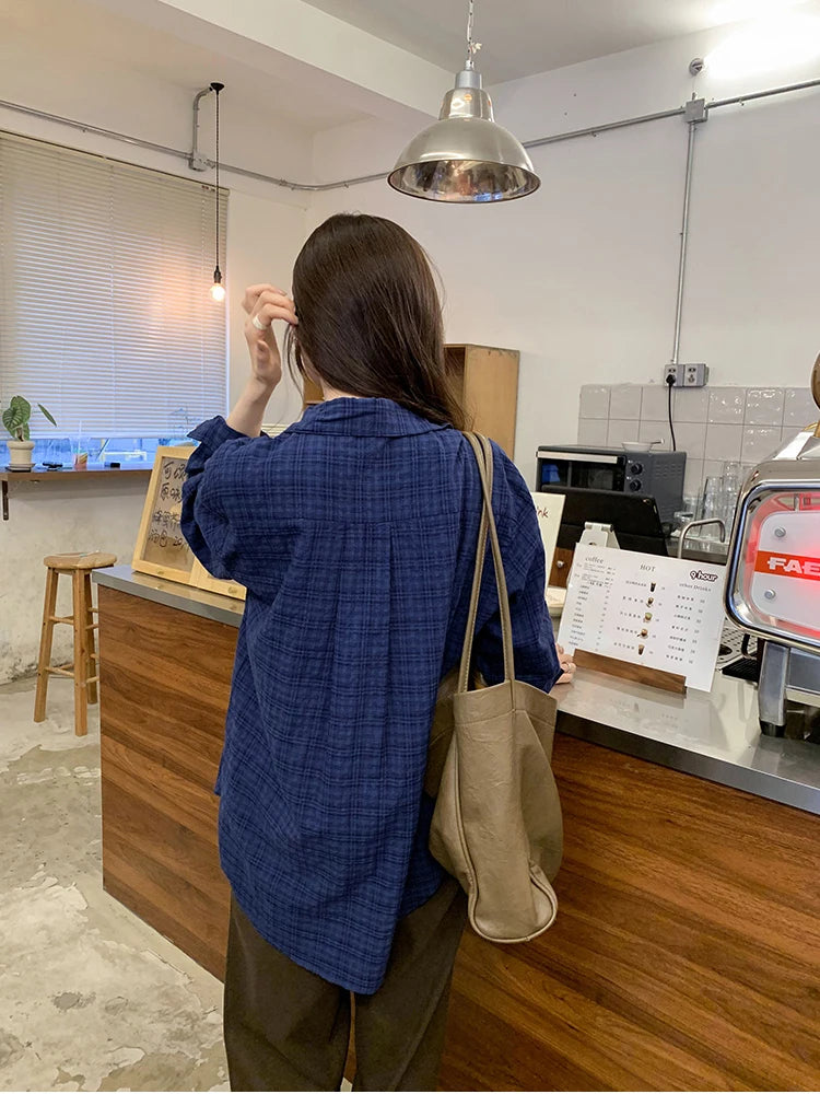 Advbridge Retro French Casual Slim Women Shirt Street Loose Fashion Plaid Woman Shirt Blue Chicly Simple Basic Long-Sleeved Shirt Female