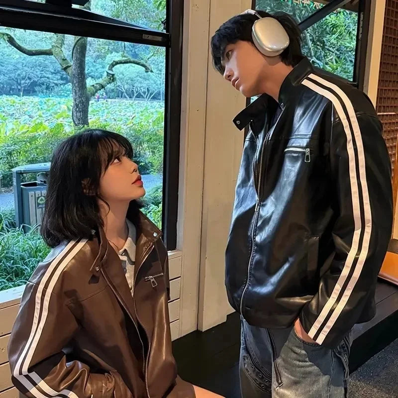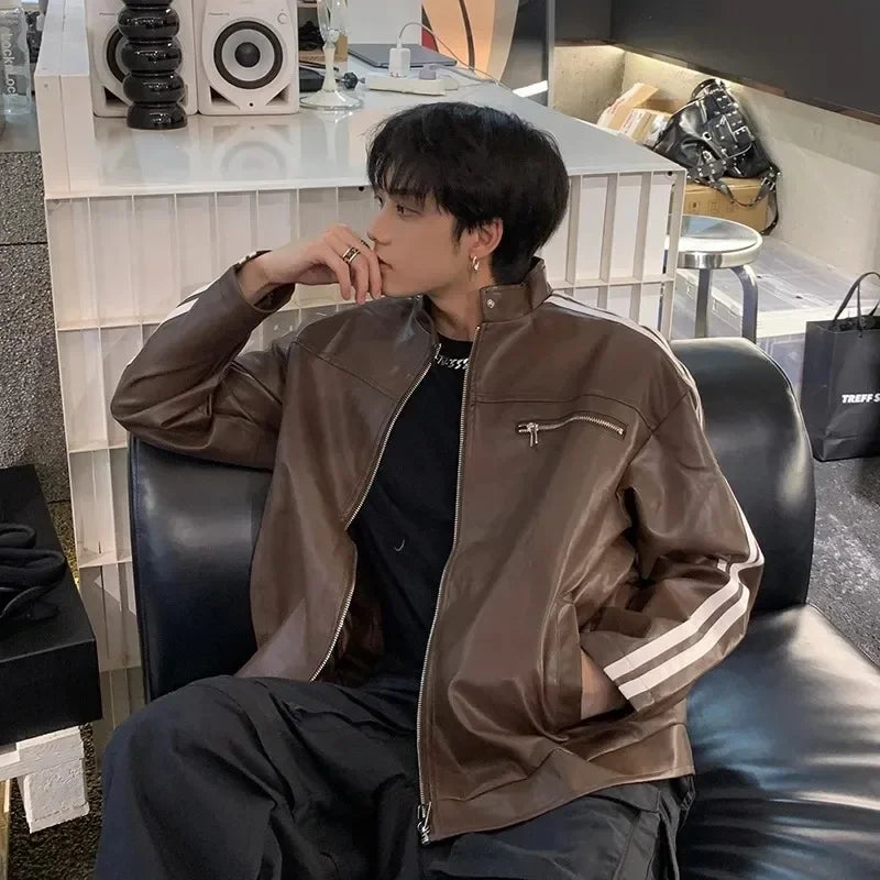 Advbridge Retro Leather Jacket Men Women  American Patchwork Strip Racing Outerwear Loose Hip Hop Zippers Brown PU Coat Streetwear Spring