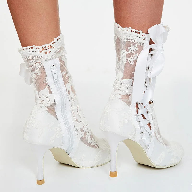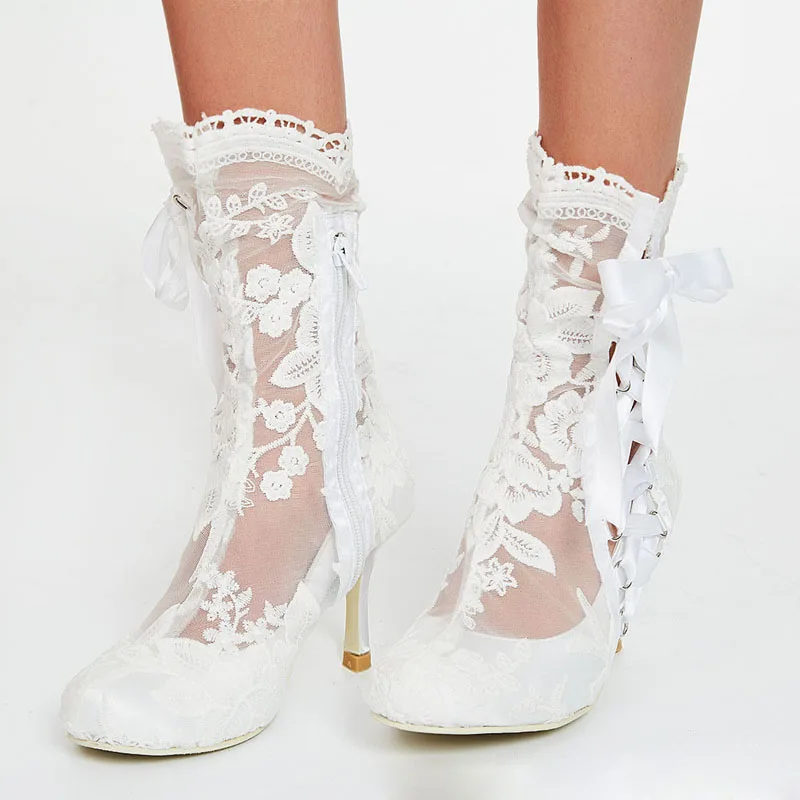 Advbridge Romantic Floral Lace Ribbons Bandage Ankle Boots Women High Heel Wedding Boots Beauty Flower Lace Mesh Prom Ball Short Booties