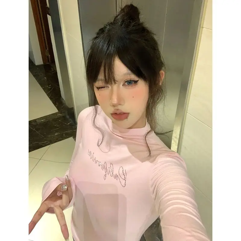 Advbridge Sexy Long Sleeve Pink T-shirt Crop Top Women Y2k Aesthetic Diamond Letter Vintage Gothic Streetwear Tshirts Slim Tee Shirt Femme