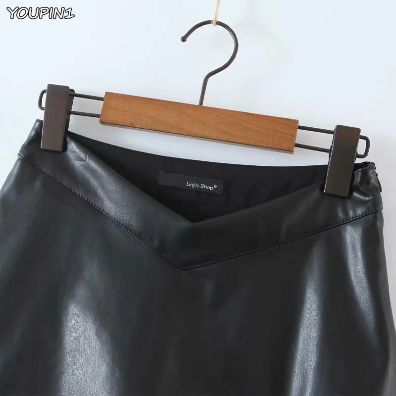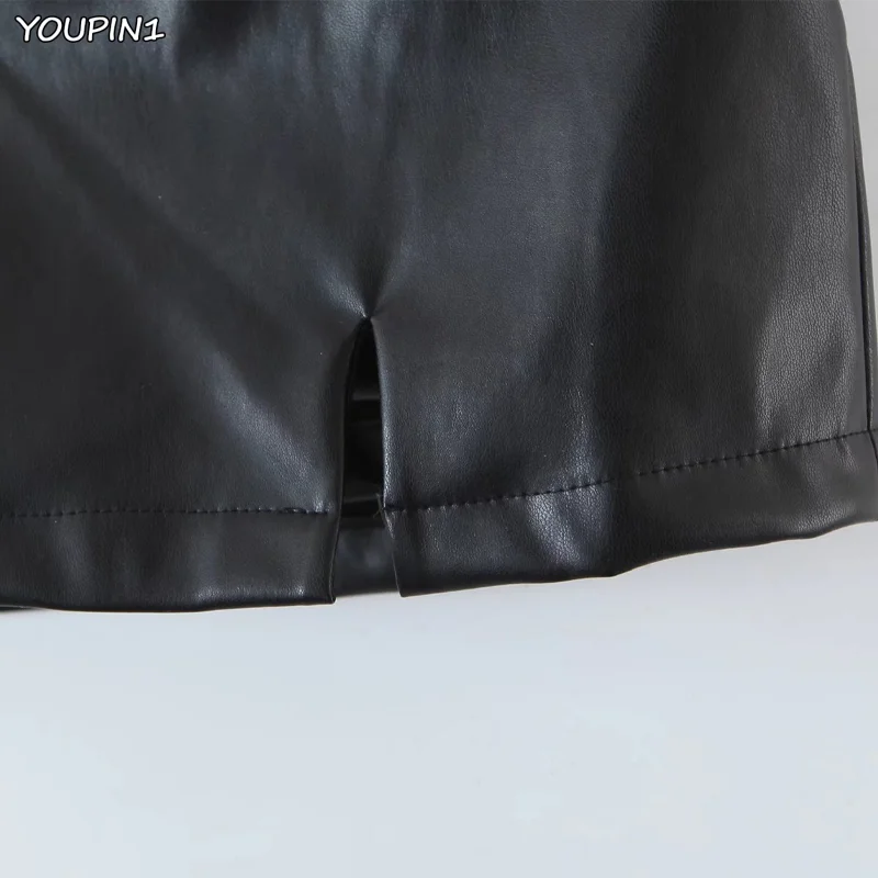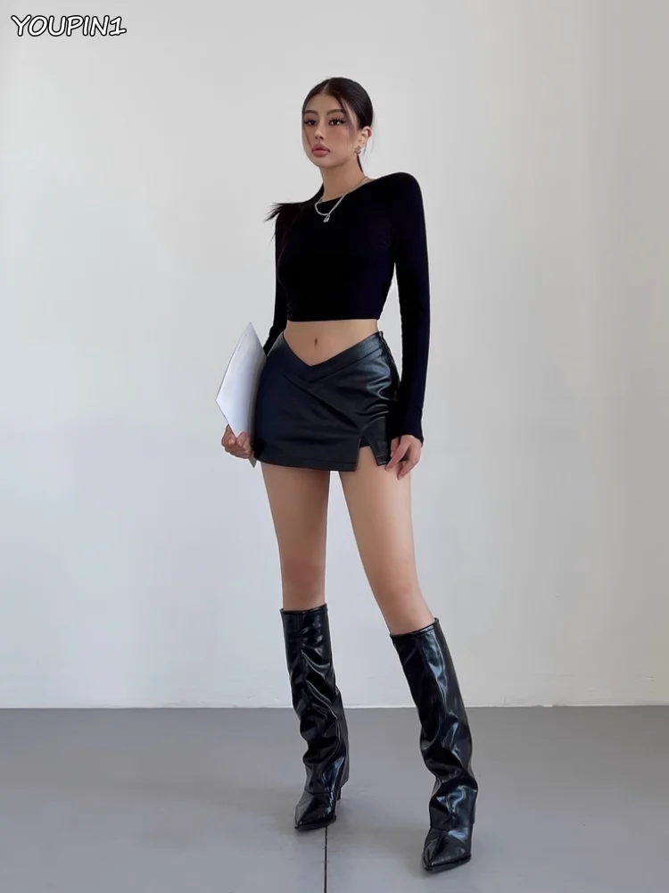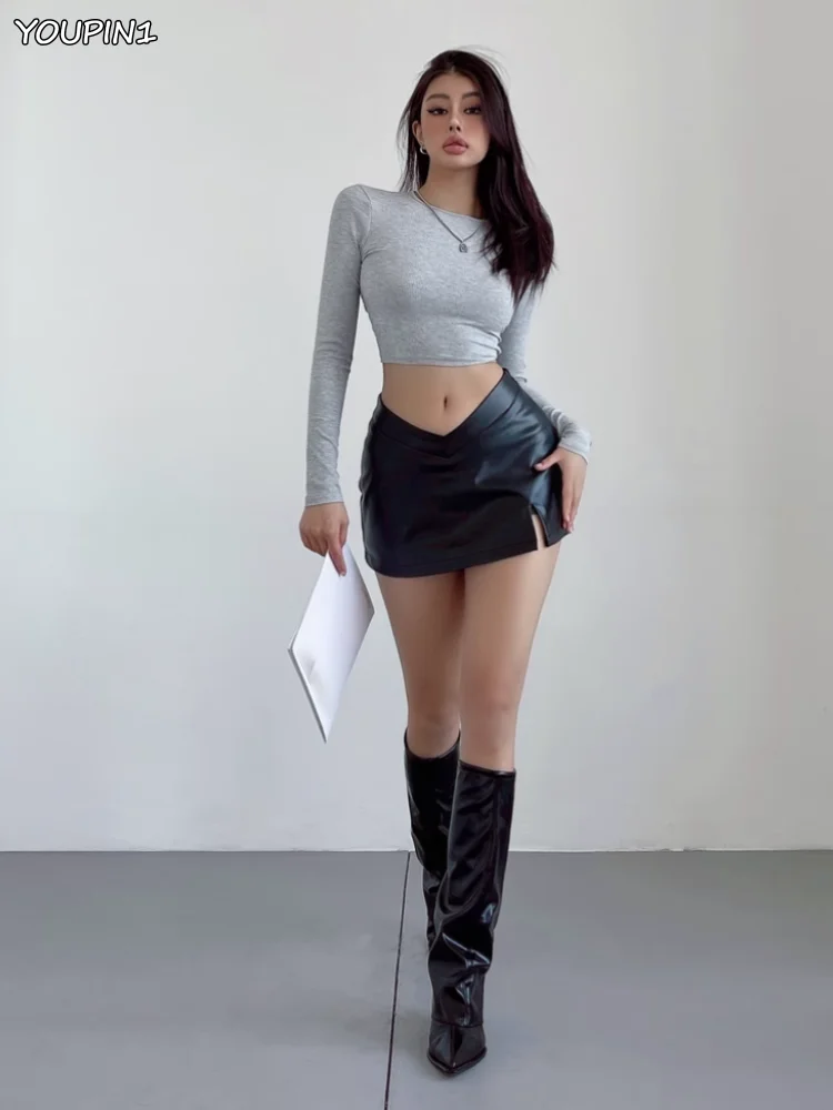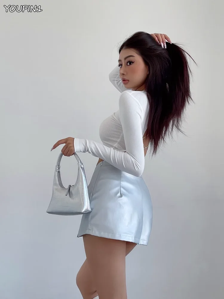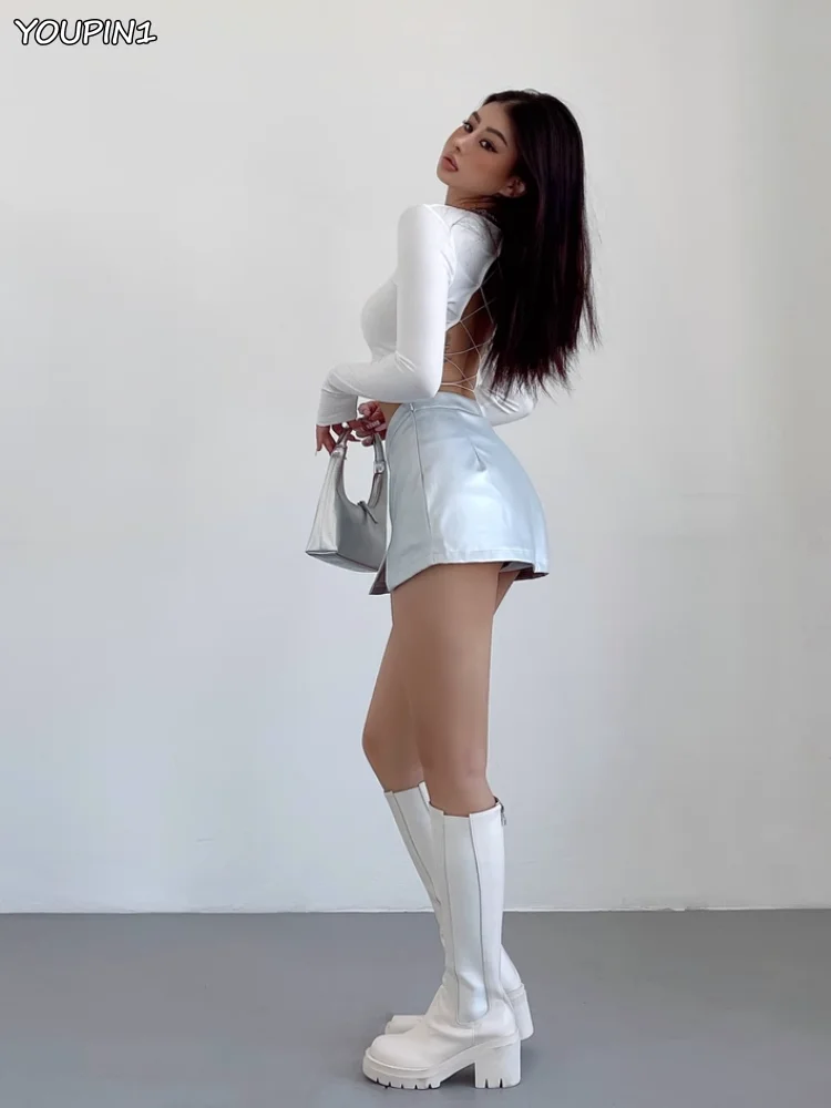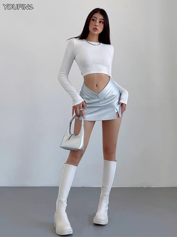 Advbridge Silver Pu Leather Mini Skirt Women Y2K Sexy Slim Female Clothing Gothic V High Waist Slit Casual Short Skirts Streetwear