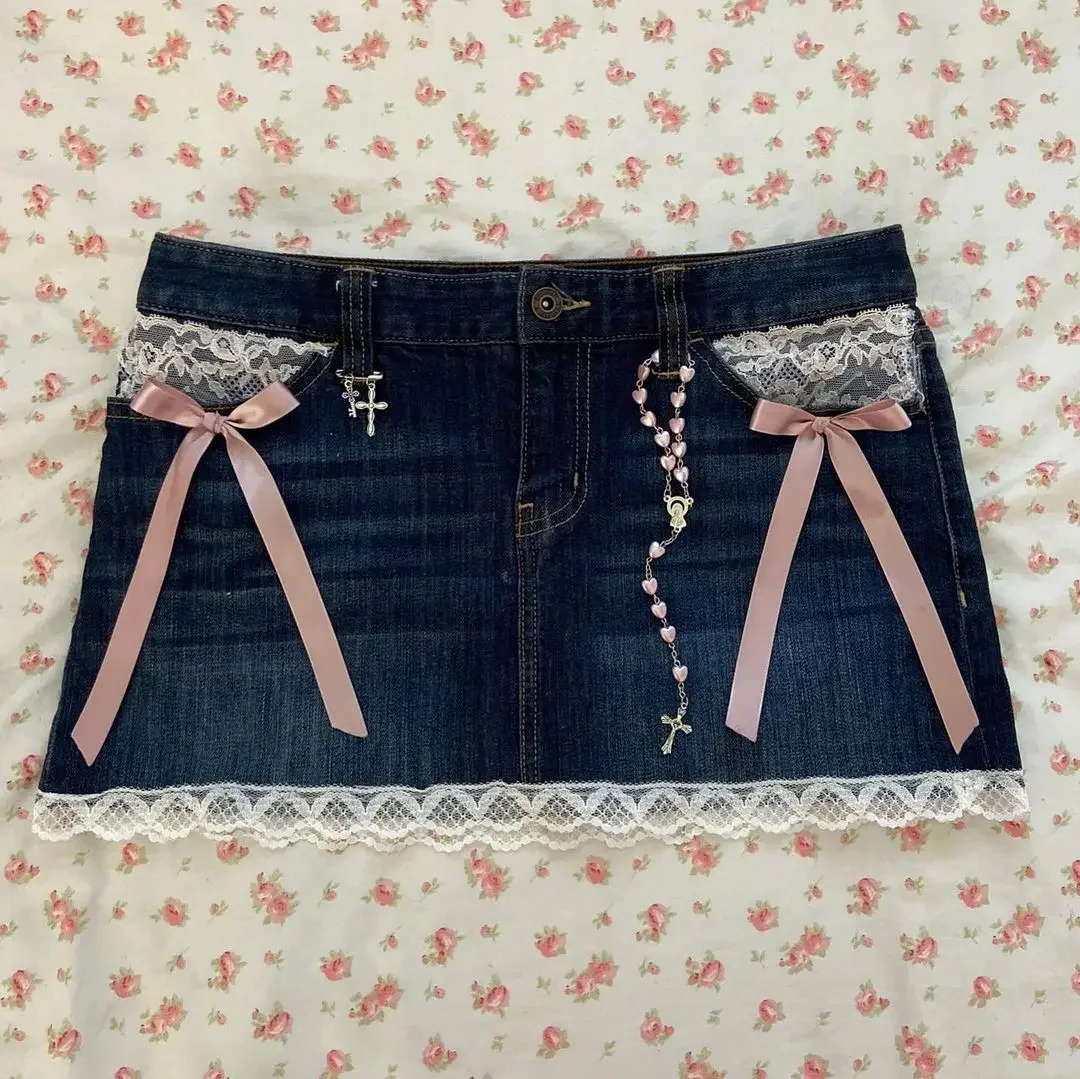 Streetwear Skirt Y2K Womens Gothic Lace Sexy Retro Blue Mini Skirt Pleat A Line Girl Sweetheart High Waist Slim Mini Short Skirt