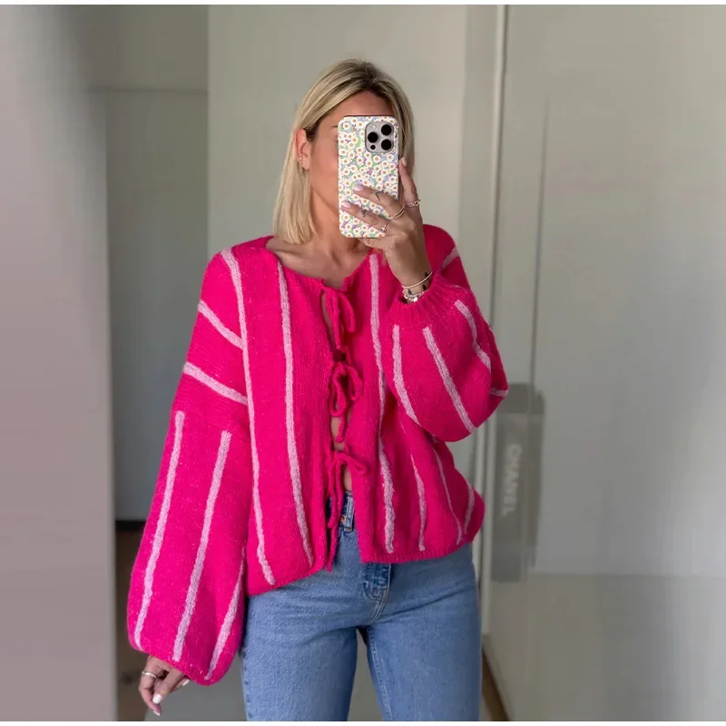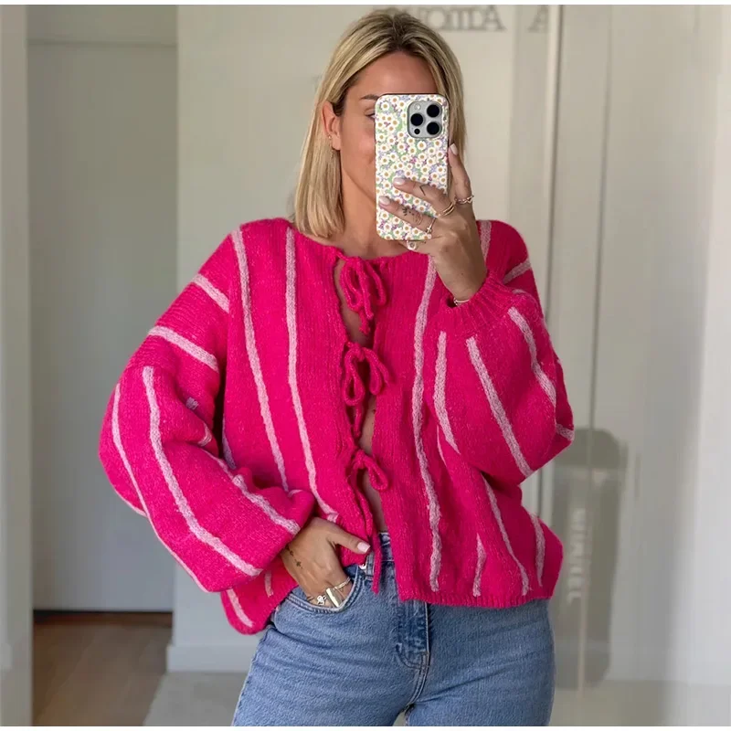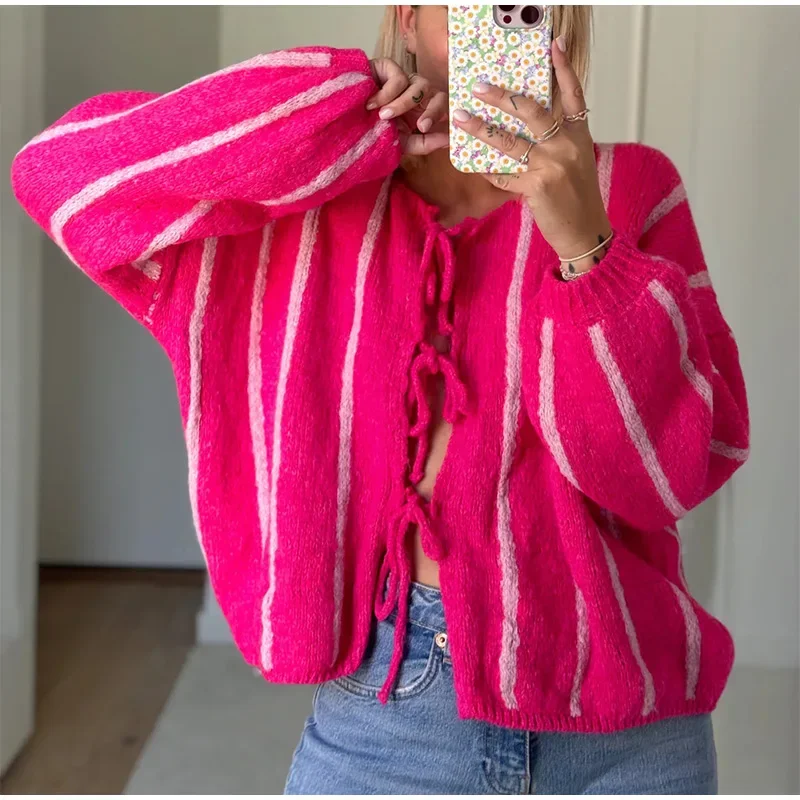 Advbridge Stripe Lace Up Hollow Out Knitted Cardigan Women Elegant Long Sleeves Warm Sweater Coat New Autumn Lady Street Jumper