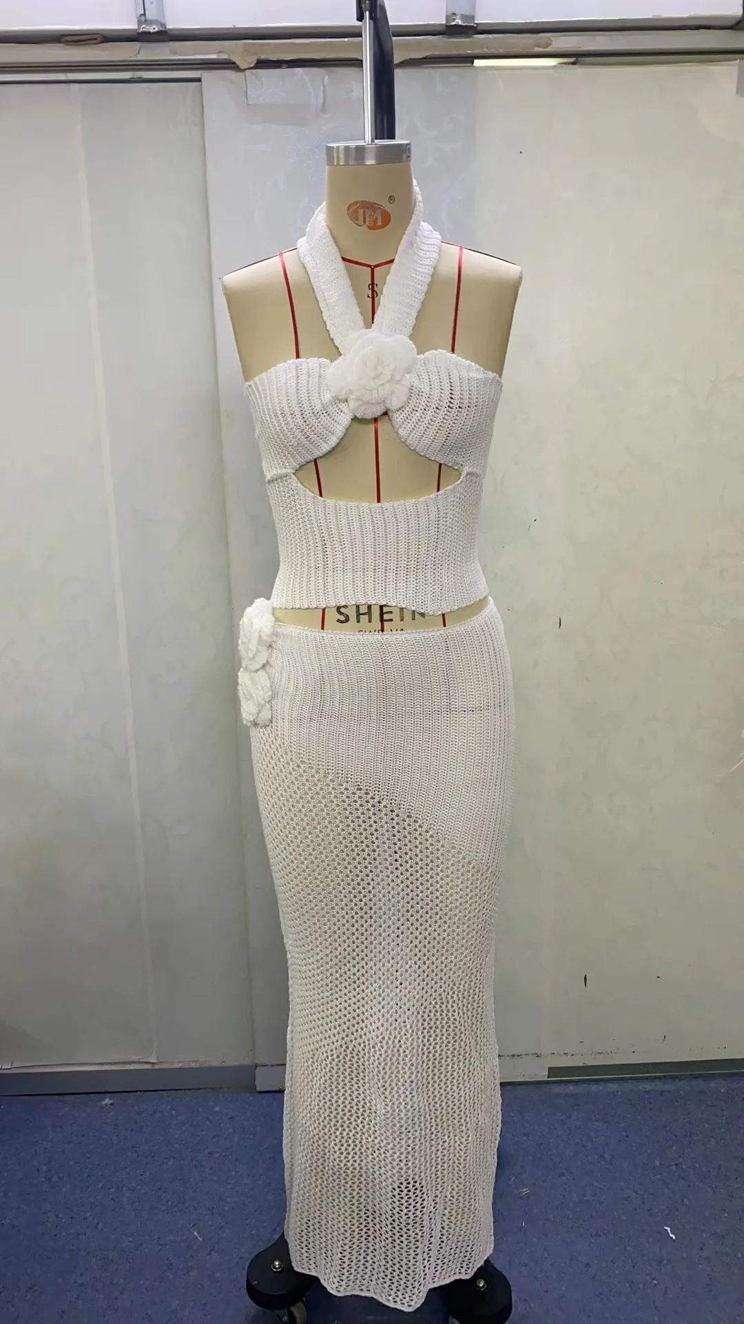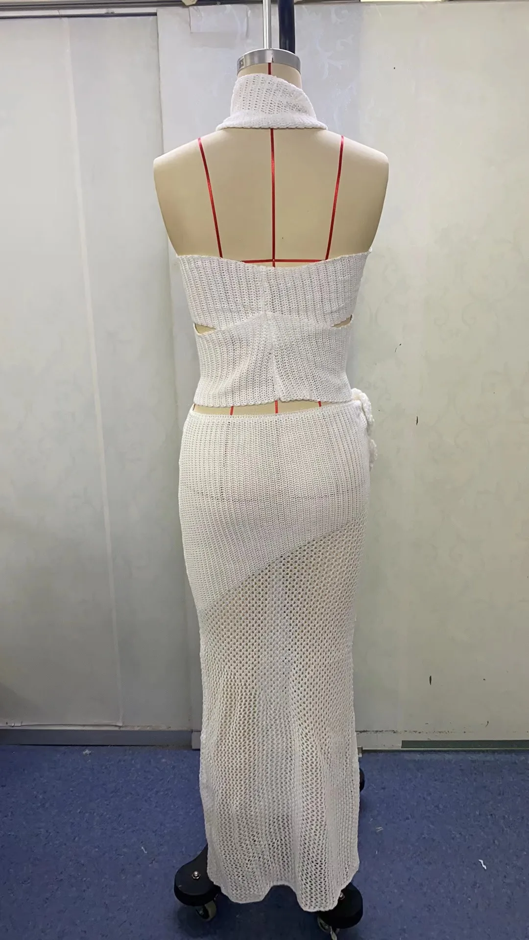 Advbridge Summer Knitted Beach Skirt Sets Women Sexy Halter Backless Slim Bohemian Outfit White Sheer Holiday Two Piece Set 2024 Beachwear