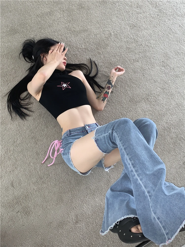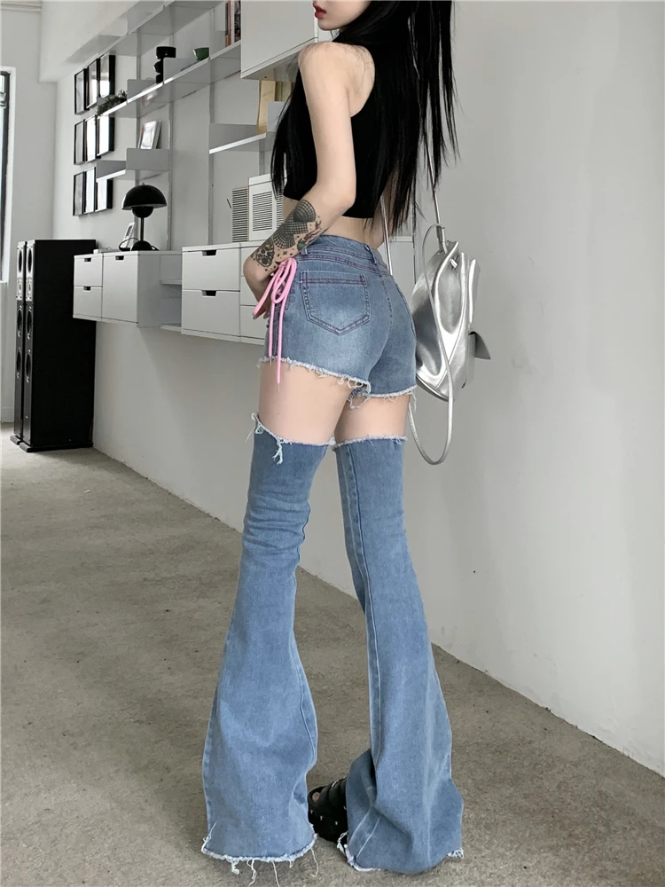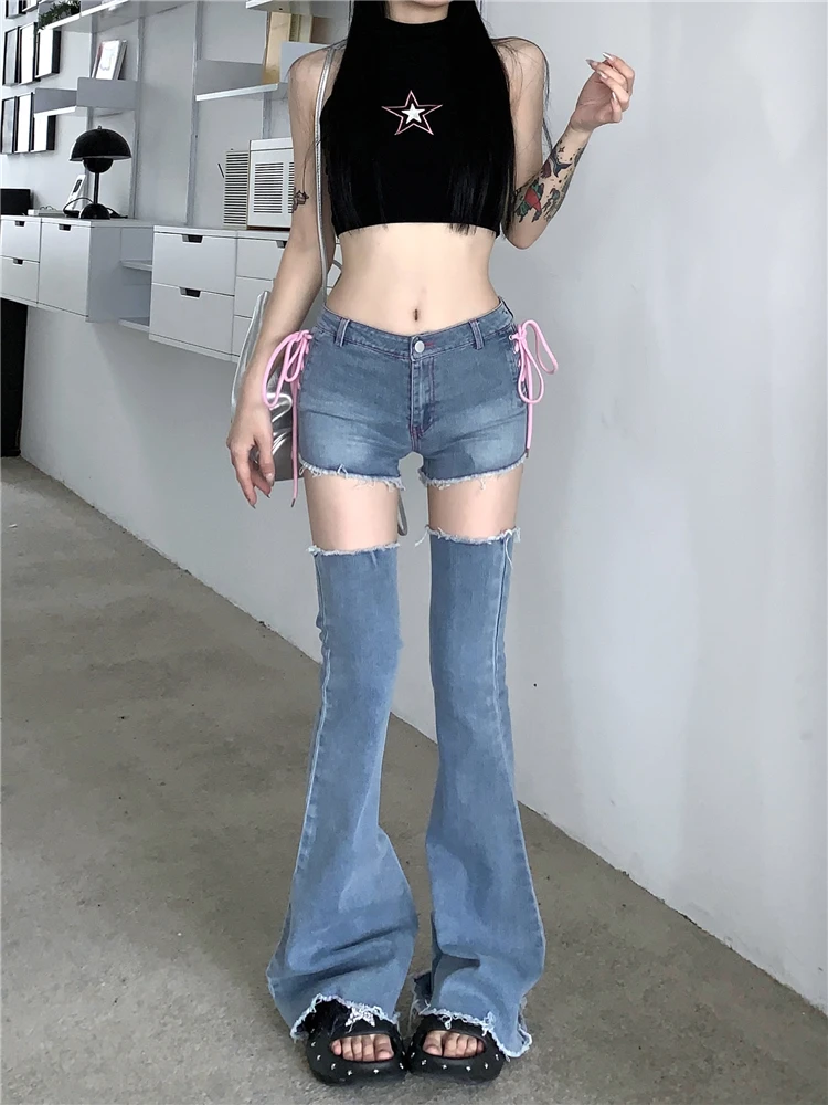 Advbridge - Sweet Cool Hot Girl Jeans Women's Summer Strap Shorts Long Leg Sleeve Slim Fit Sexy Micro Flare Pants Fashion Female Clothes