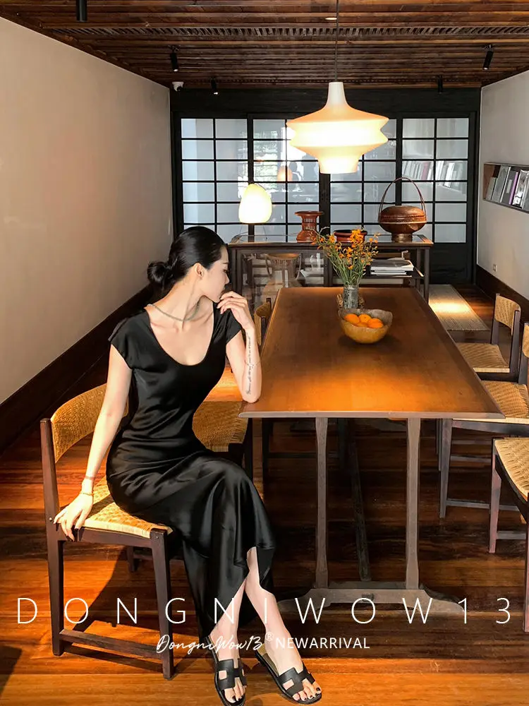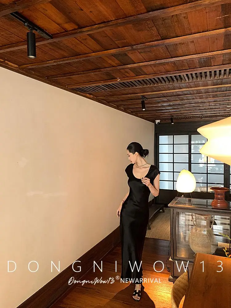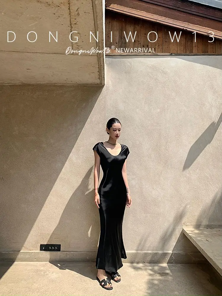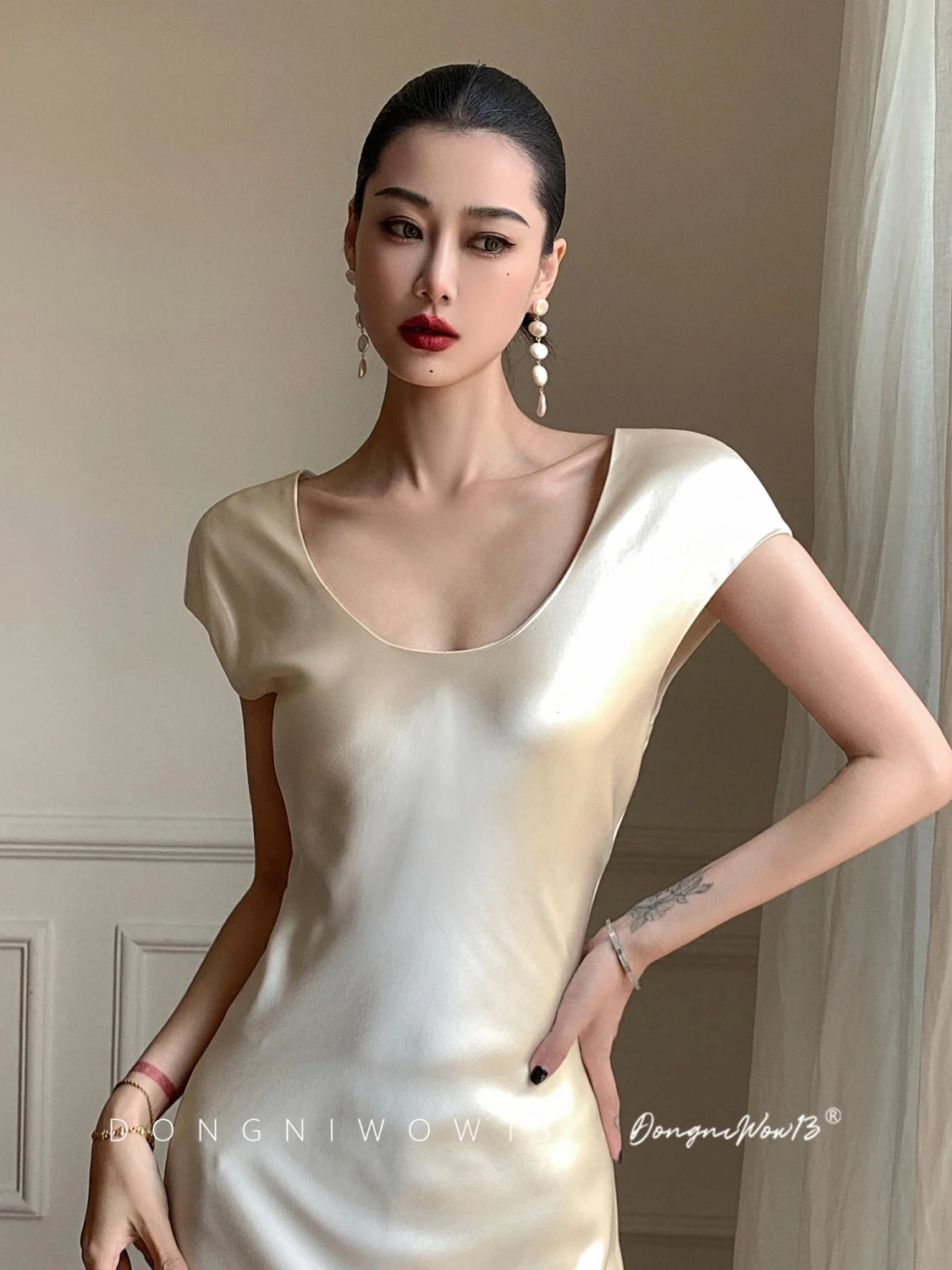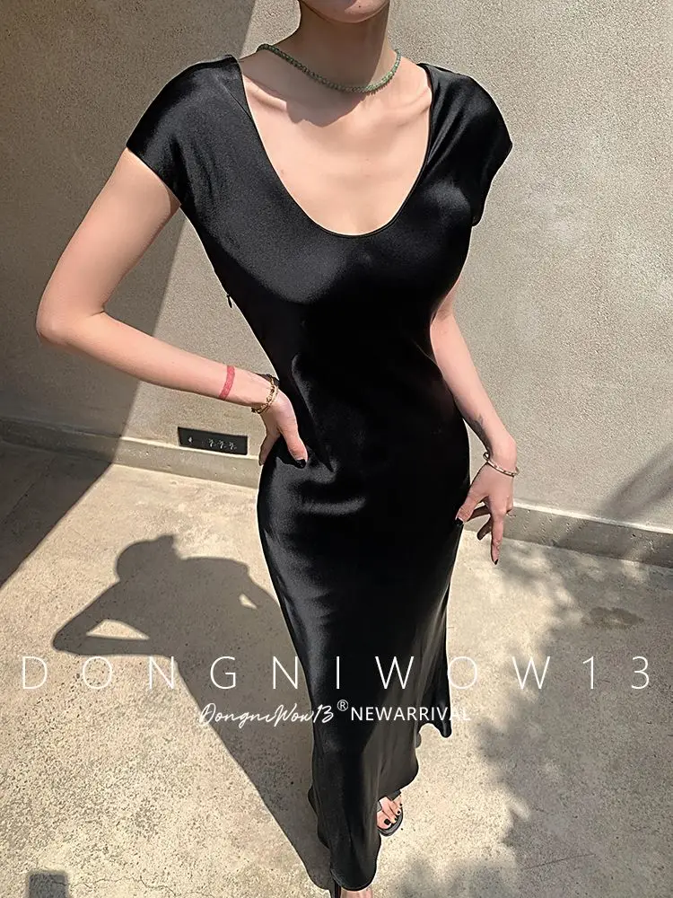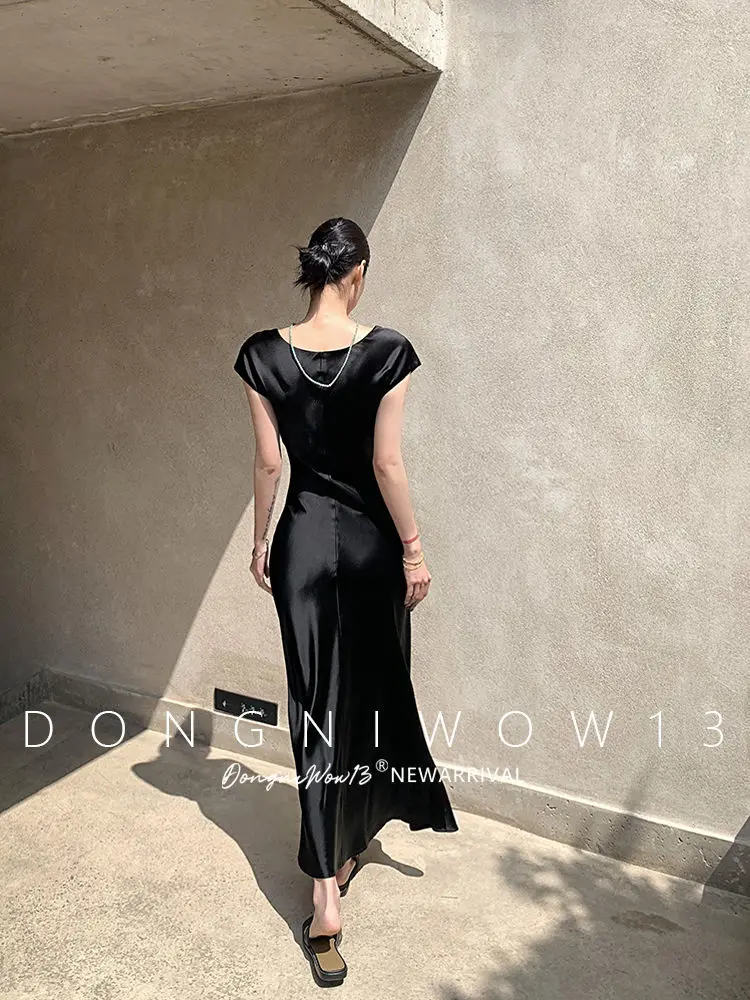 Advbridge - Sweet Hot Girl Acetate Elegant Dress Women's Spring O-neck Satin Flying Sleeve Slim Fit Long Dress Fashion Female Clothes