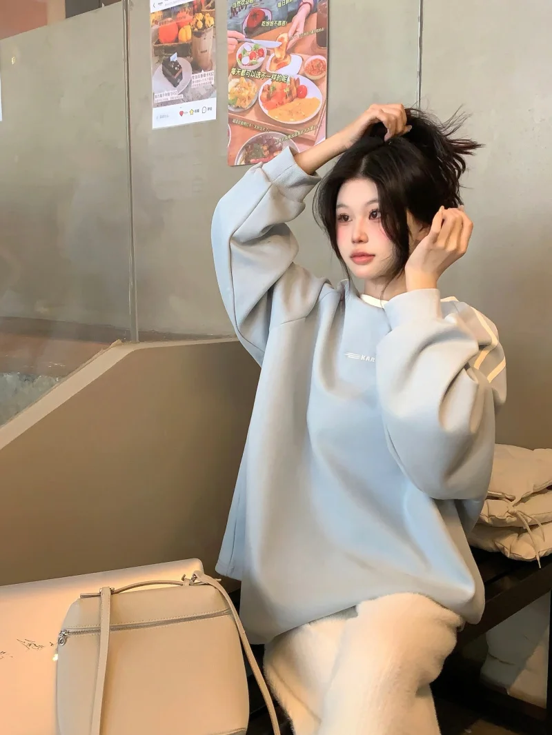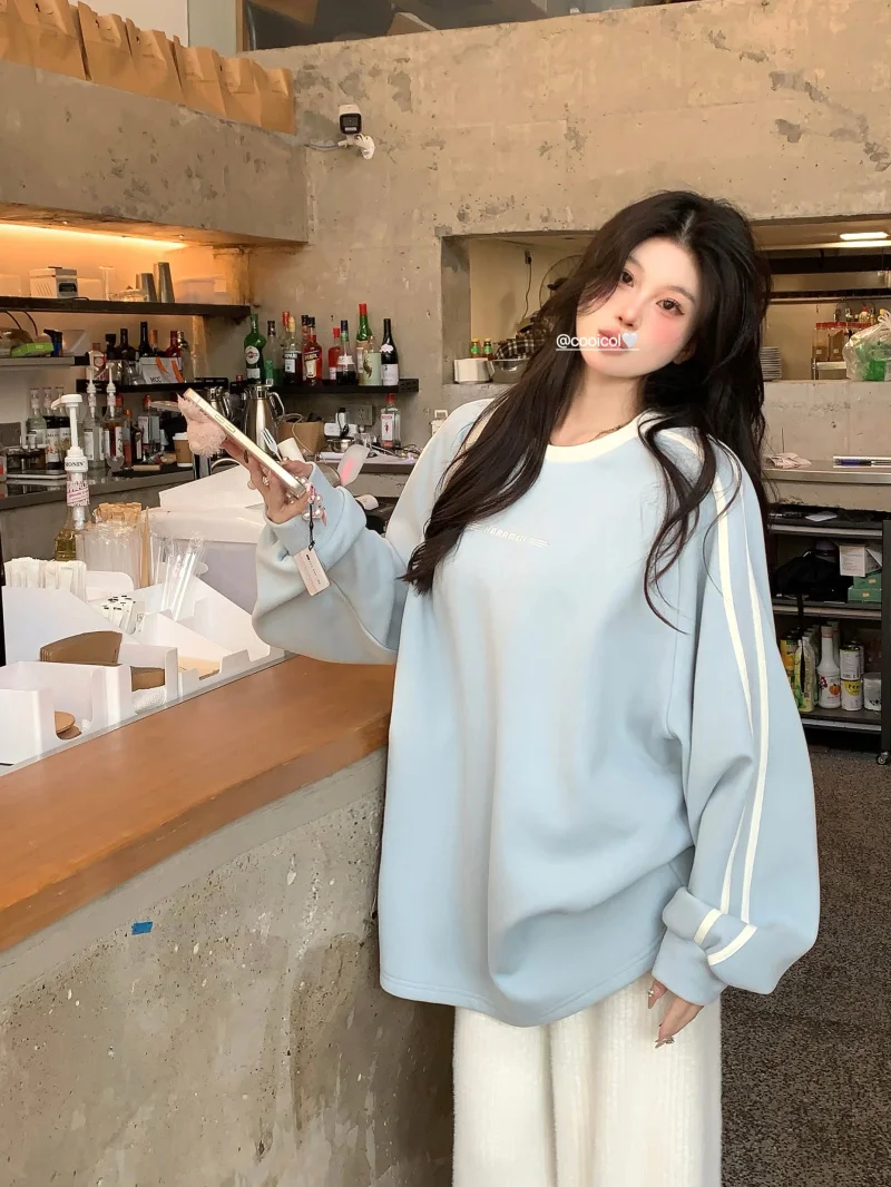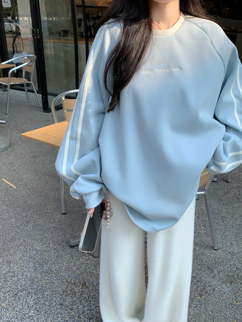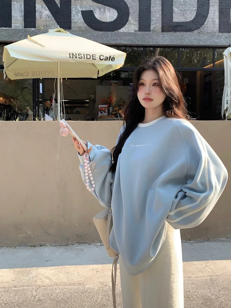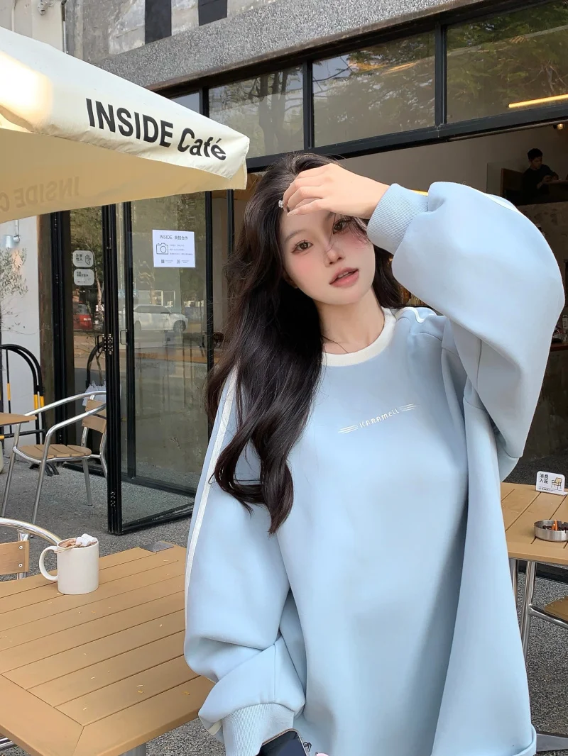 Advbridge - Sweet Hot Girl Letter Embroidered Contrasting O-neck Sweatshirt for Women's Winter Casual Loose Fitting Mid-length Pullover Top