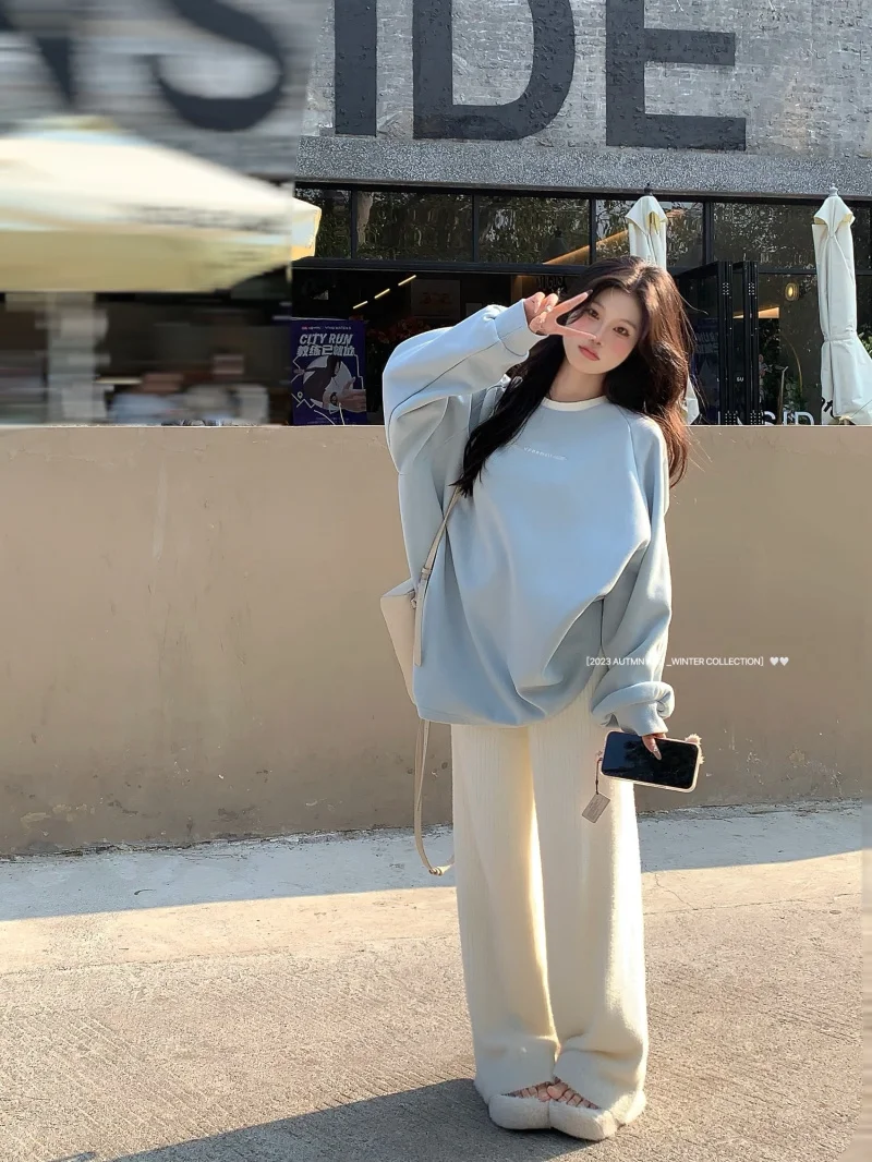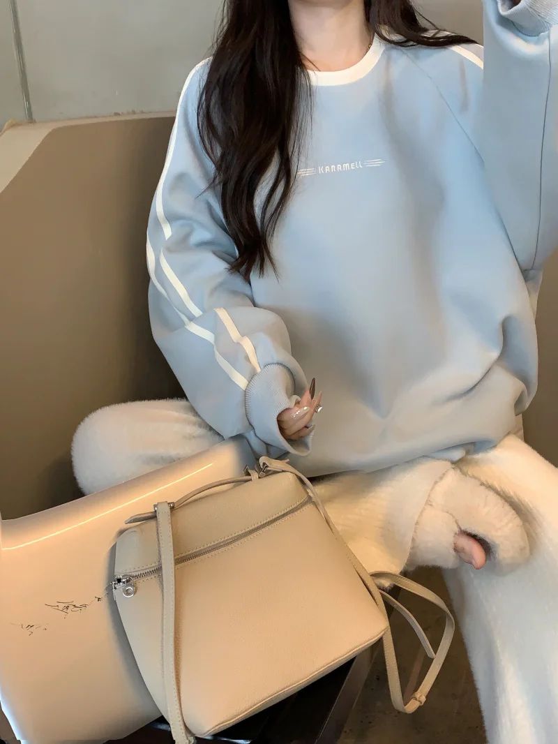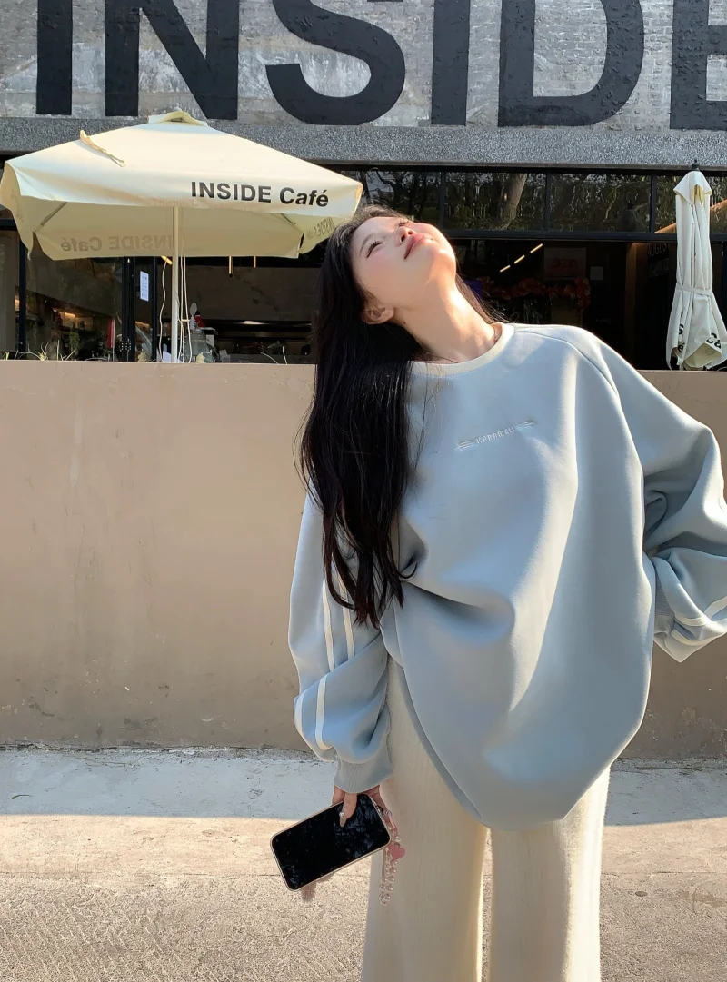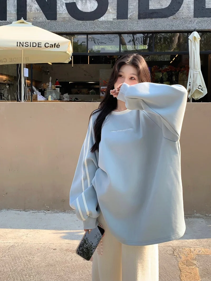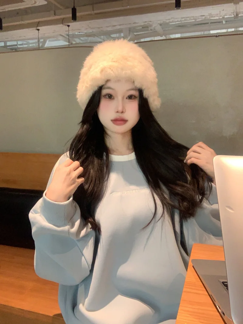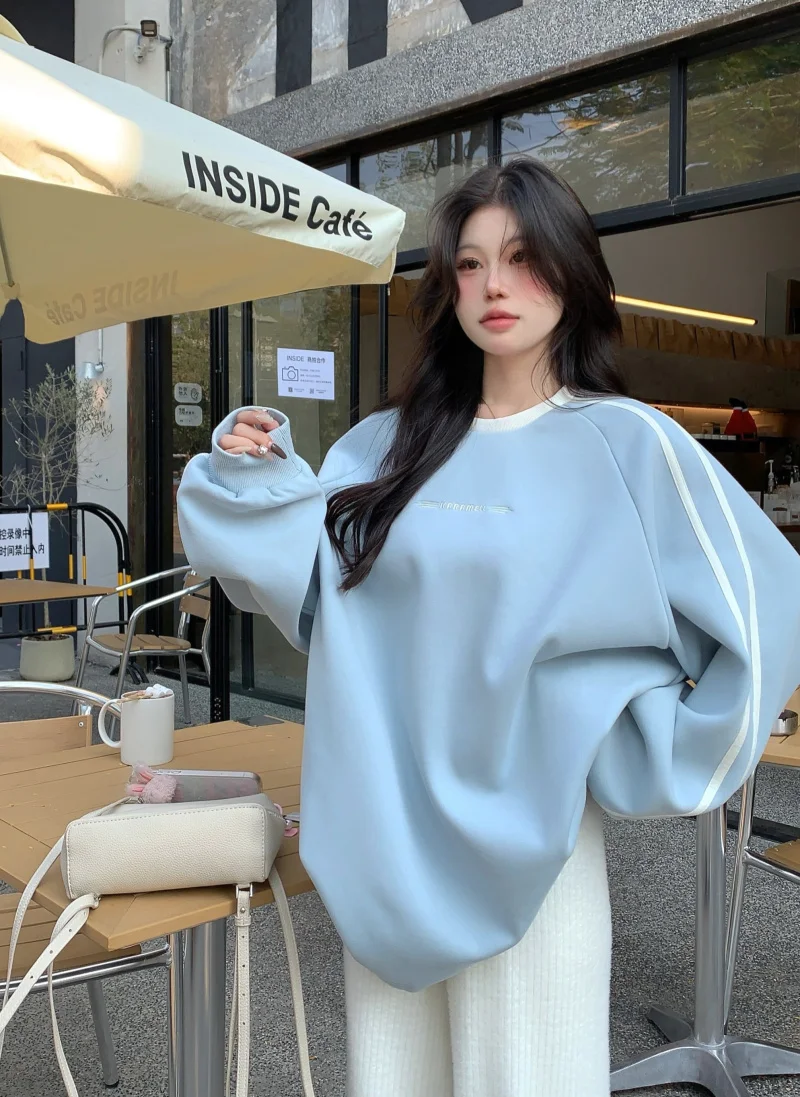 Advbridge - Sweet Hot Girl Letter Embroidered Contrasting O-neck Sweatshirt for Women's Winter Casual Loose Fitting Mid-length Pullover Top