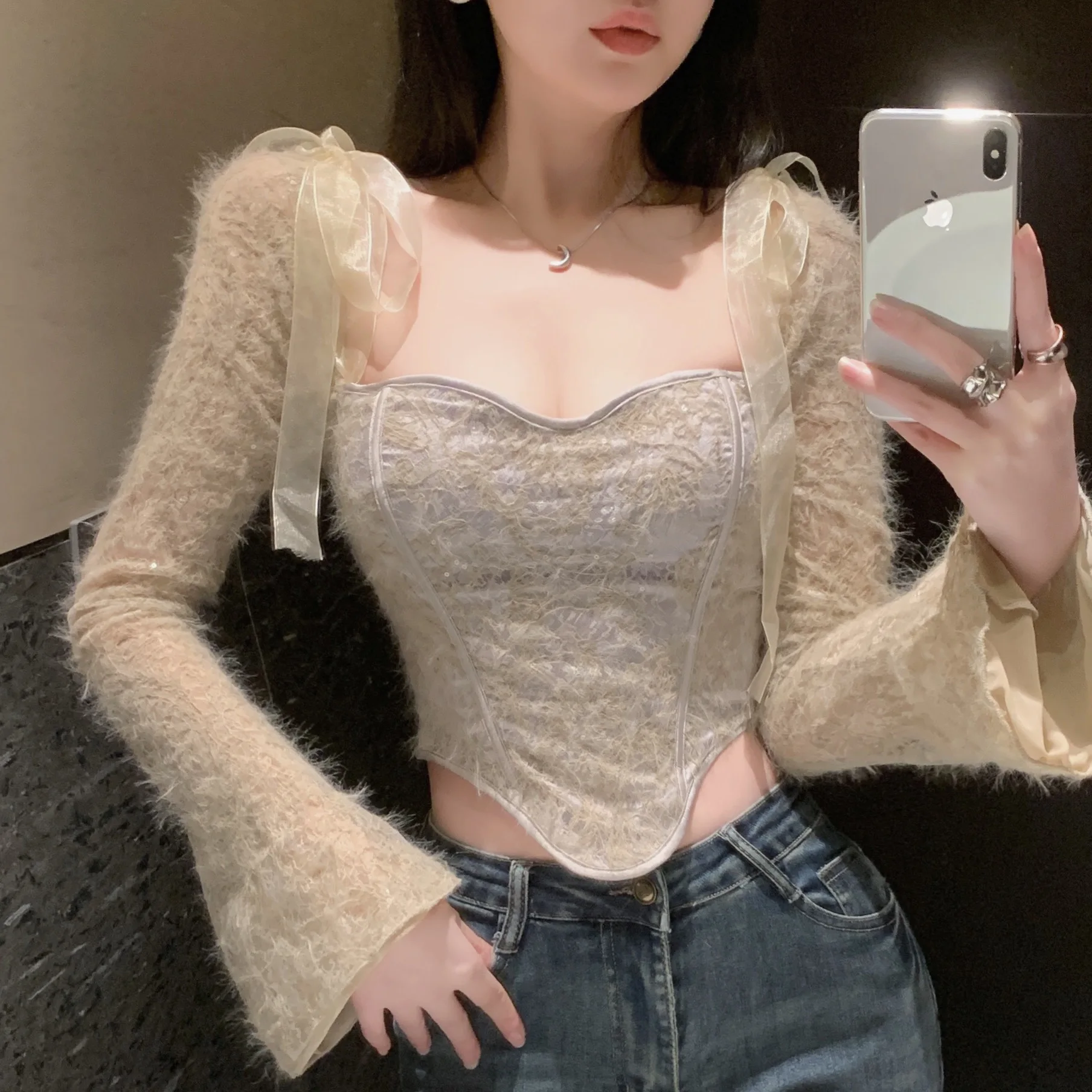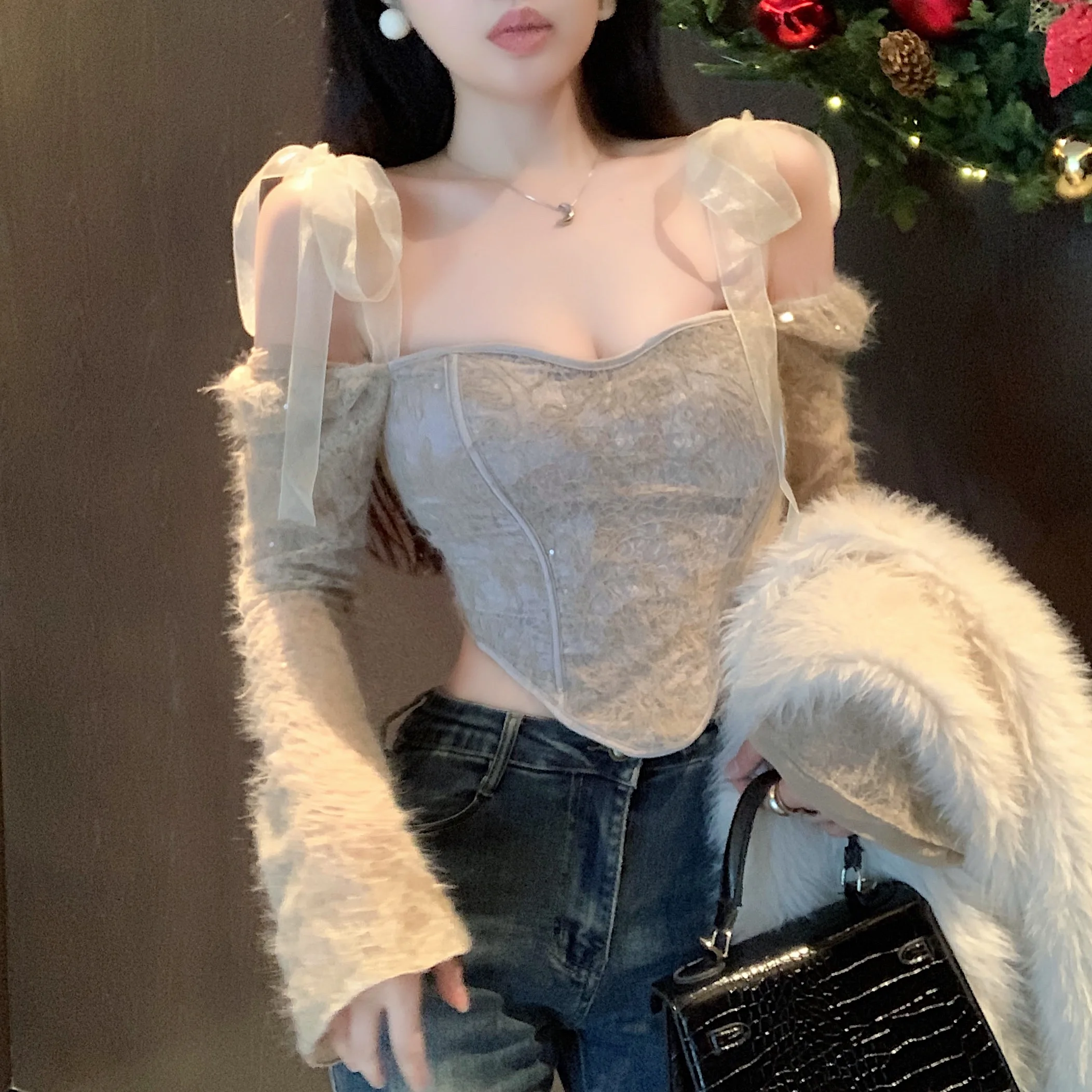 Advbridge - Sweet Hot Girl Off Shoulder Bow Lace-up Top Women's Square Collar Slim Fit Long-sleeved Strap T-shirt Fashion Female Clothes