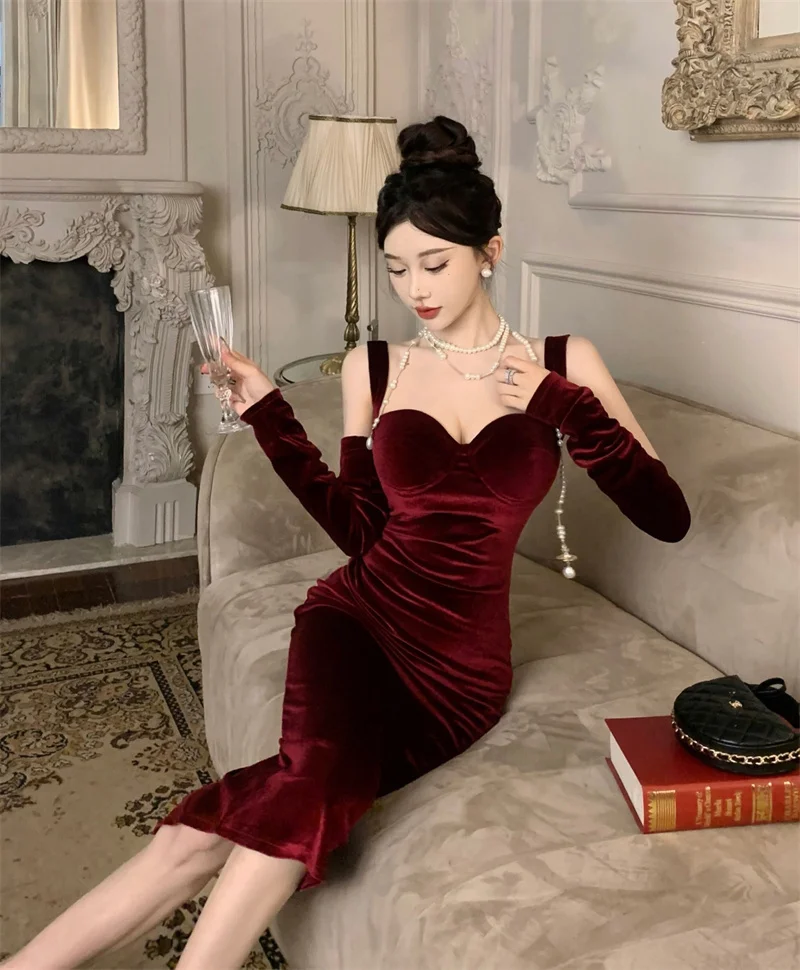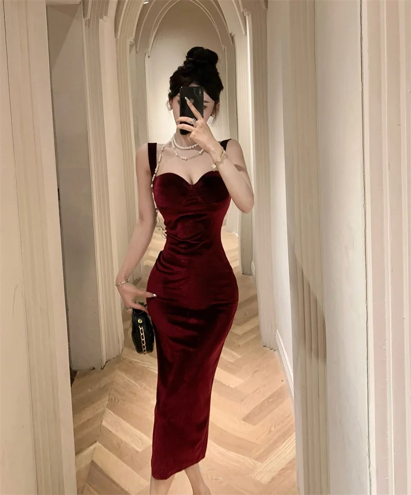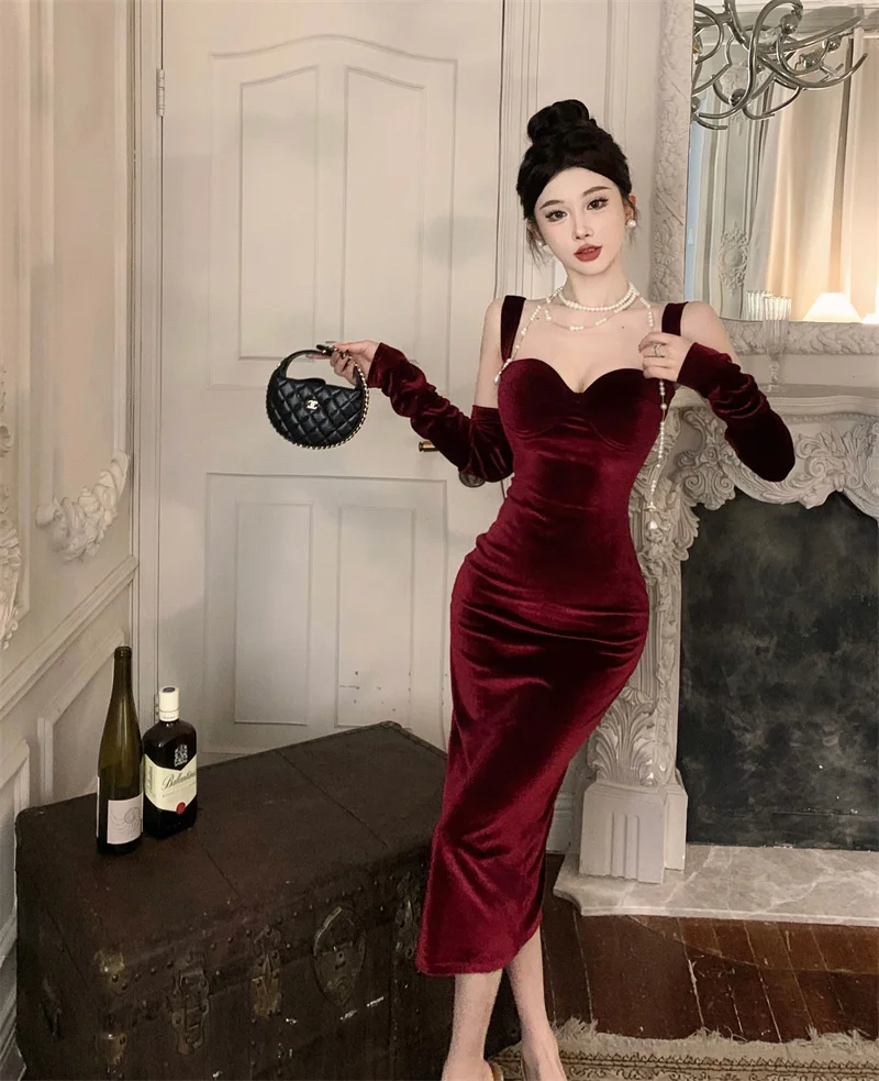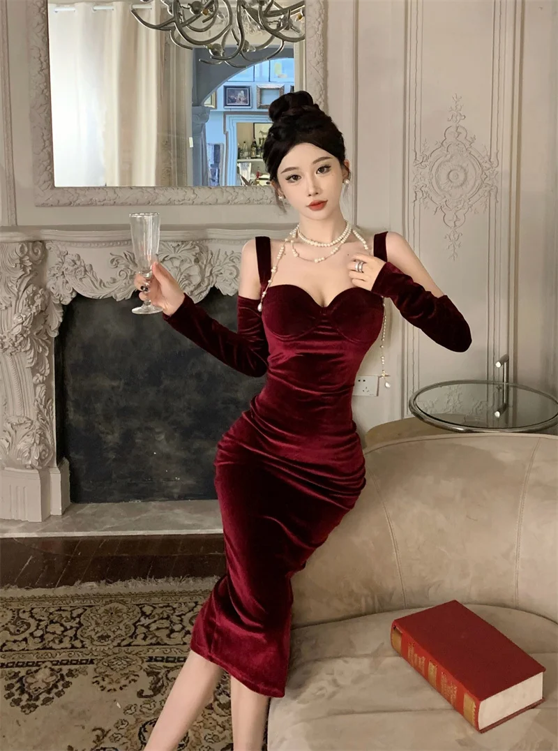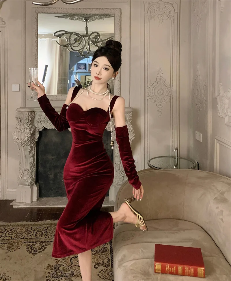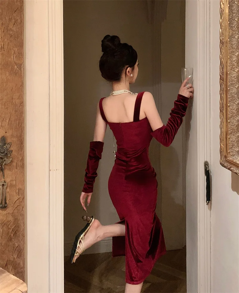 Advbridge - Sweet Hot Girl Retro Sexy Velvet Strap Dress for Women Autumn and Winter Square Collar Split Mermaid Wrap Hip Long Evening Dress
