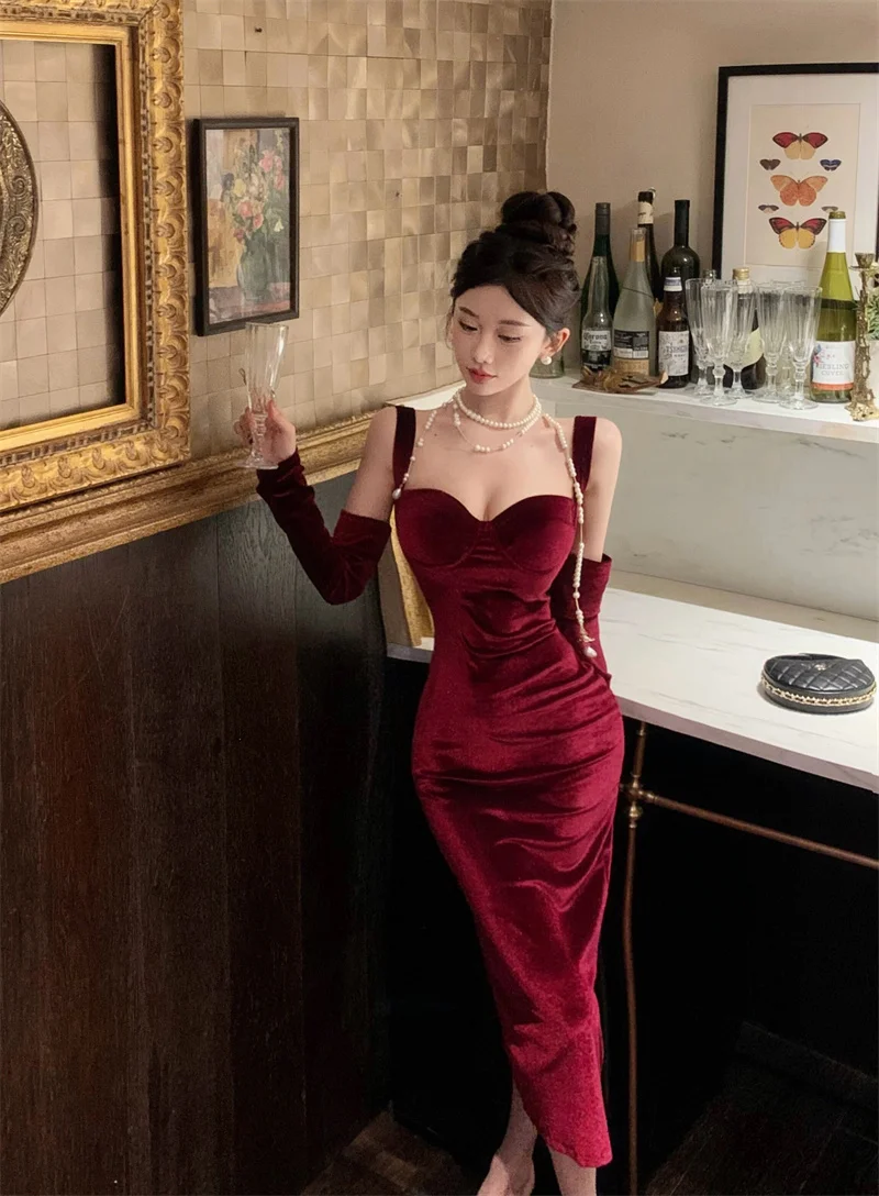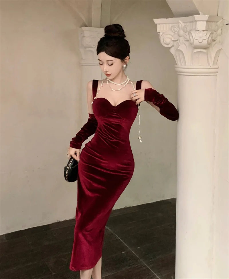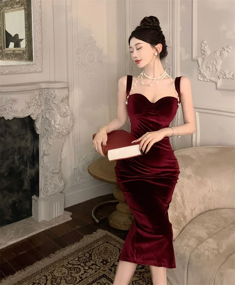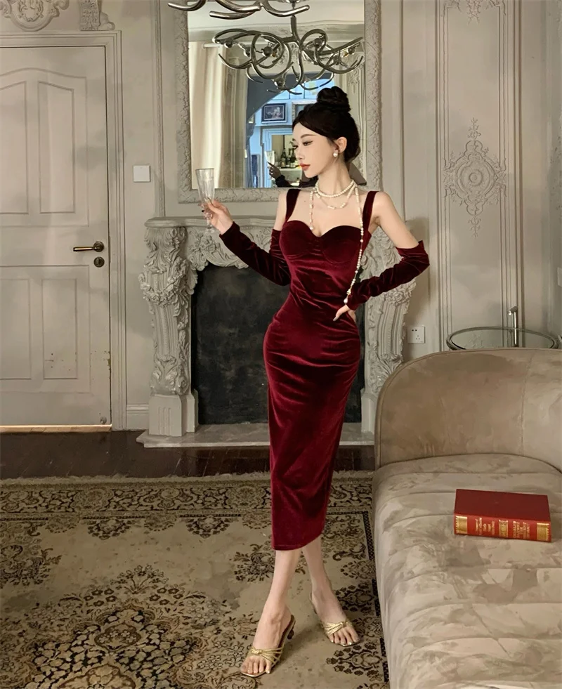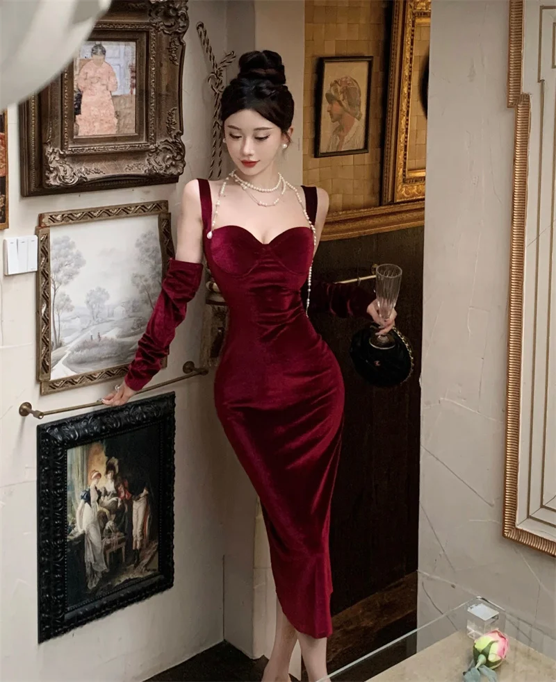 Advbridge - Sweet Hot Girl Retro Sexy Velvet Strap Dress for Women Autumn and Winter Square Collar Split Mermaid Wrap Hip Long Evening Dress
