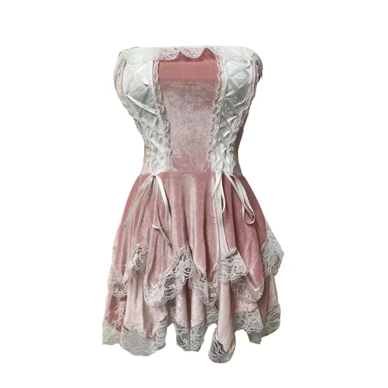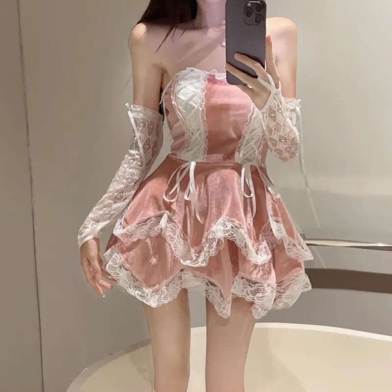 Advbridge - Sweet Hot Girl Sexy Strapless Dress Women's Autumn and Winter Lace Spliced Flower Bud A-line Short Dress Fashion Female Clothes