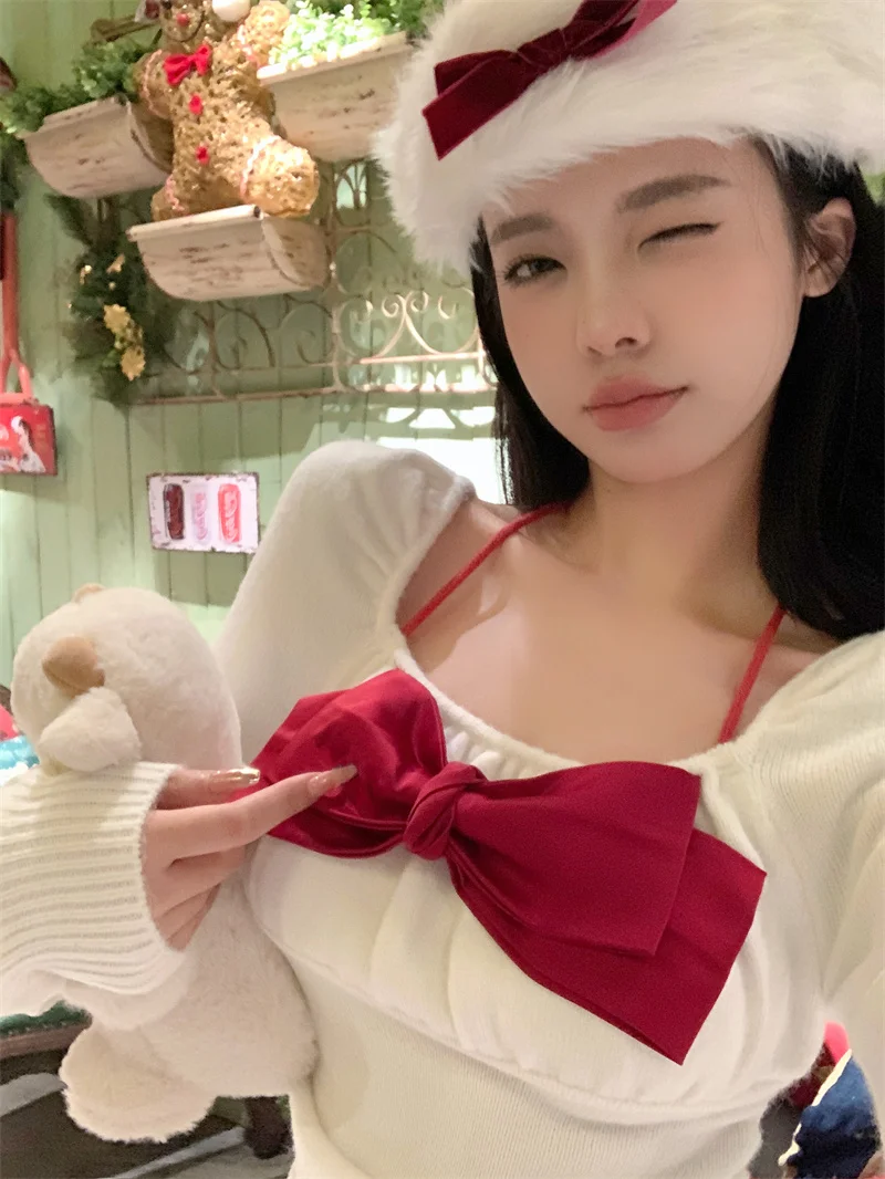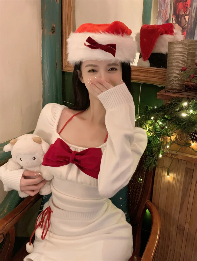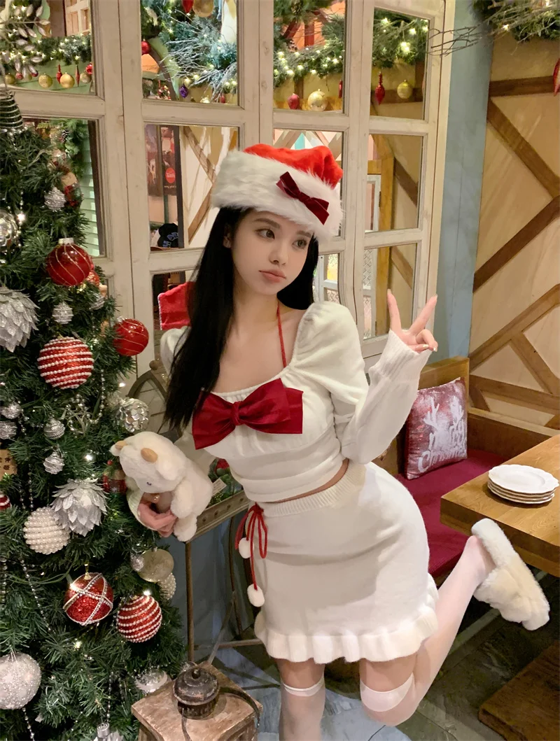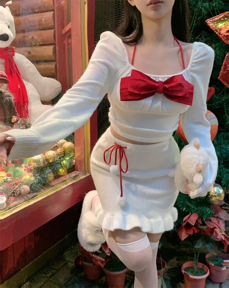 Advbridge - Sweet Hot Girl Suit Women's Autumn and Winter Bow Tie Halter Neck Sweater High Waisted Short Skirt Two-piece Set Female Clothes