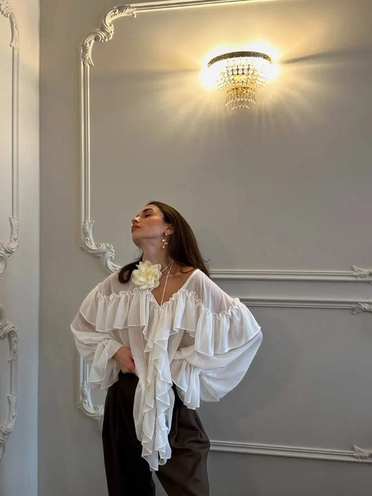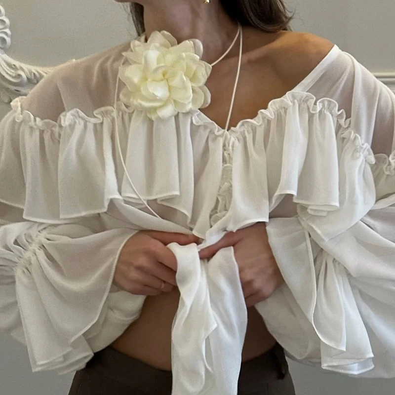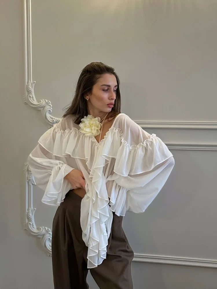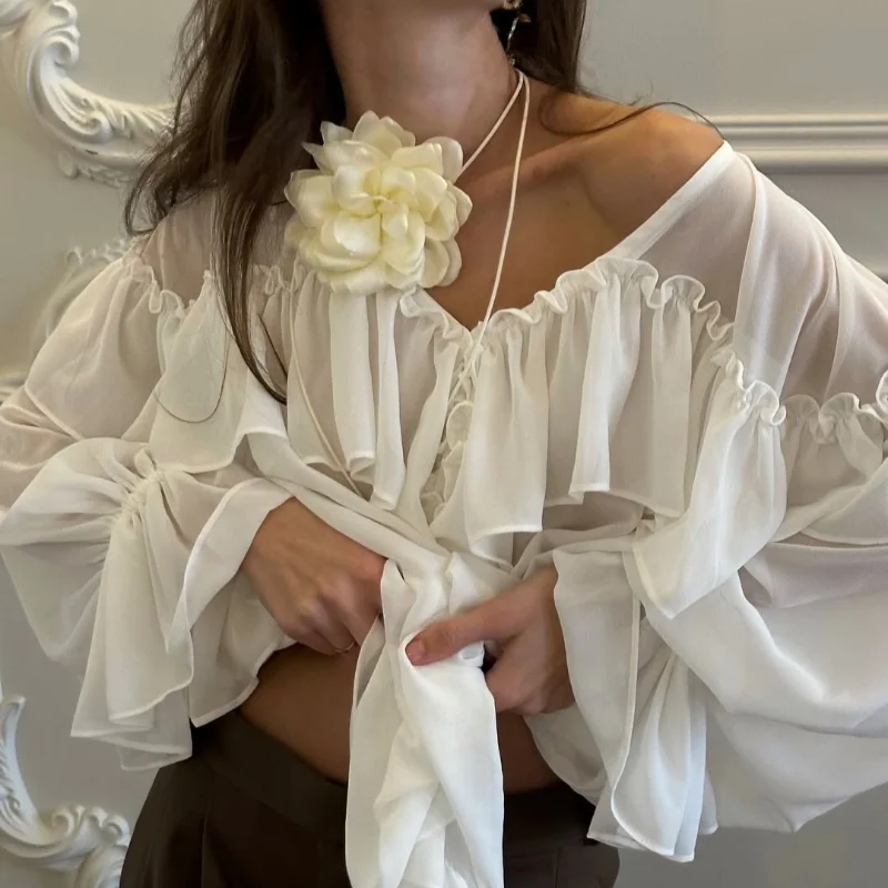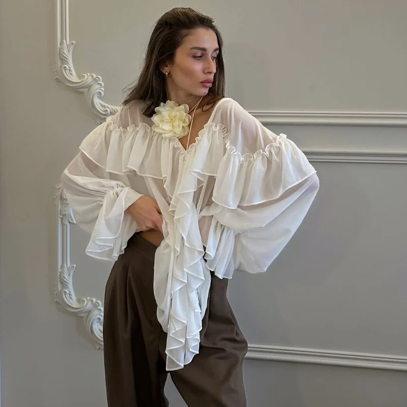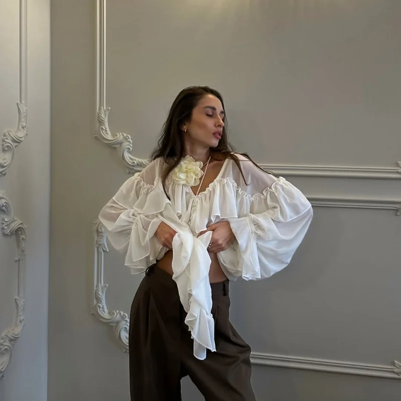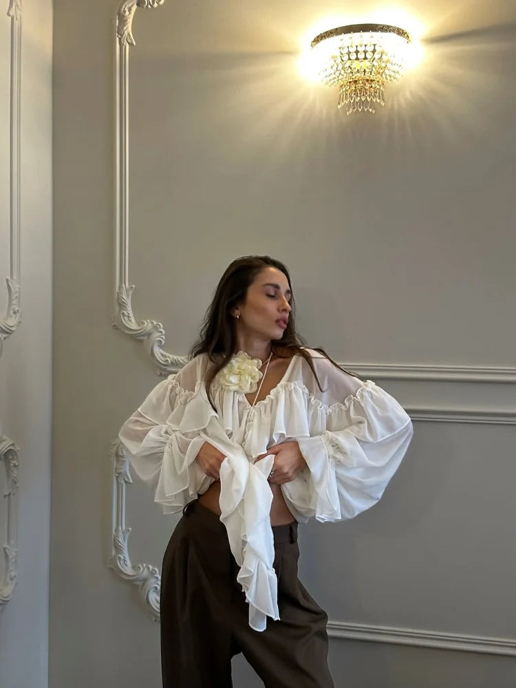 Advbridge V-neck Puff Sleeve Solid Color Pleat Women's Top Sexy Perspective Long Sleeve Loose Shirt New High Street Casual Commuter Blouse