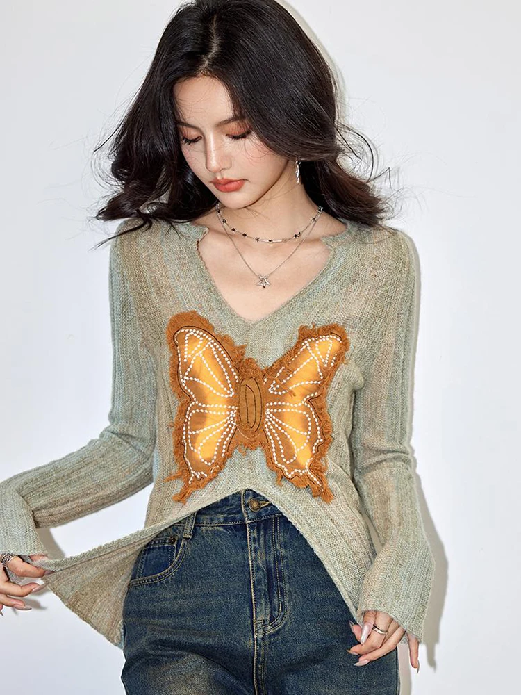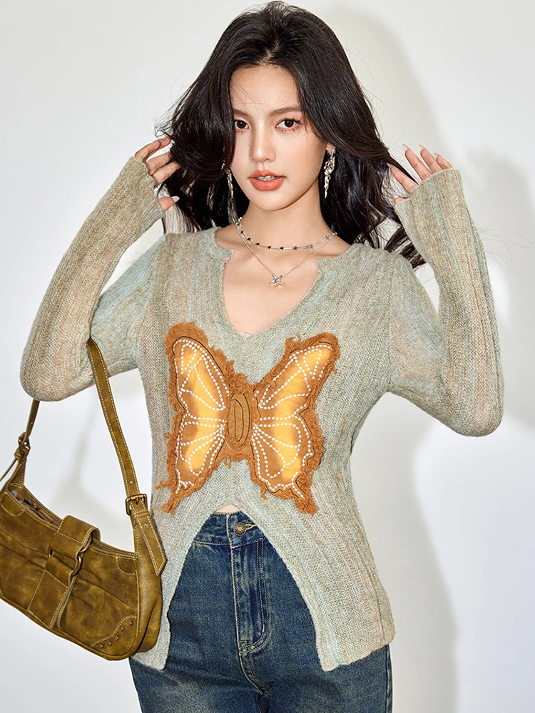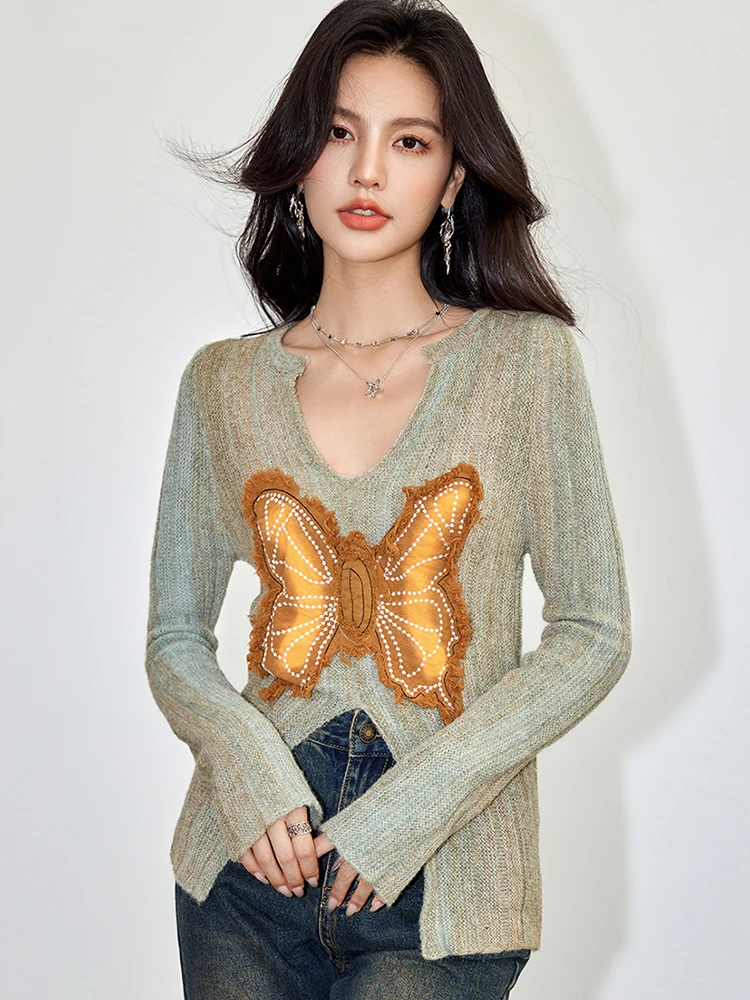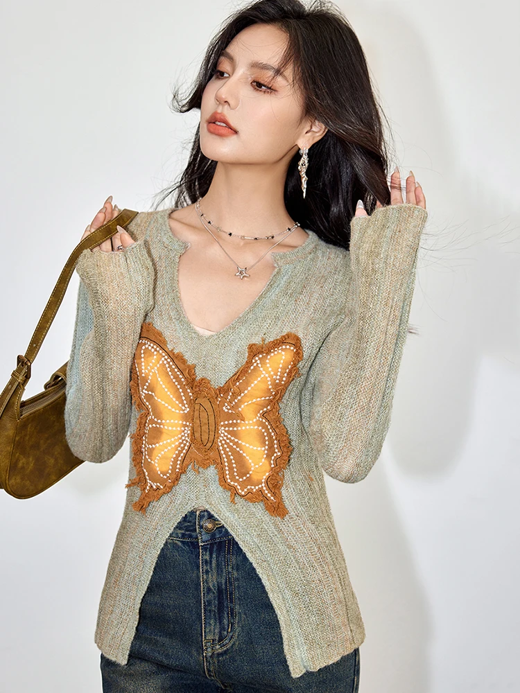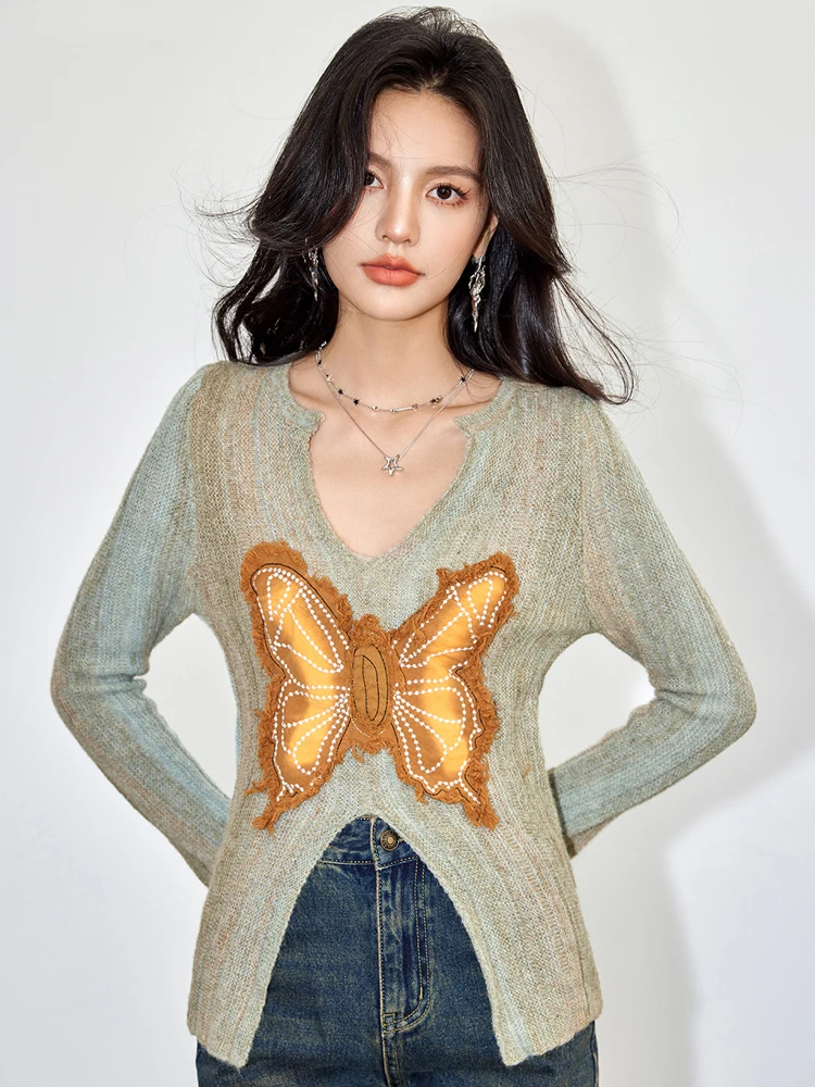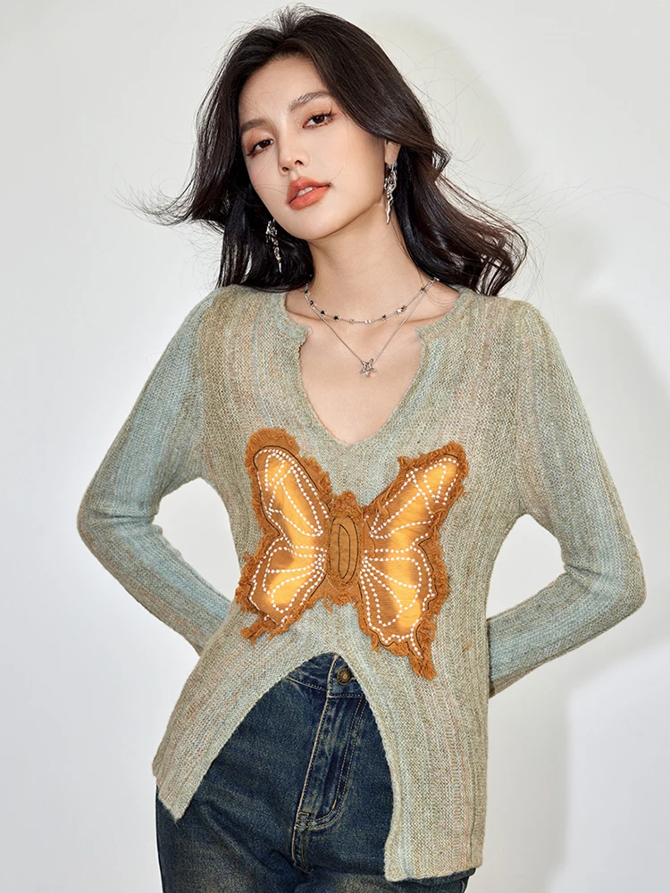Advbridge Vintage Butterfly Patch Embroidery Sweaters Women Autumn New Gradient Split Pullovers V-neck Slim Fit Knitted Tops Y2k