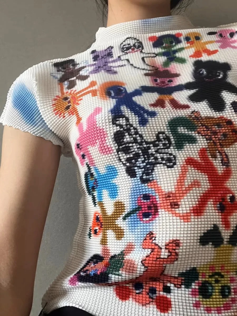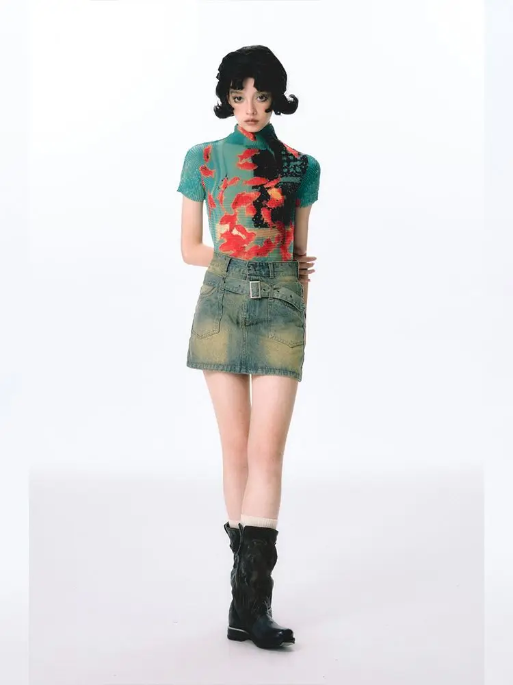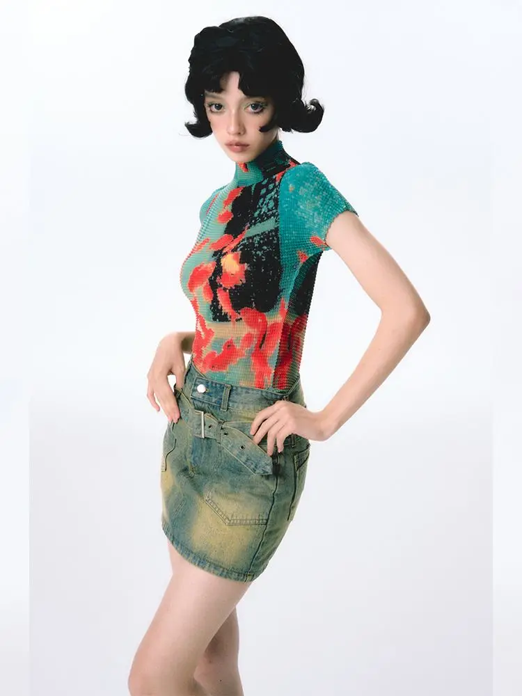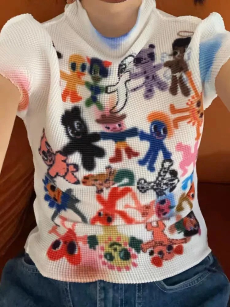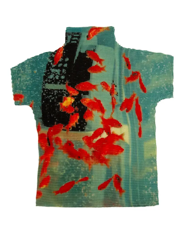 Advbridge Vintage Fish Print American Folds Tees Summer Camisetas Irregular Slim Waist Tops Turtleneck Y2k Women Tshirts