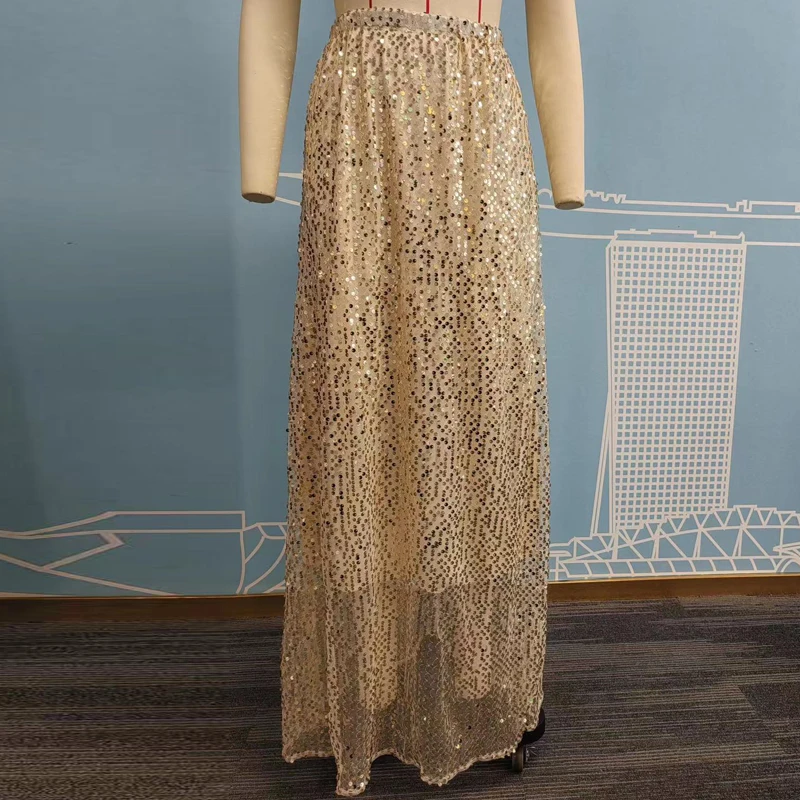 Advbridge - Women Fashion Shiny Sequin Long Skirts Elegant High Waist Pleated Solid Color Party Skirt Spring Autumn Casual Slim Beach Skirts