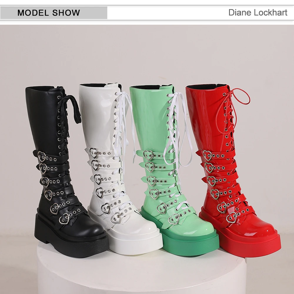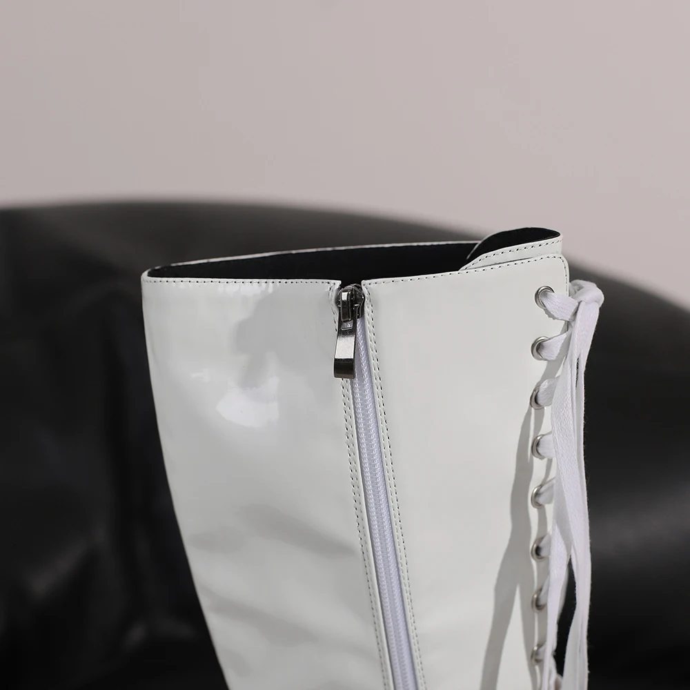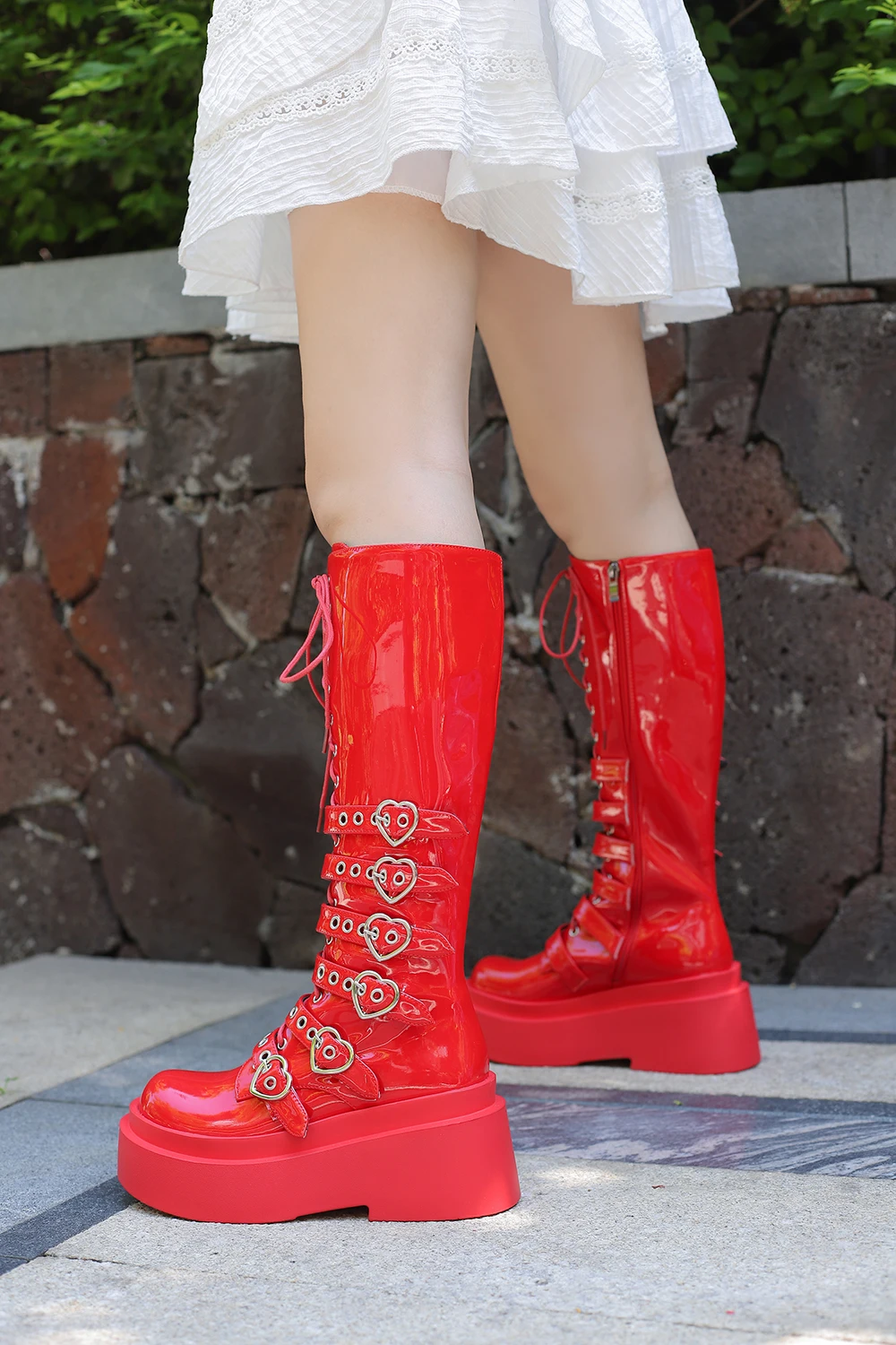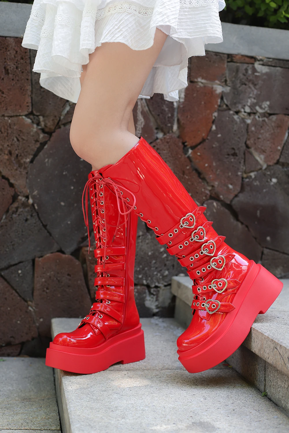 Advbridge Women‘s Thick Bottom Motorcycle Boots Women Punk Knee High Boots Autumn Winter Patent Woman Lace-up Casual Boots Red Size 34-44