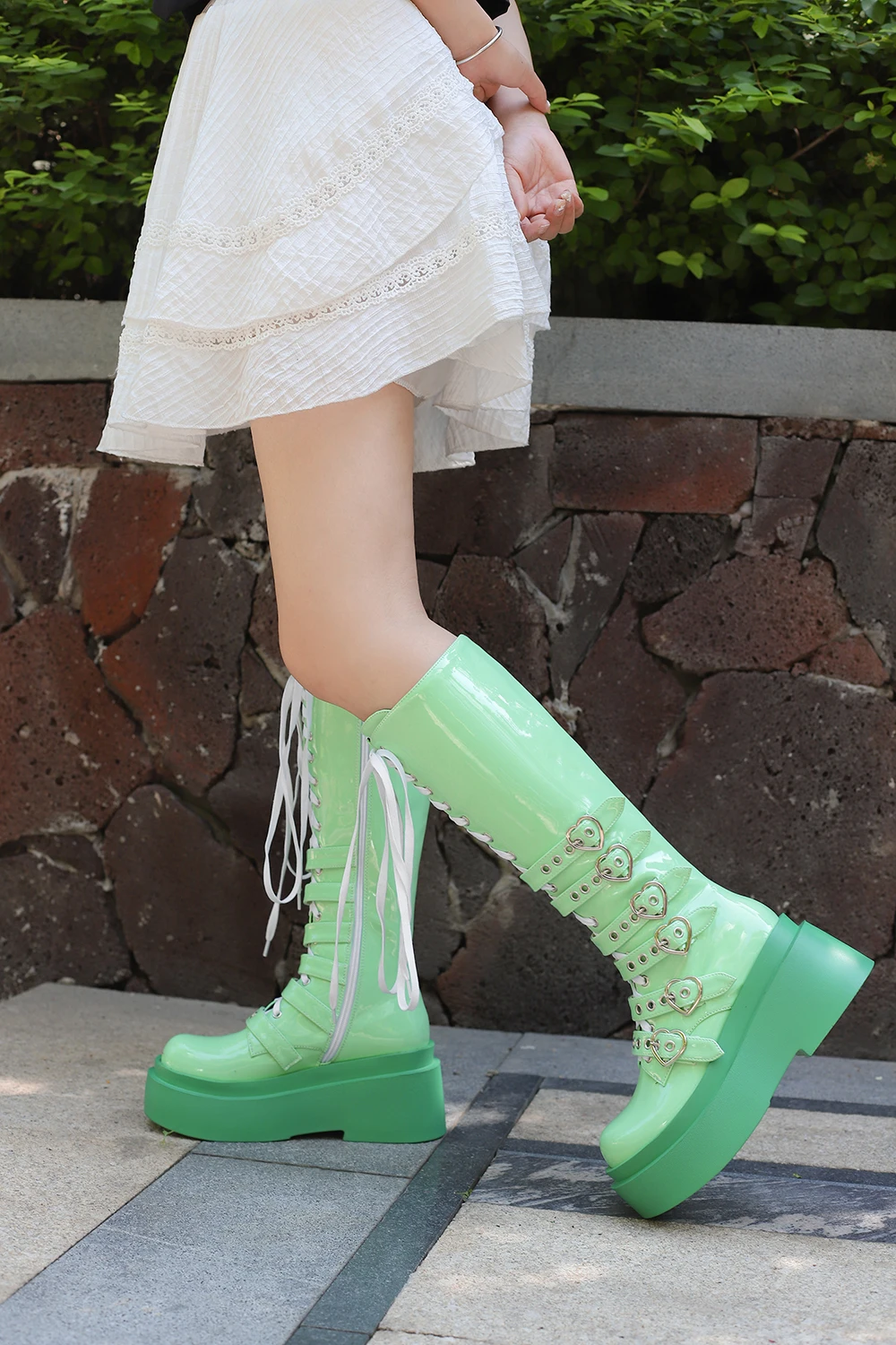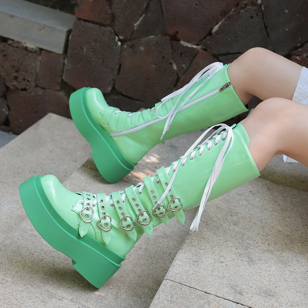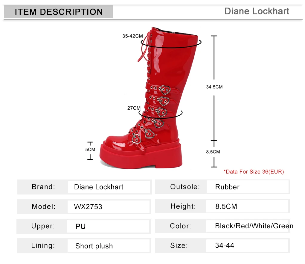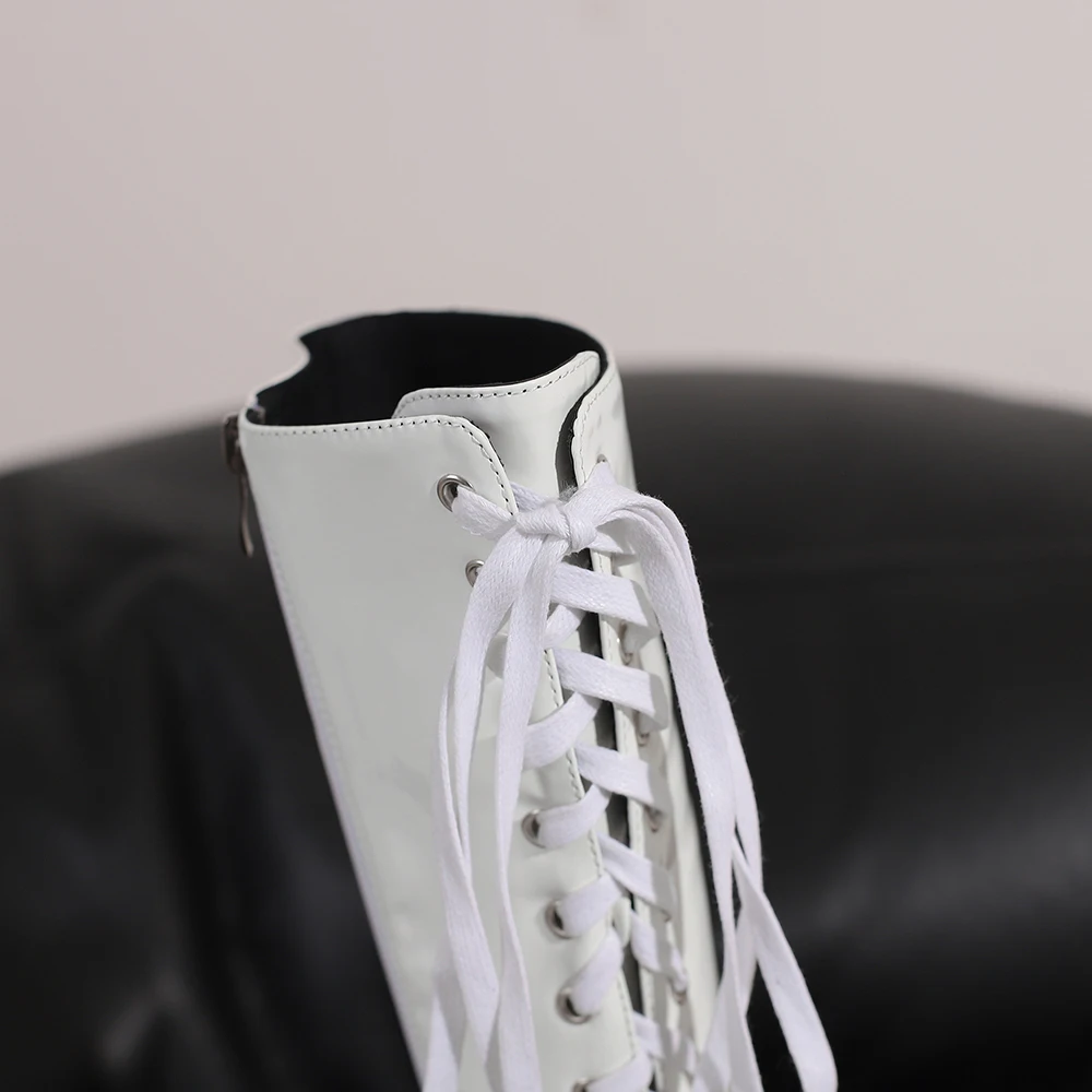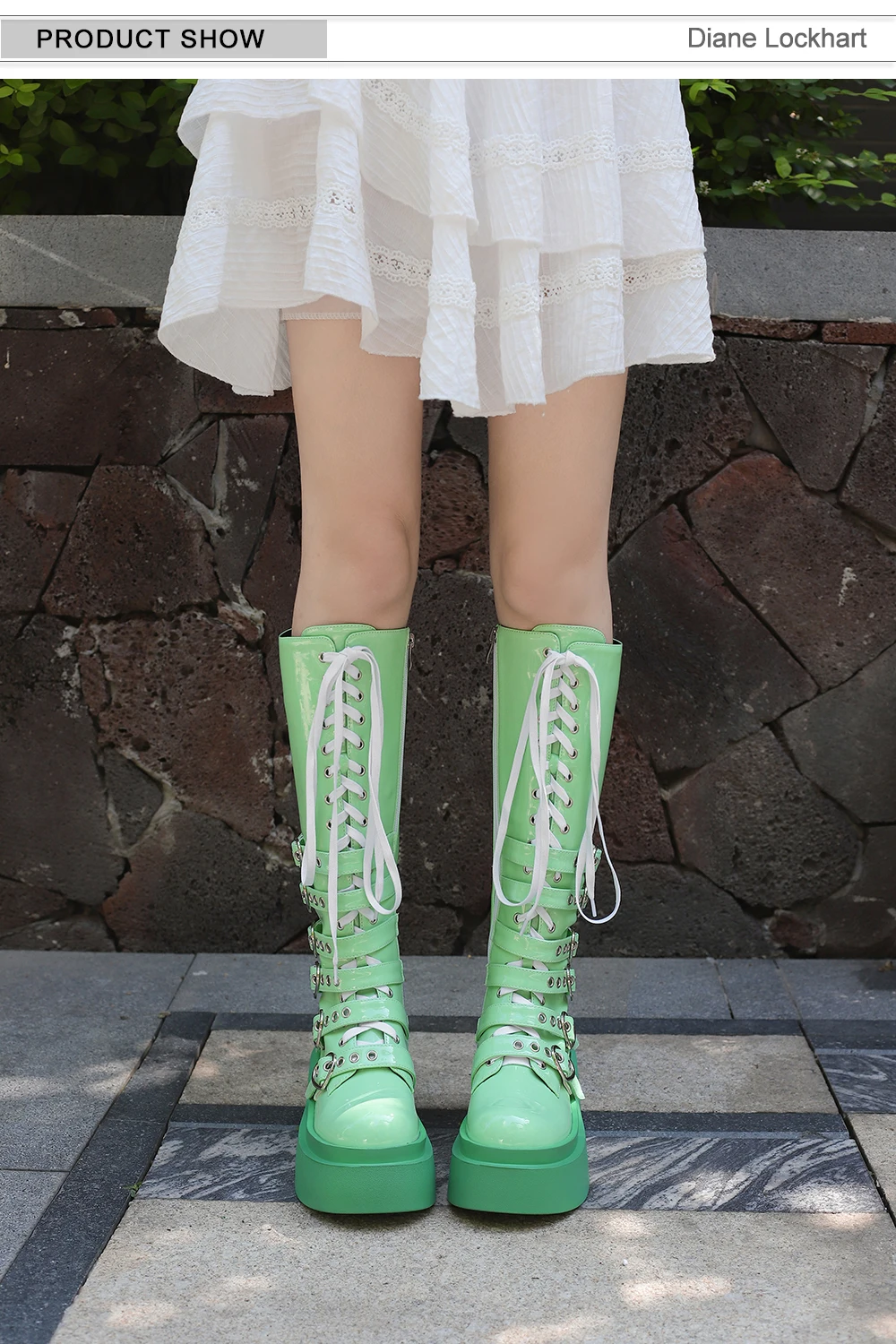 Advbridge Women‘s Thick Bottom Motorcycle Boots Women Punk Knee High Boots Autumn Winter Patent Woman Lace-up Casual Boots Red Size 34-44