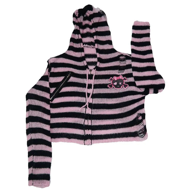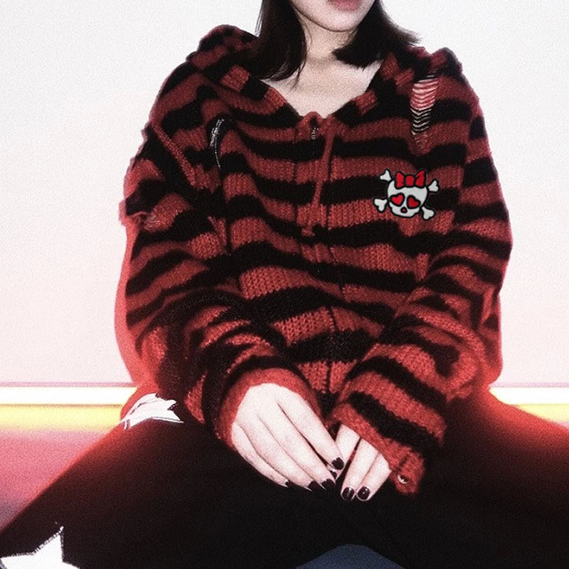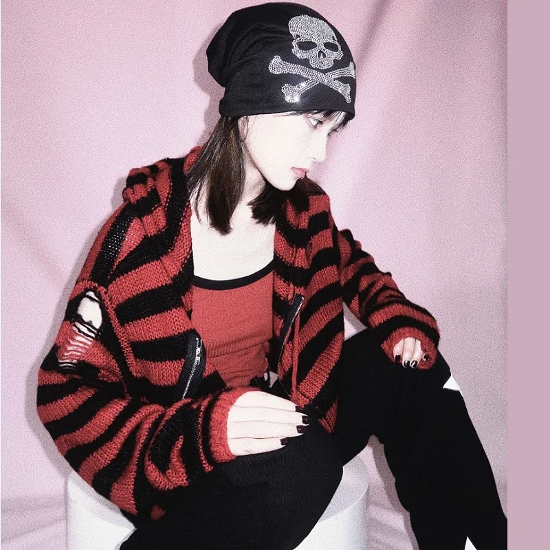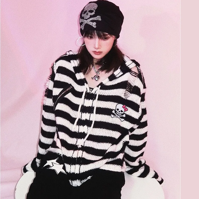 Advbridge Women Sweater Harajuku Gothic Girl Skull Striped Knitted Sweater Punk Rock Zipper Loose Hooded Short Cardigan Chic Streetwear