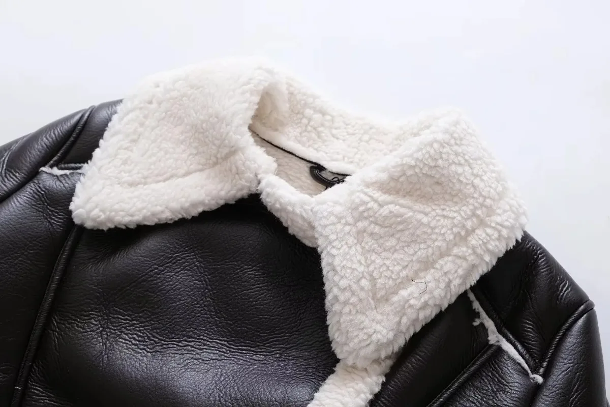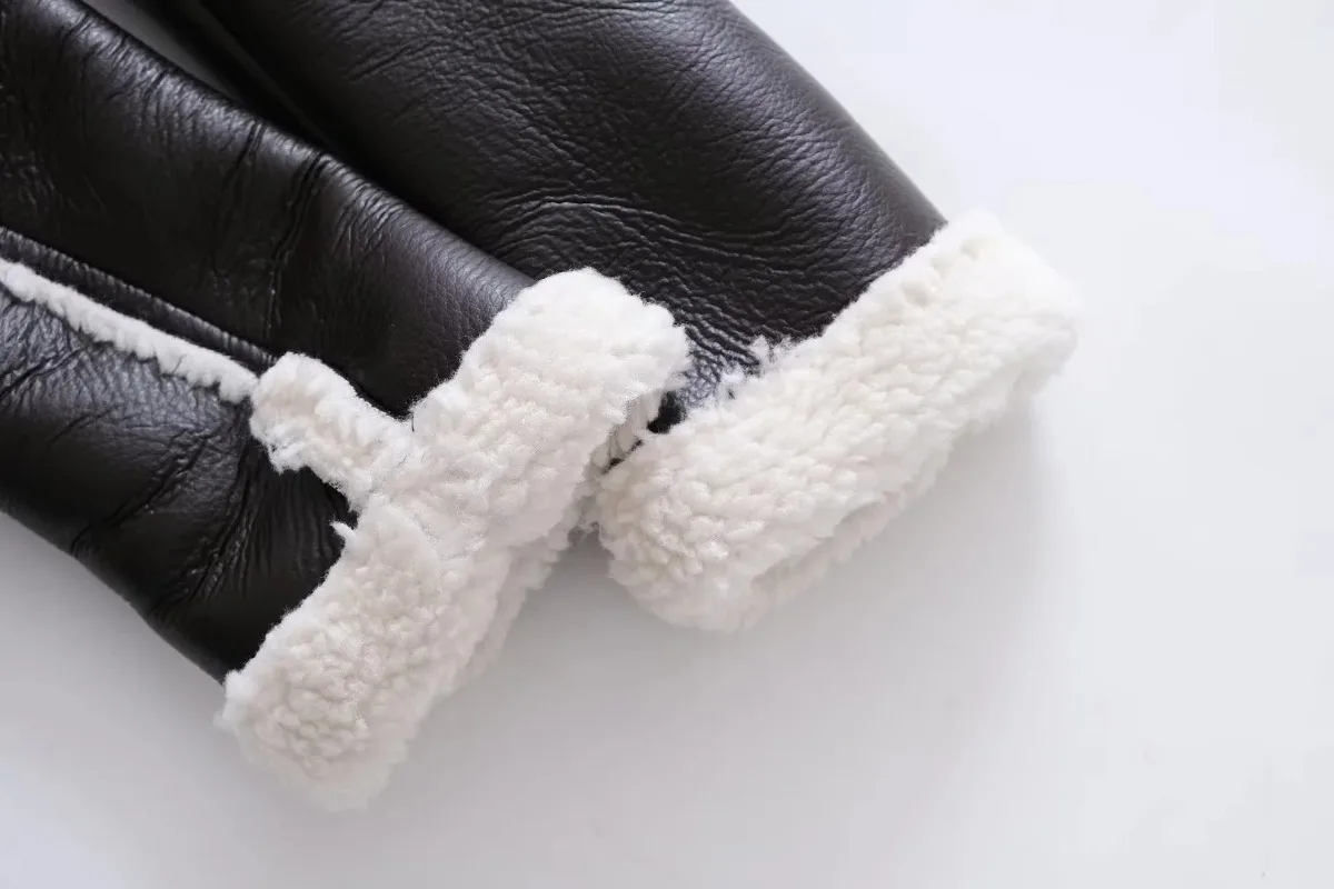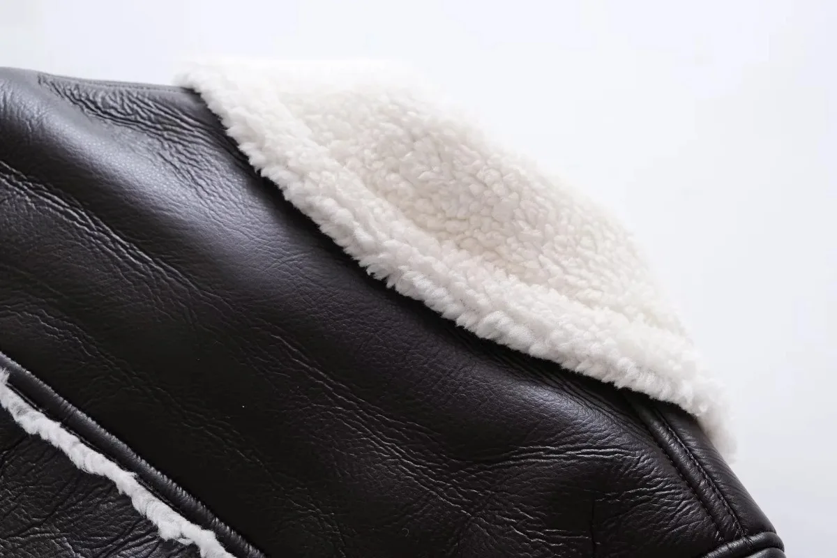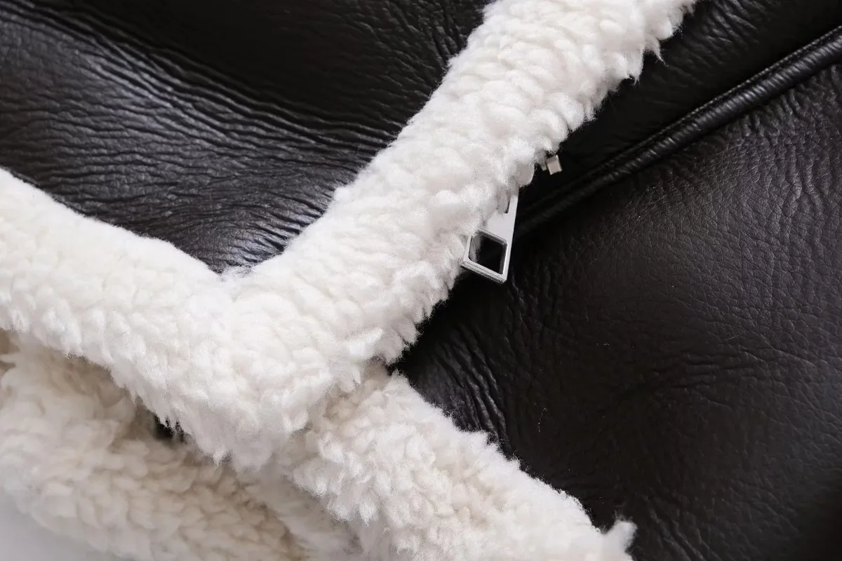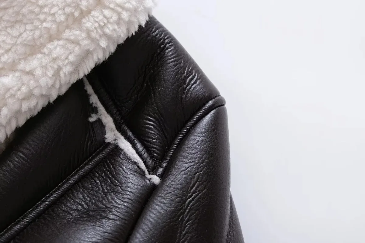 ADVBRIDGE Women Thick Lambswool Patchwork PU Leather Short Jacket Fashion Double Sided Lapel Long Sleeve Warm Winter Coats Street Outwear