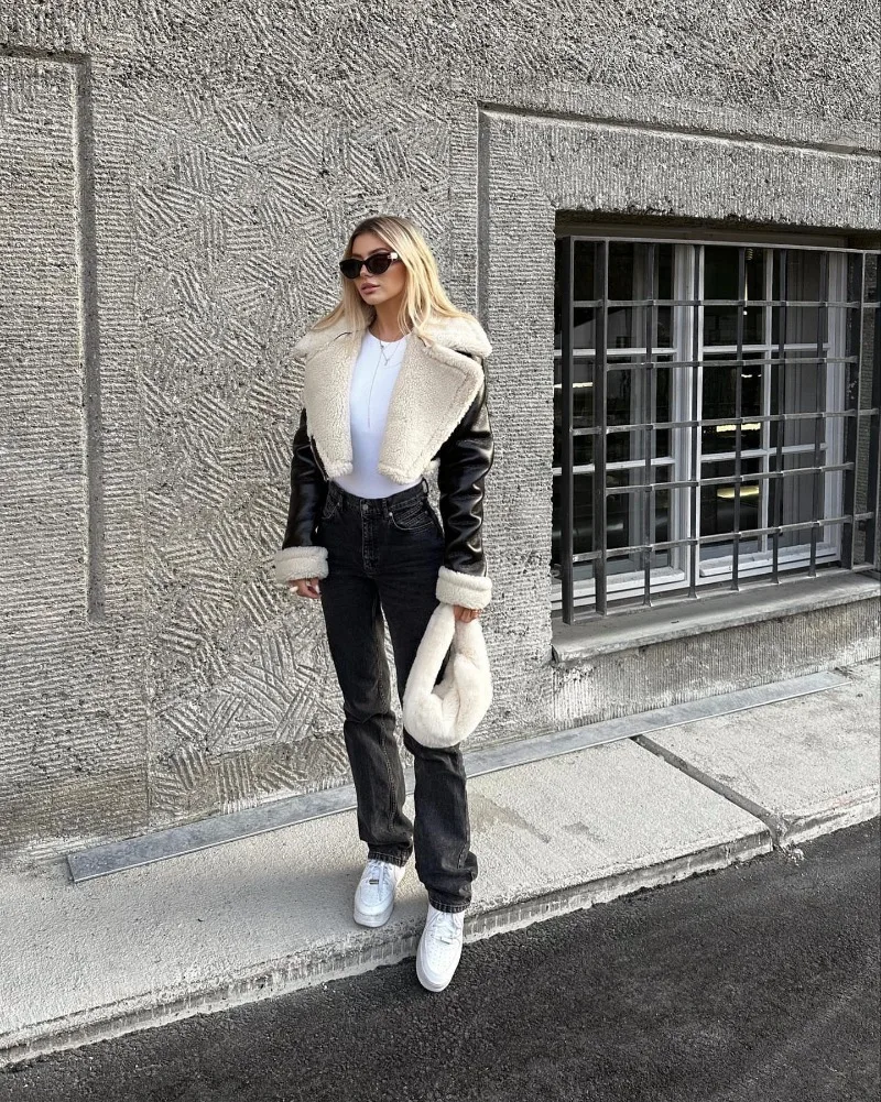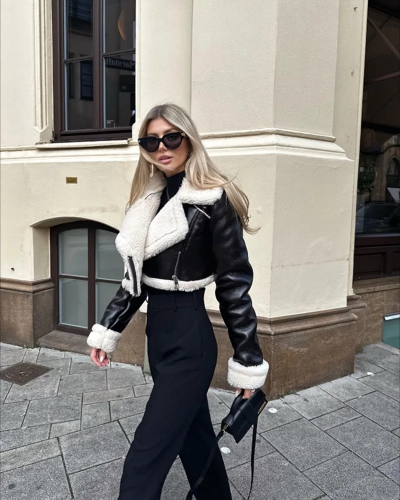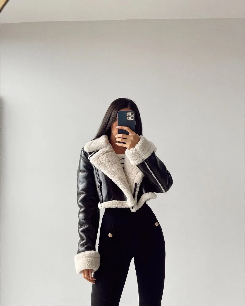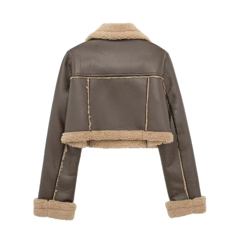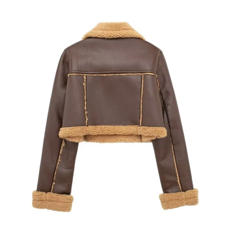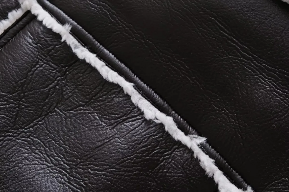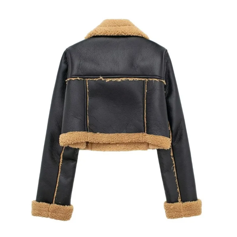 ADVBRIDGE Women Thick Lambswool Patchwork PU Leather Short Jacket Fashion Double Sided Lapel Long Sleeve Warm Winter Coats Street Outwear