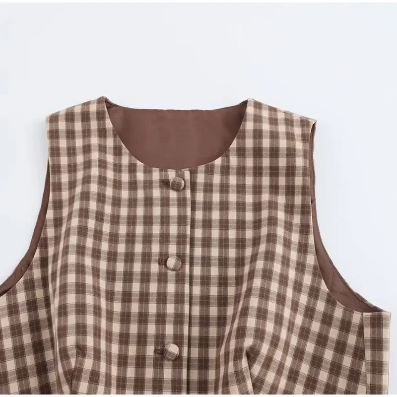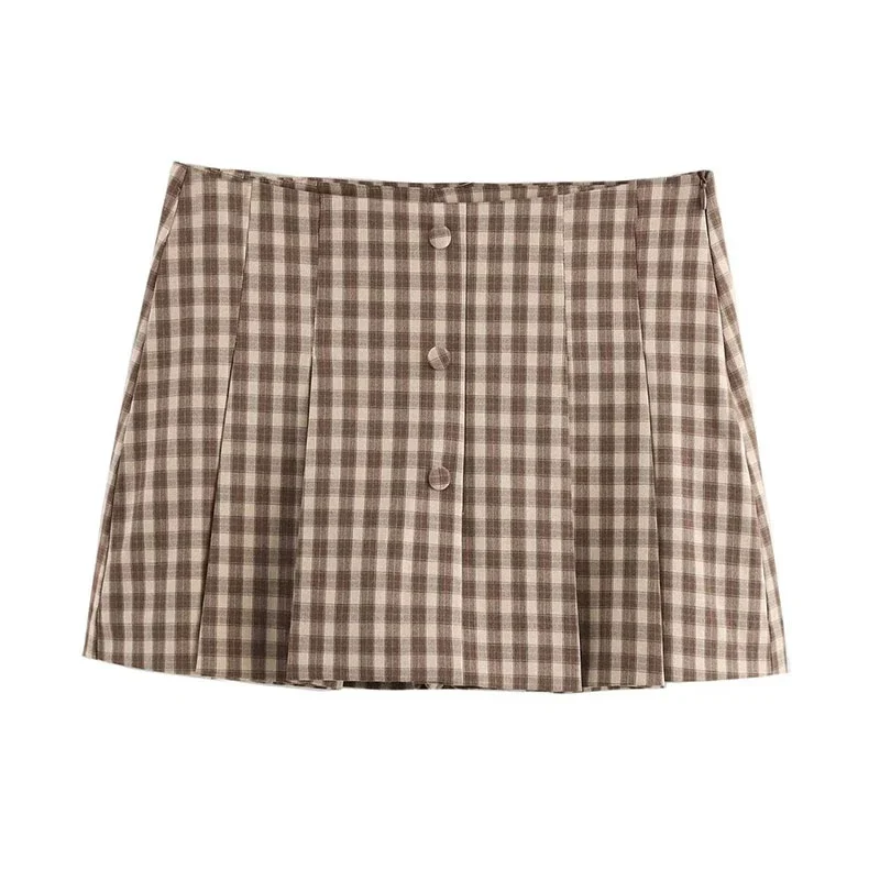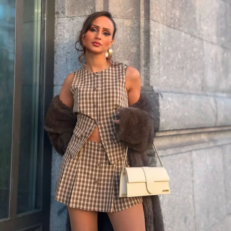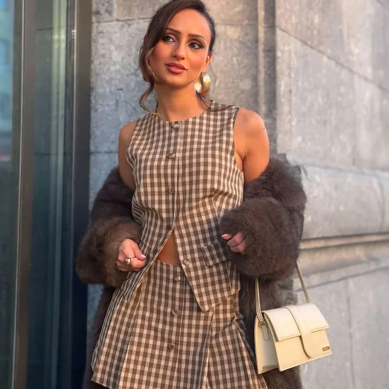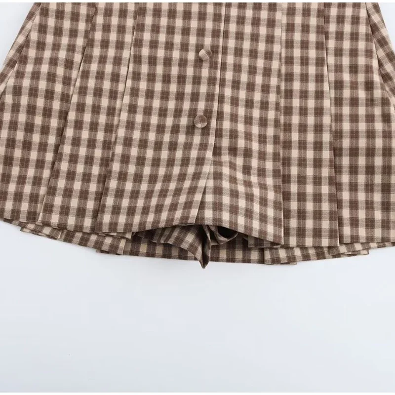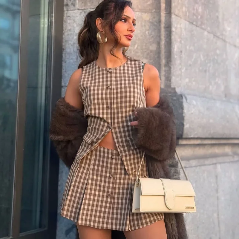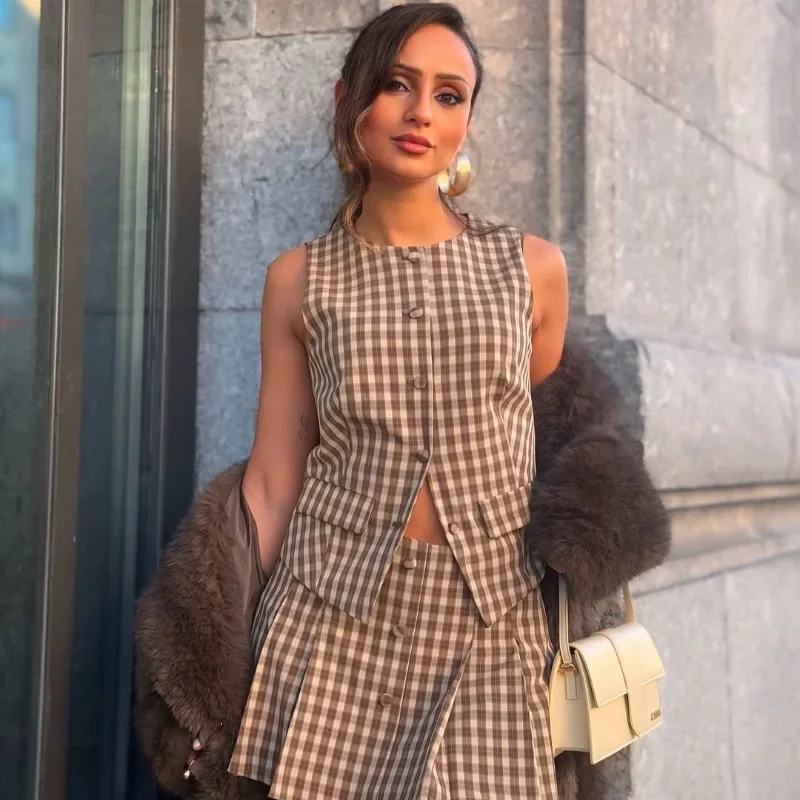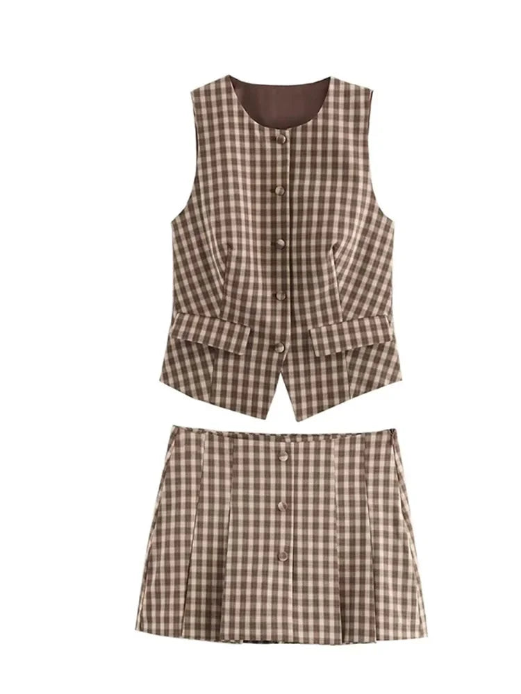 Advbridge Women Vest Mini Skirts Sets Elegant Plaid O-neck Slim Single Breasted Blouse Pleated Skirt Suit Female 2025 Summer Lady Outfits