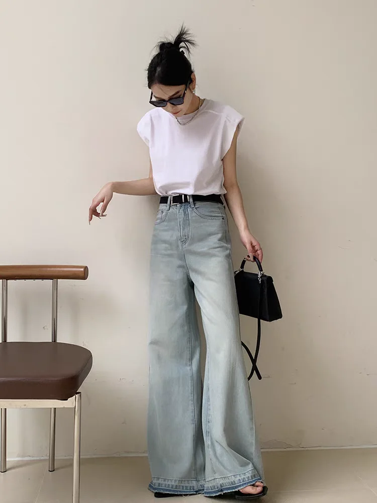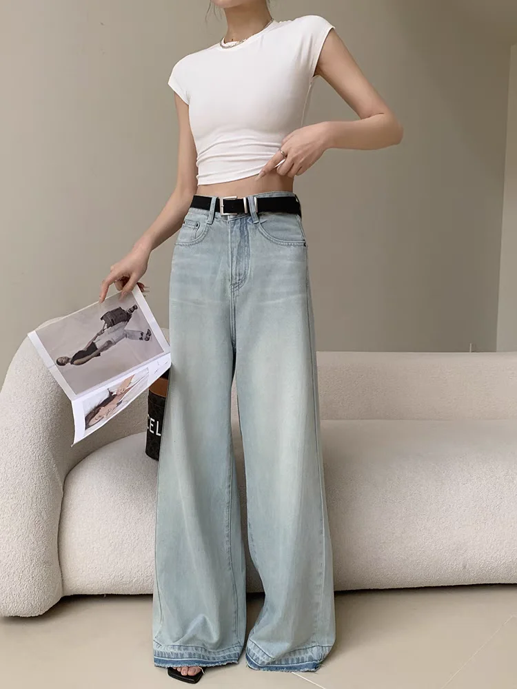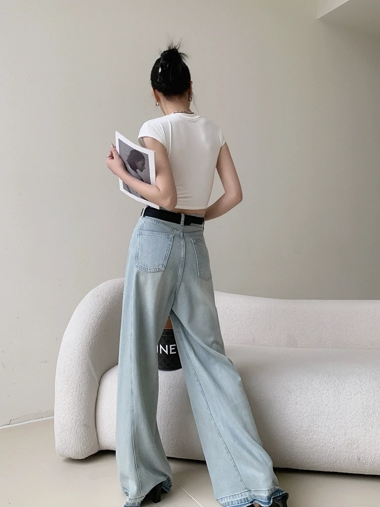 Advbridge Women's Burr Edge Design Wide Leg Jeans Cool Girl High Waisted Wash Blue Loose Thin Pants Female Casual Baggy Denim Trousers