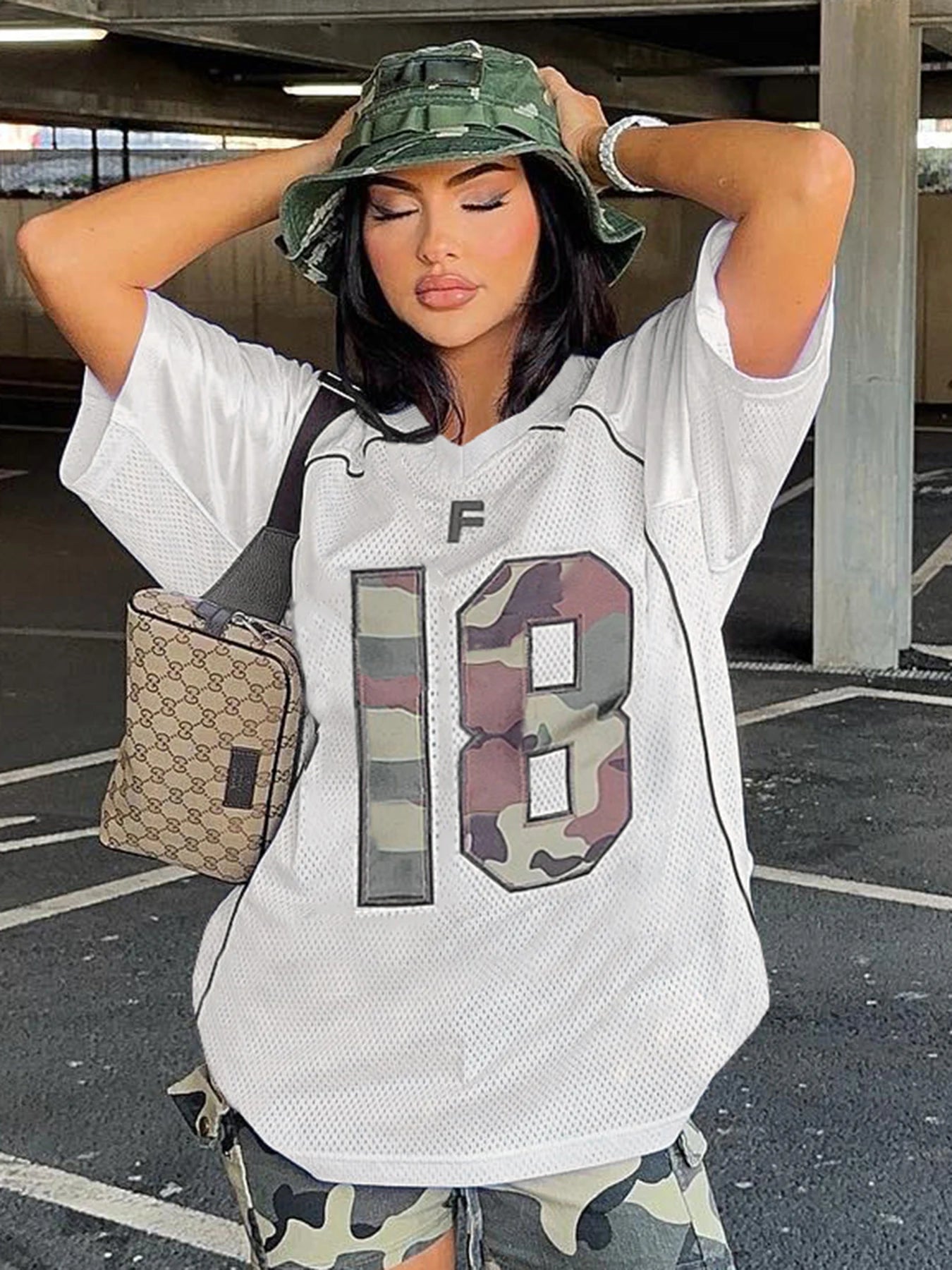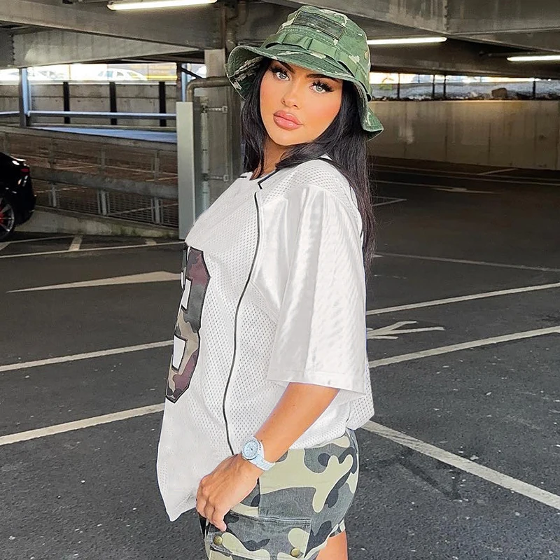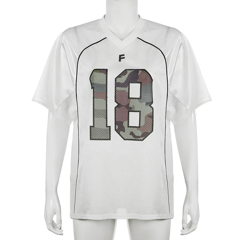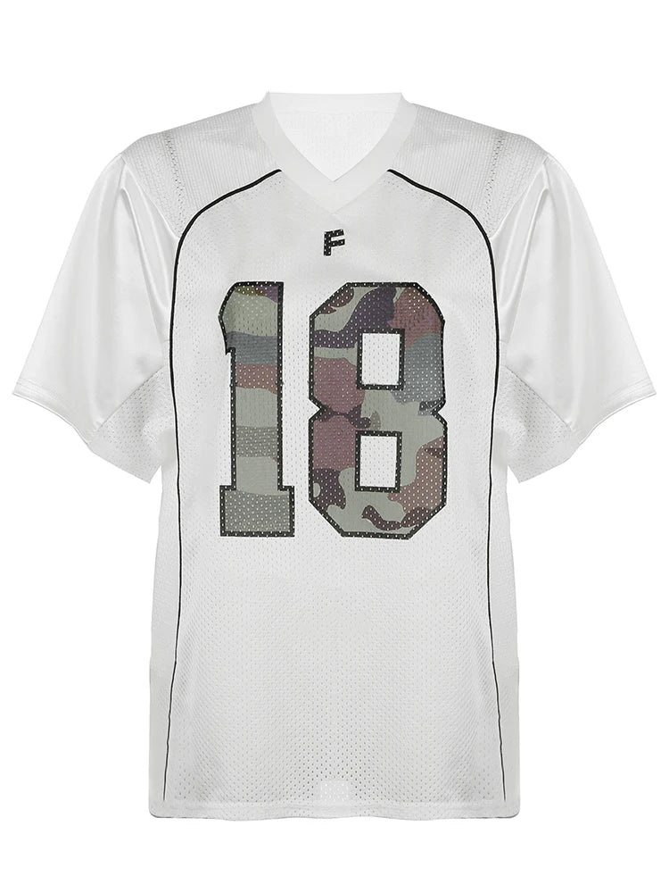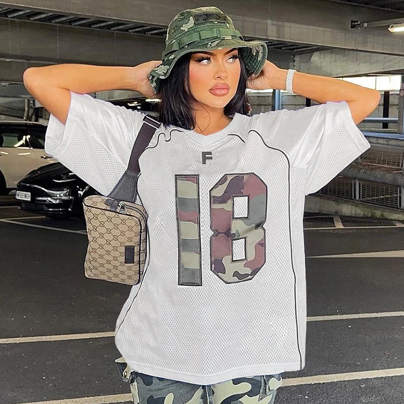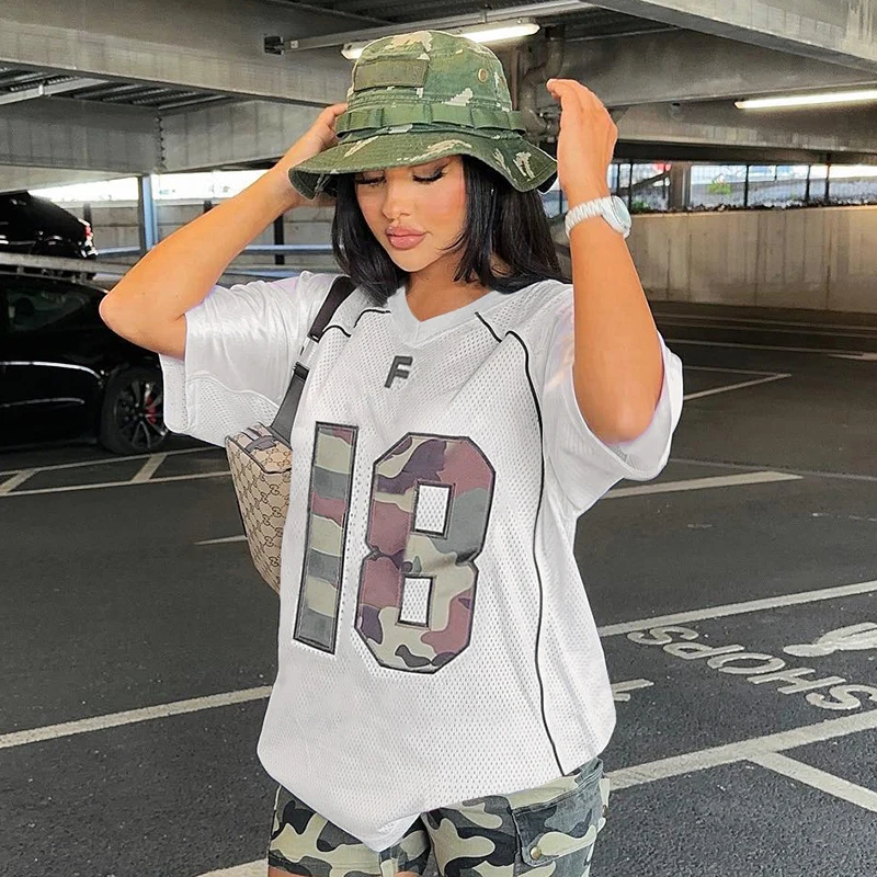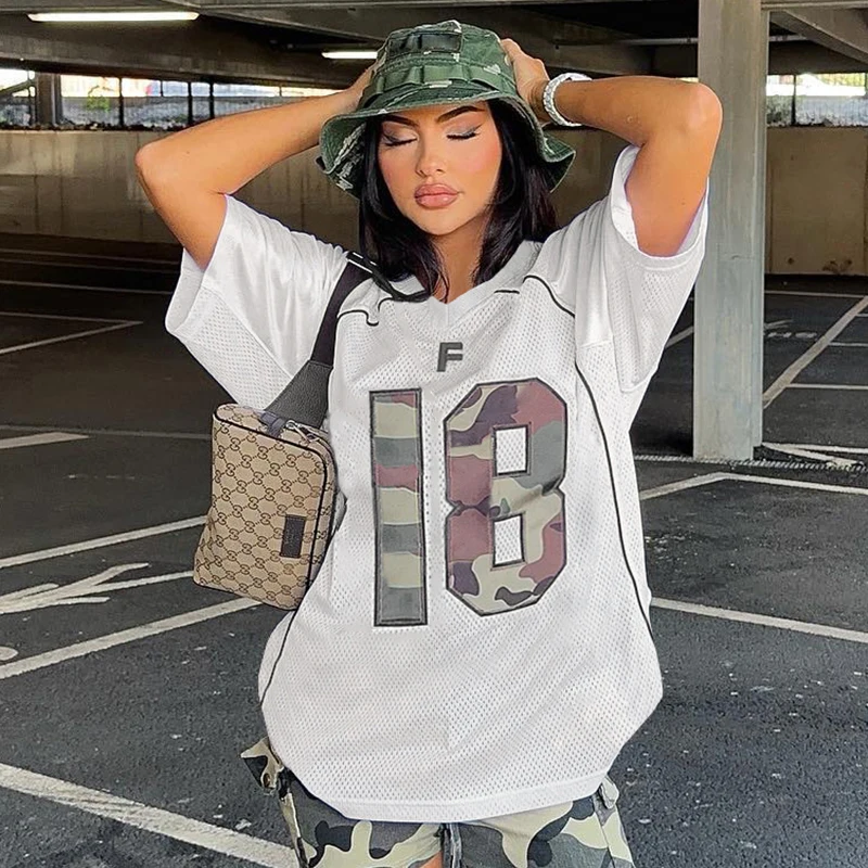 dvbridge Women's Camo No.18 Letter Print Contrast Binding Drop Shoulder Tee Street Hollow Out V Neck Half Sleeve T-shirt Summer
