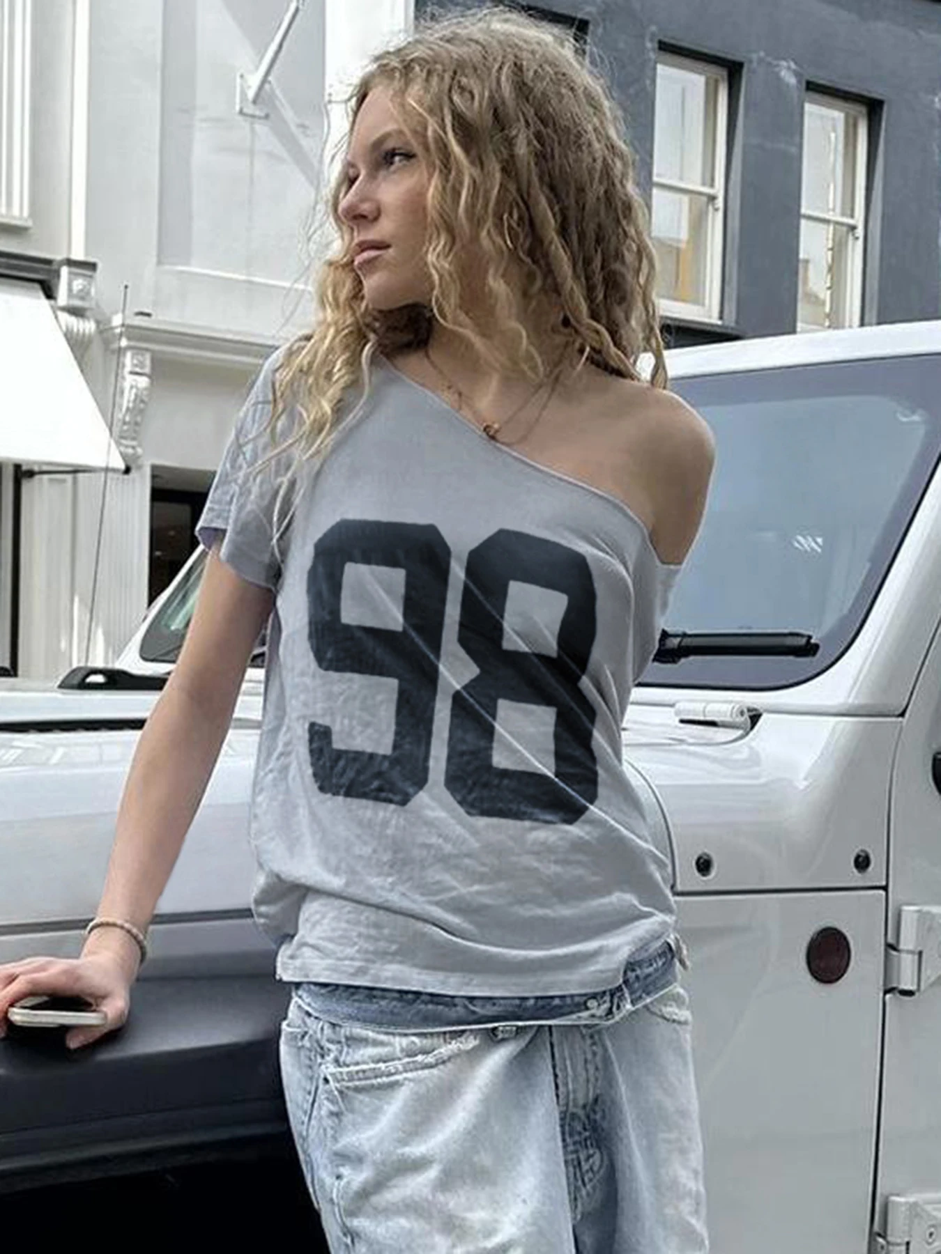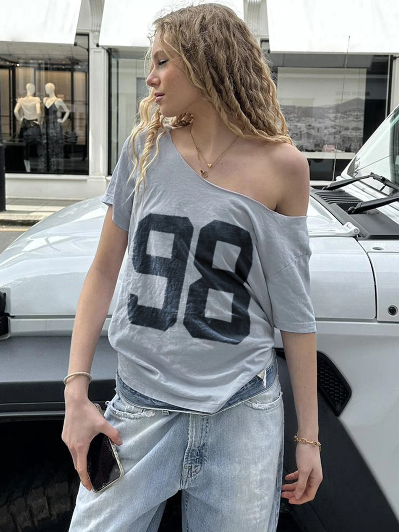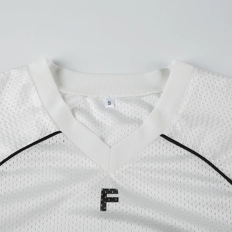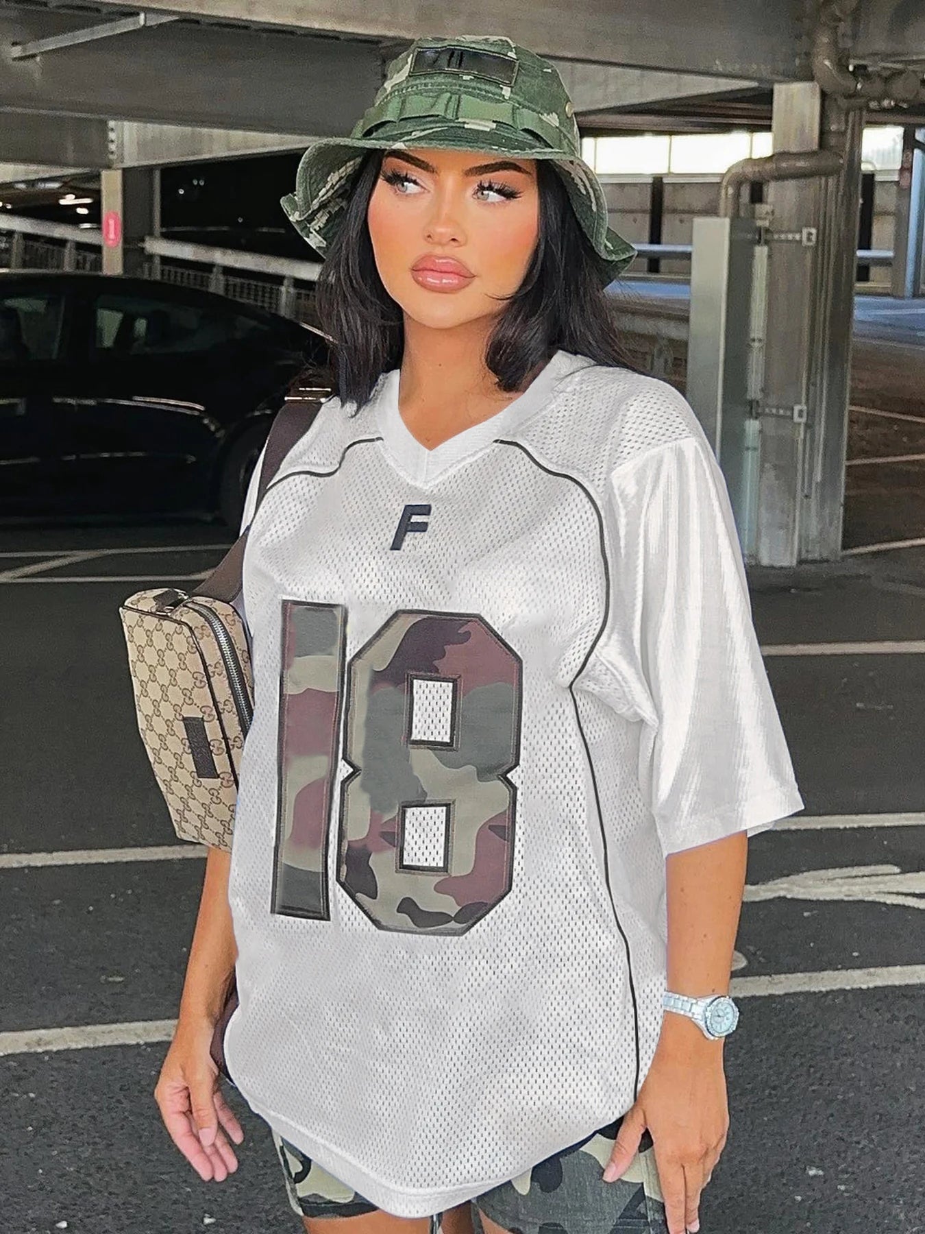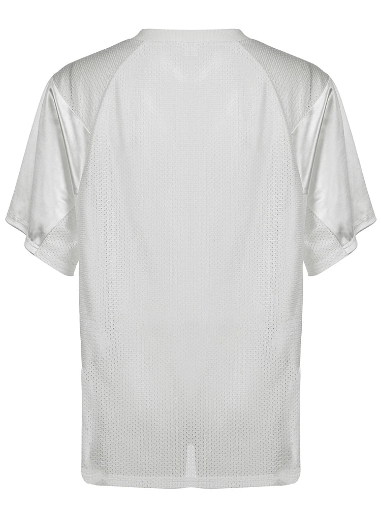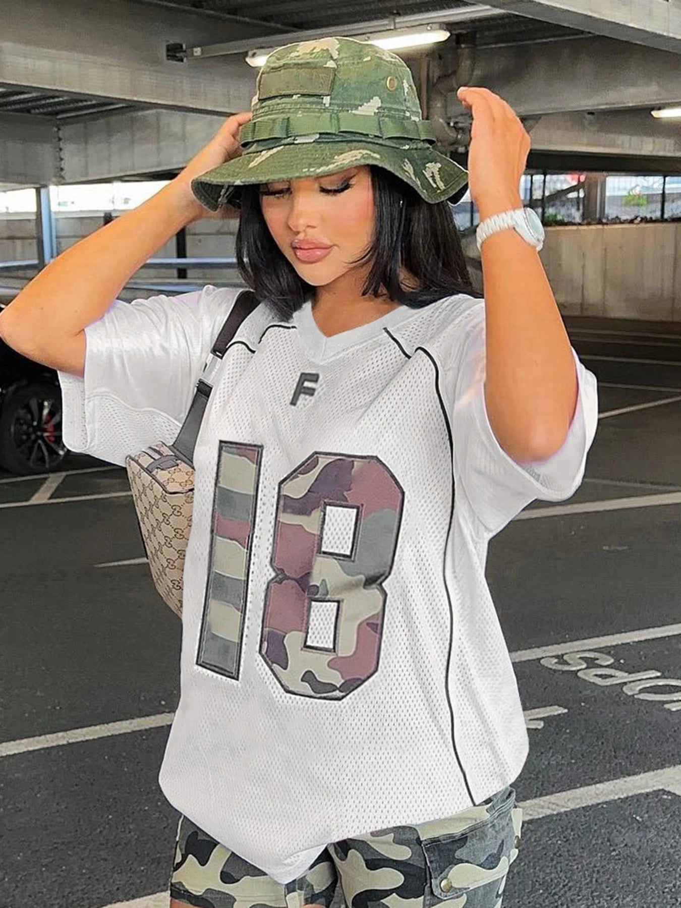 dvbridge Women's Camo No.18 Letter Print Contrast Binding Drop Shoulder Tee Street Hollow Out V Neck Half Sleeve T-shirt Summer