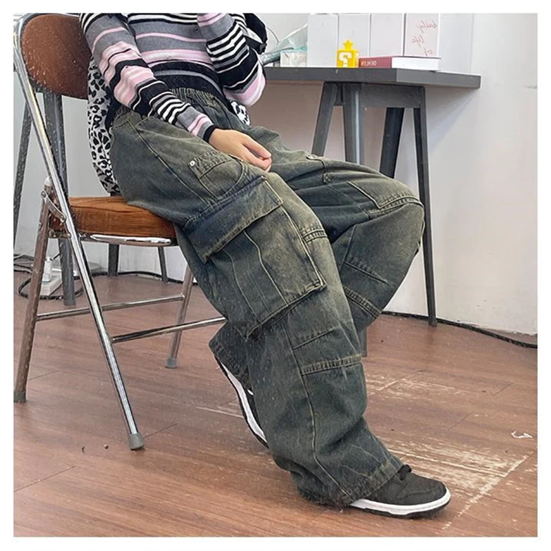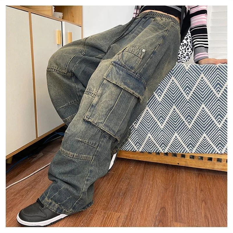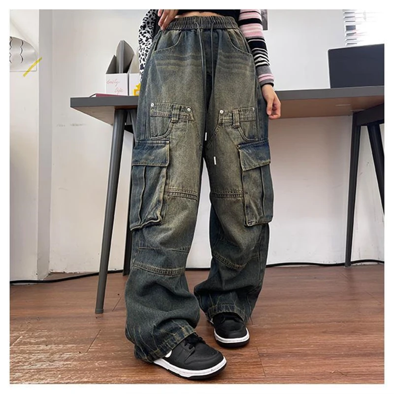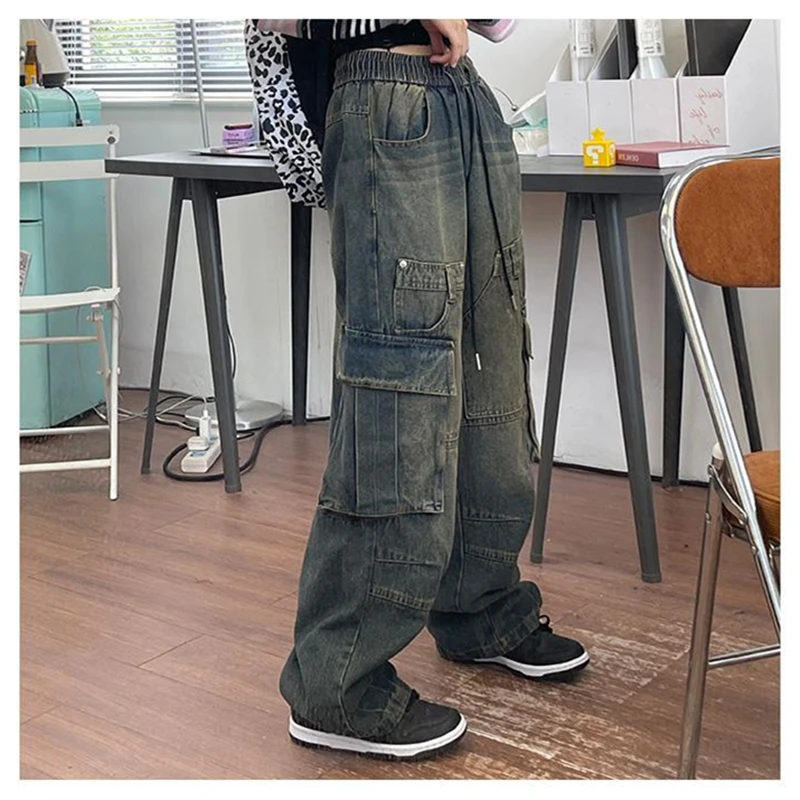 Advbridge Women's Elastic Waist Drawstring Large Pocket Neutral Jeans Cool Girl High Waisted Pants Female Casual Wide Leg Denim Trousers
